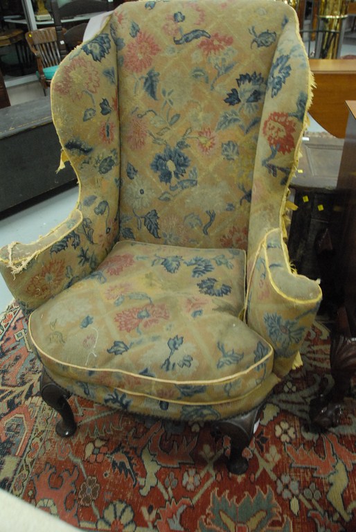 George II upholstered wing chair with early needlepoint upholstery on cabriole legs ending in pad feet. seat ht. 19in. Being sold to benefit a Connecticut Museum.