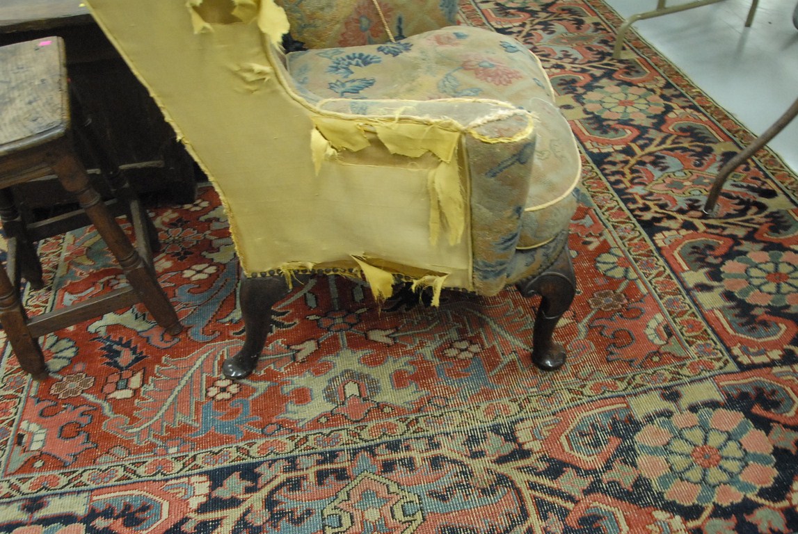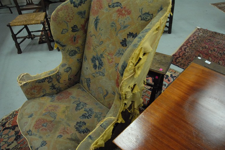 Lot 72: George II upholstered wing chair with early needlepoint upholstery on cabriole legs ending in pad feet. seat ht. 19in. Being sold to…