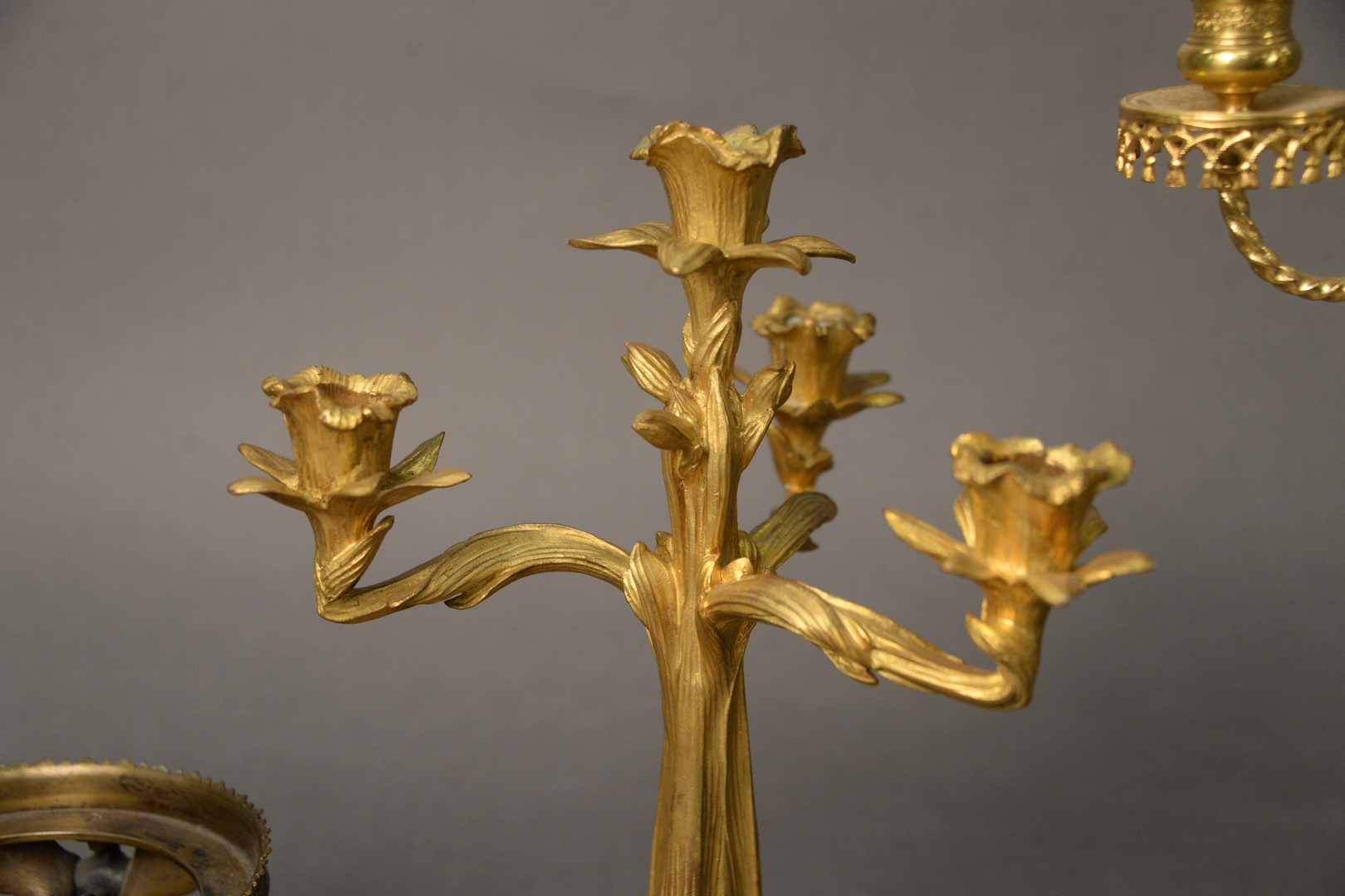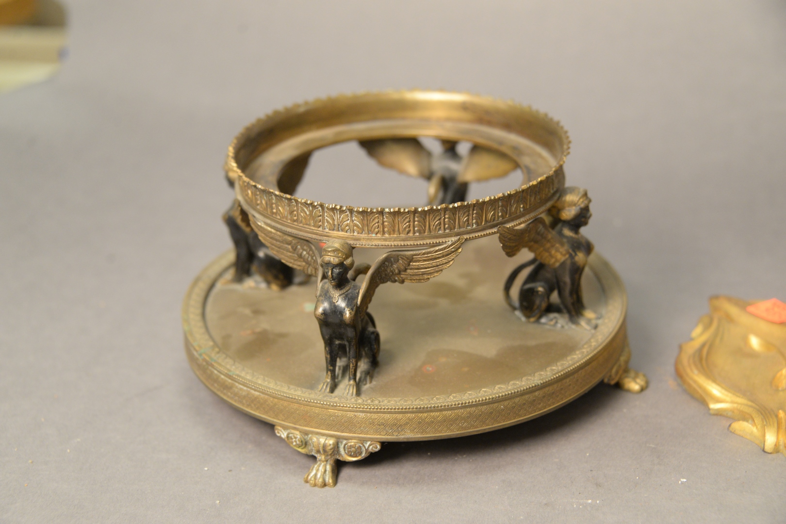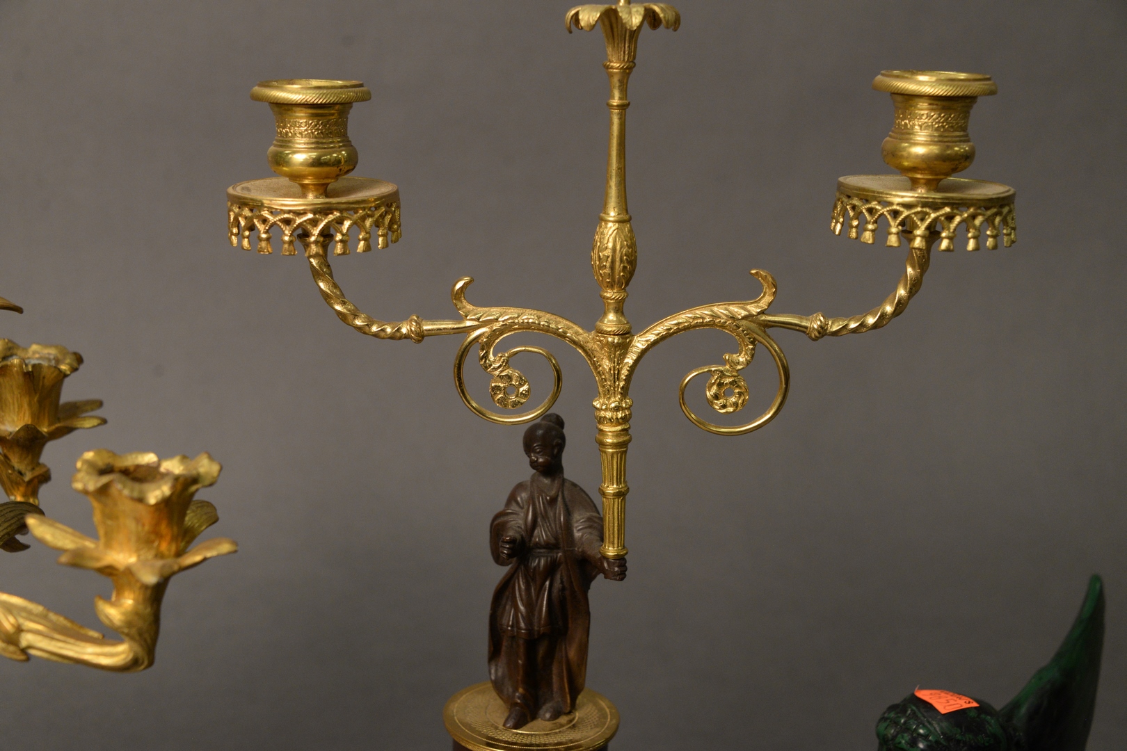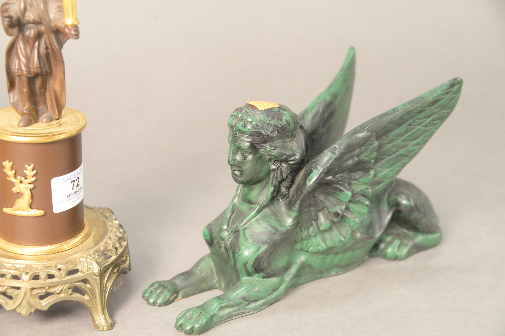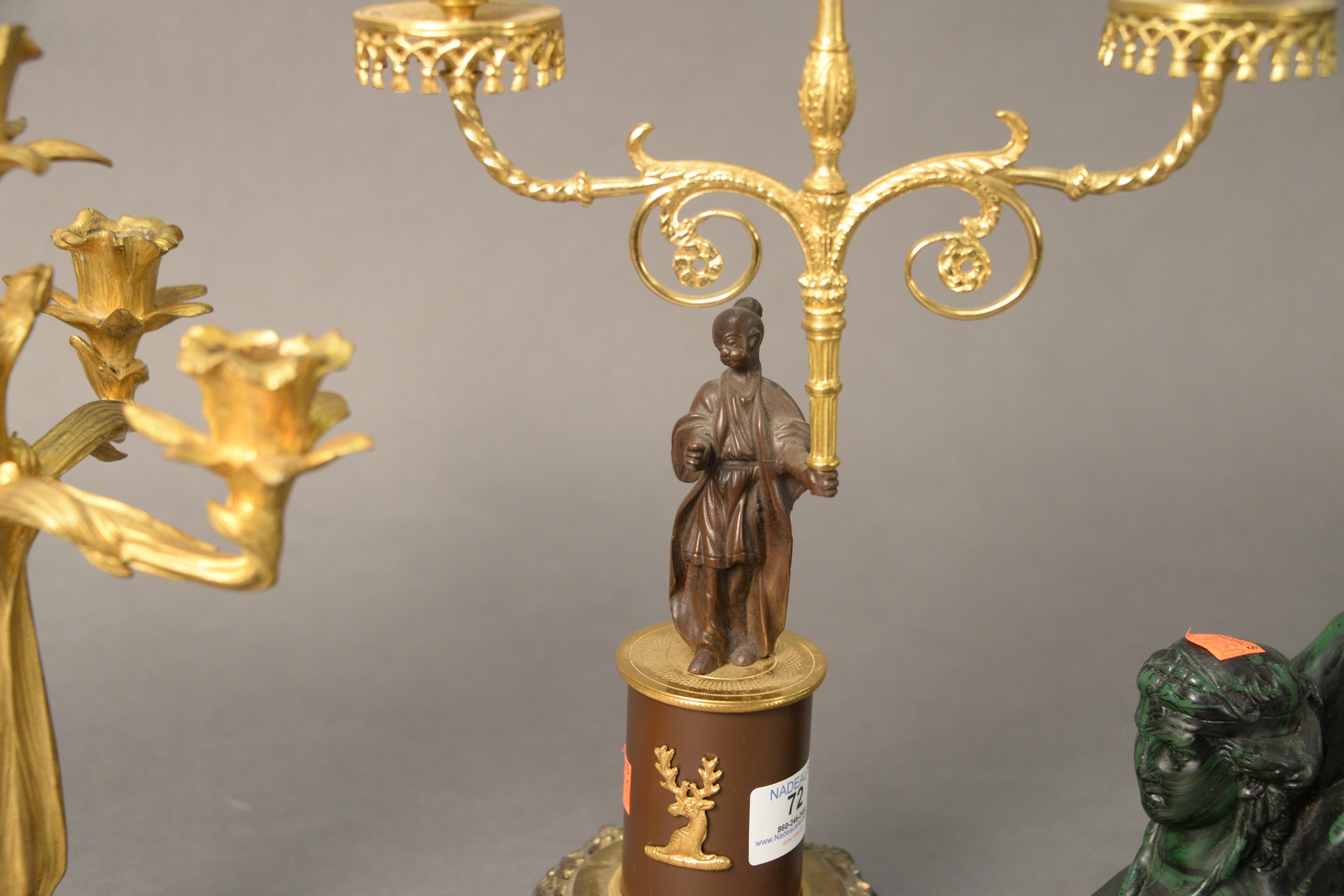 Lot 72: Group of Four French Items, to include two gilt bronze candleholders, one having four arms, the other having two arms an brass empire base along with a green carved, winged figure.