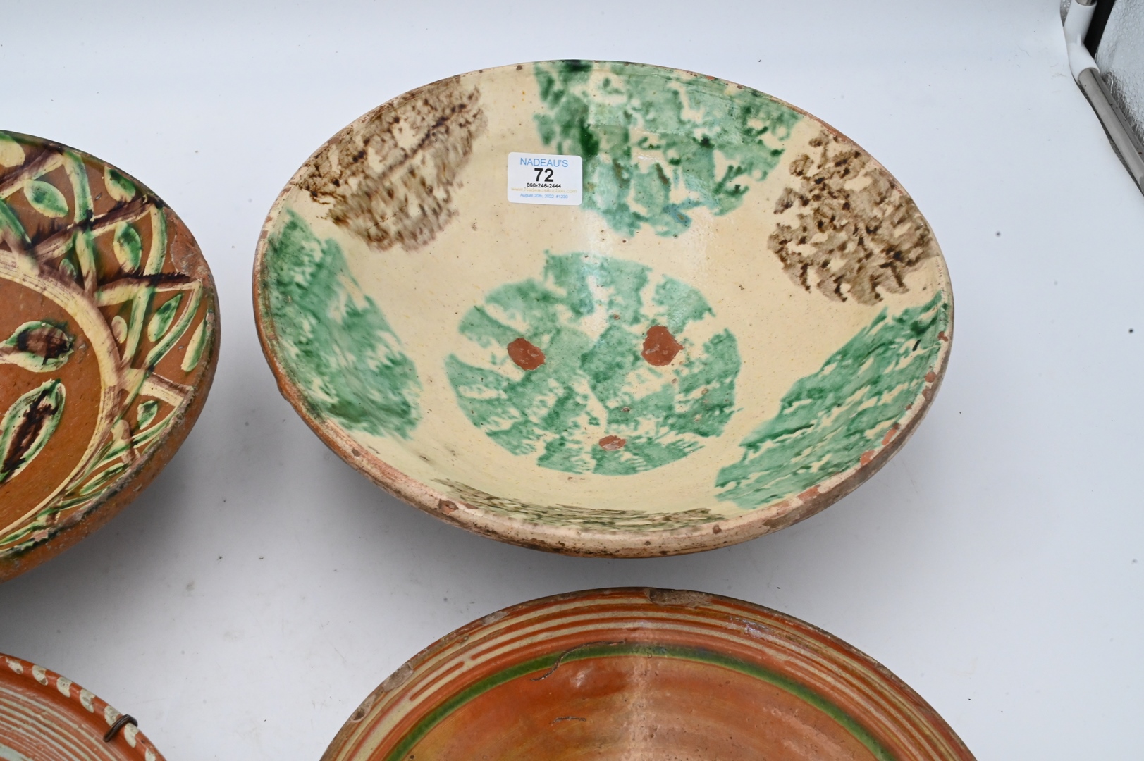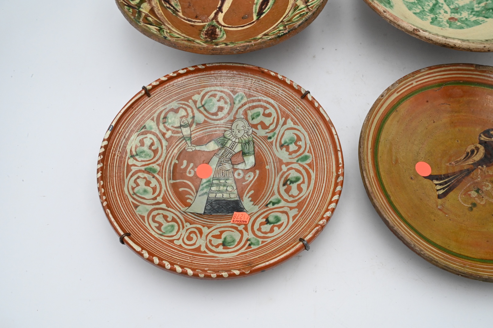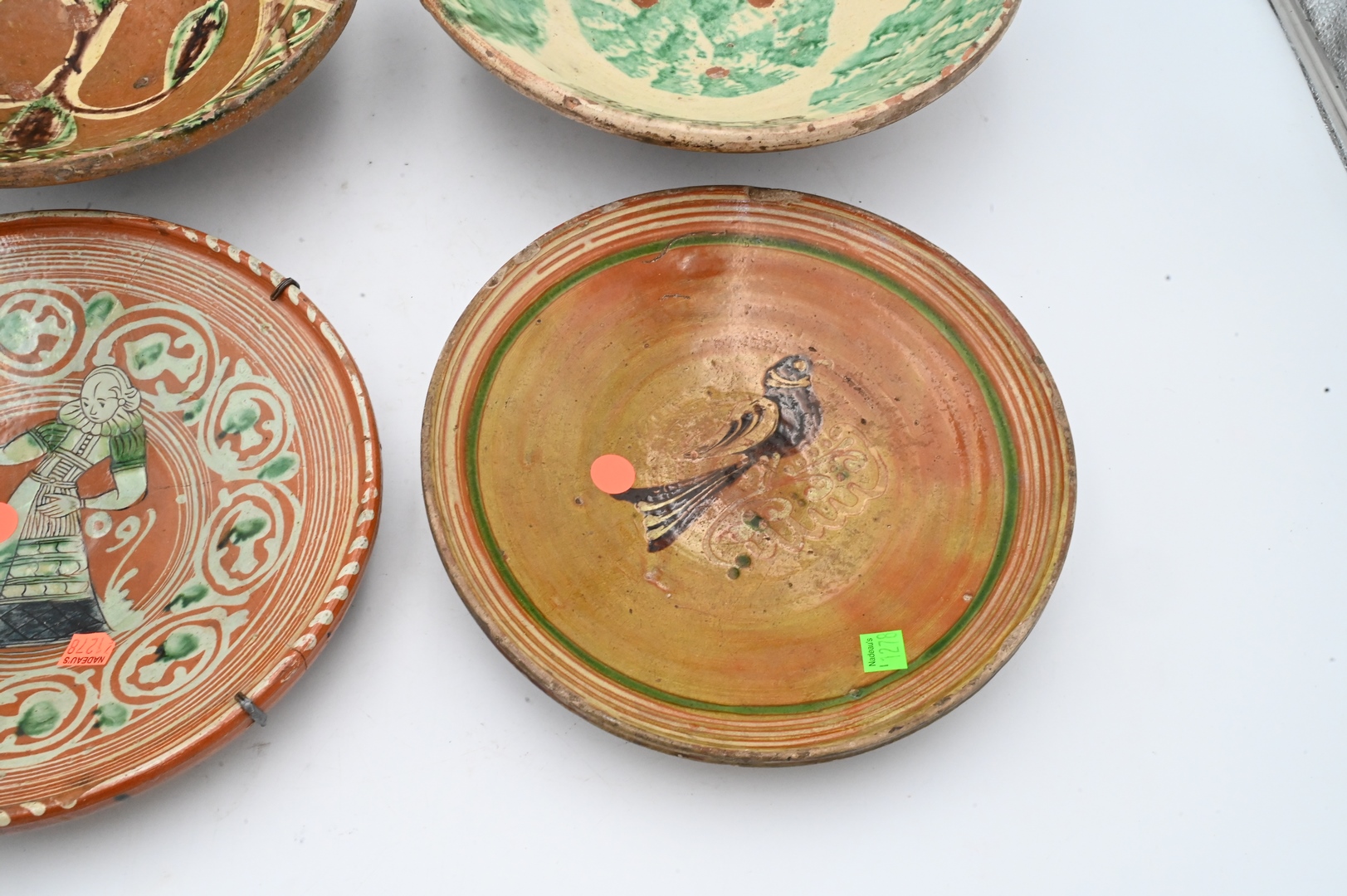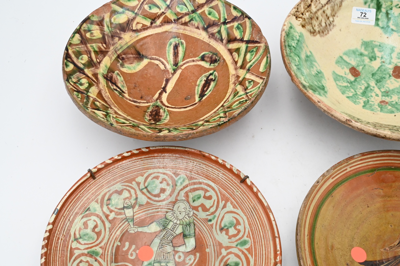 Group of Four Redware Chargers or Bowls, to include one painted with a bird, one of a figure marked 1609, one spatterware bowl, along with a green brown and white bowl; largest diameter 12 inches. Provenance: Estate of Peter Tillou, Litchfield, Connecticut.