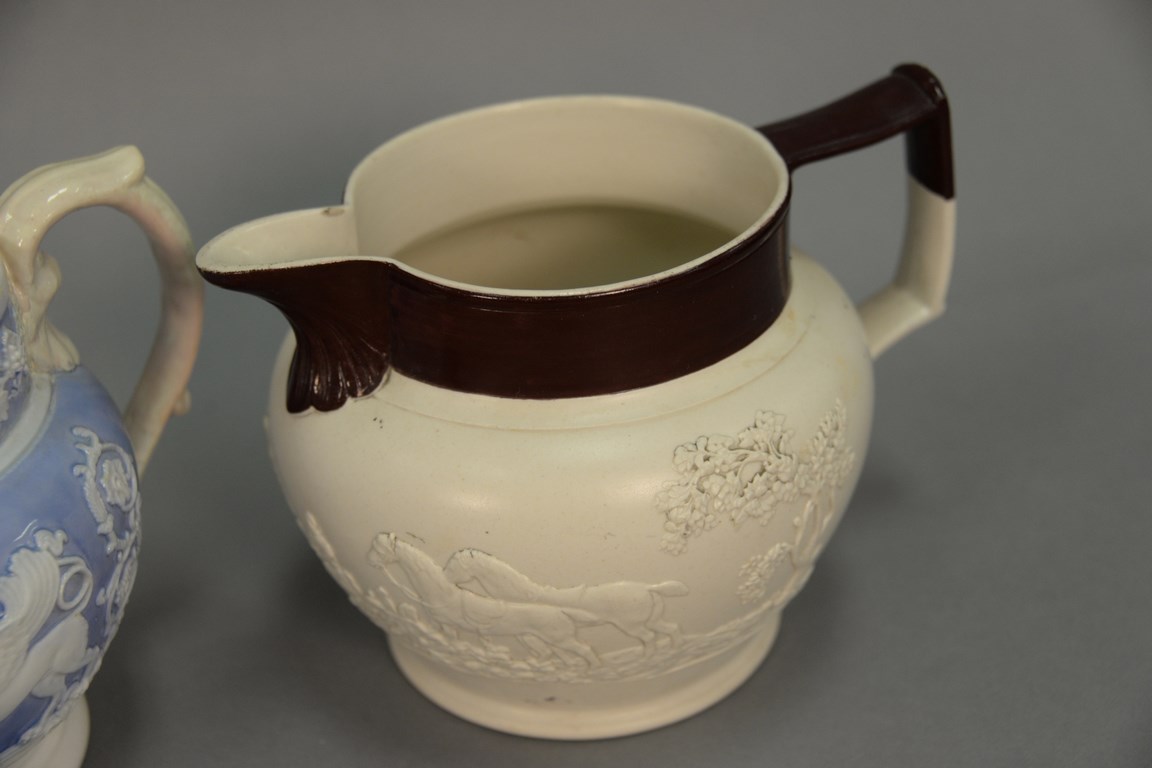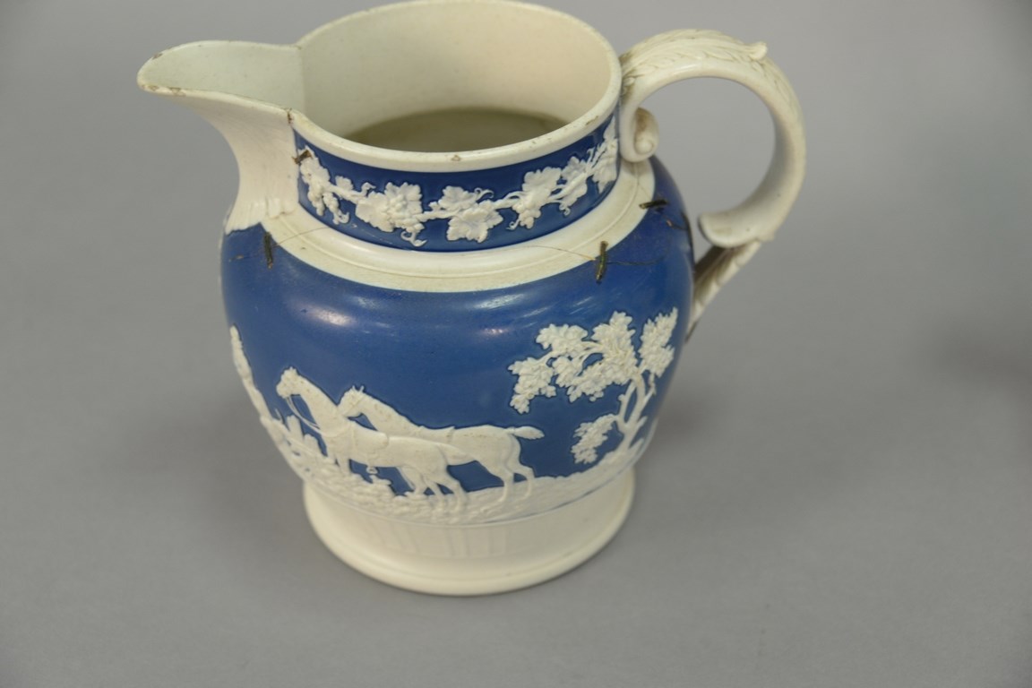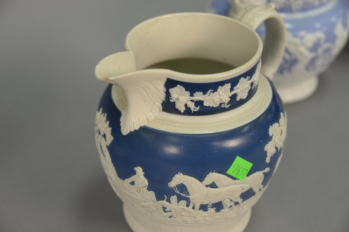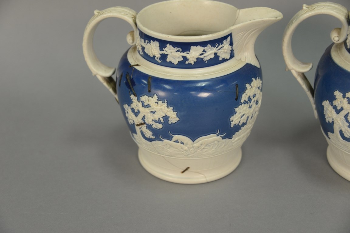 Group of four relief molded pitchers one of blue and white pair as is. ht. 7 1/2 in.