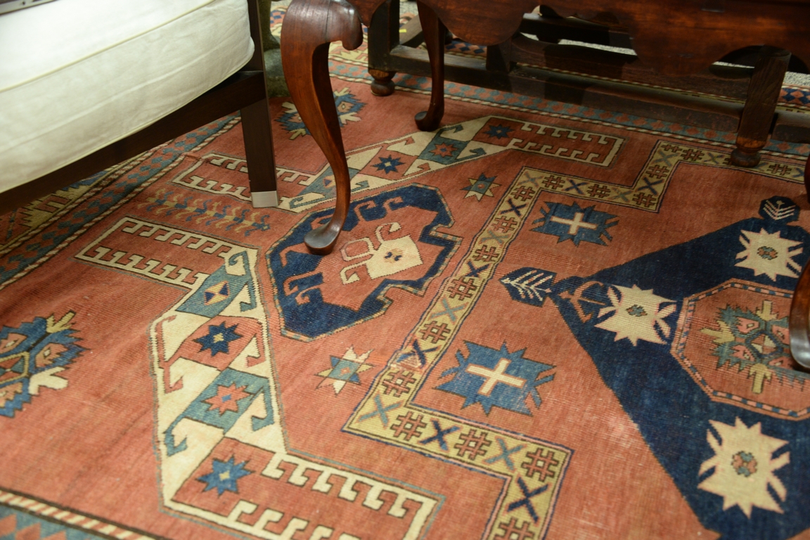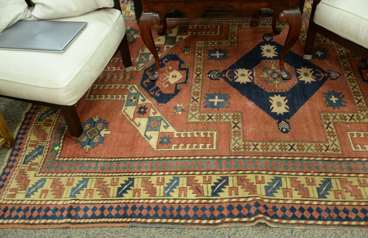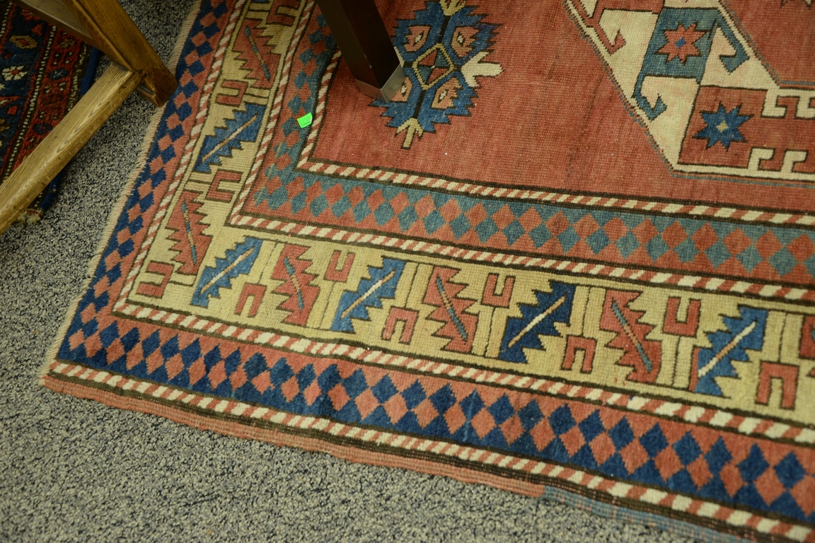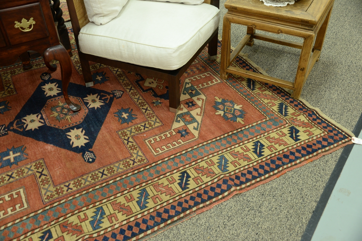 Kazak Oriental rug, even wear, end frayed. 6′ x 8’2.
