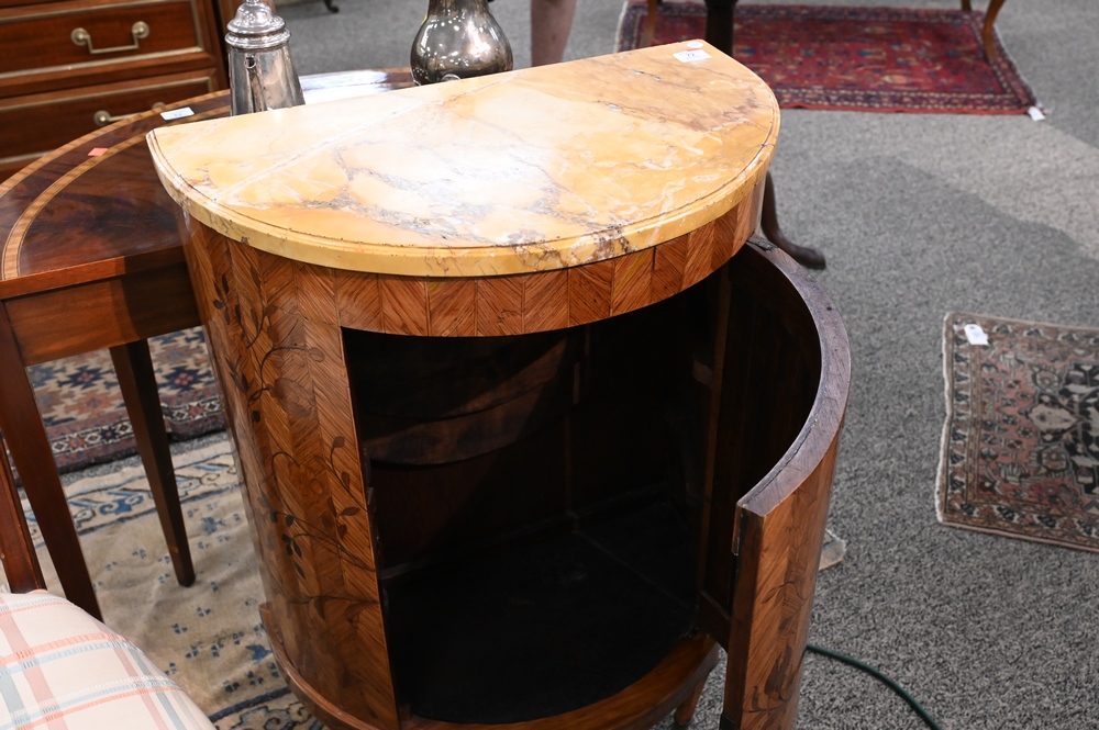 Lot 72: Louis XVI Demilune Cabinet, having marble top and one door, all with floral inlays, height 39 1/2 inches, top 15″ x 25″.