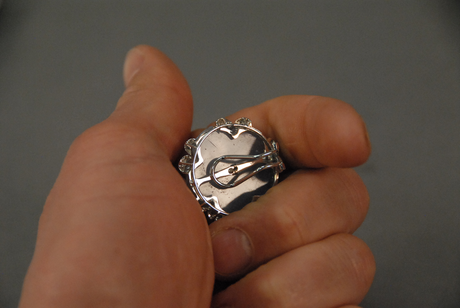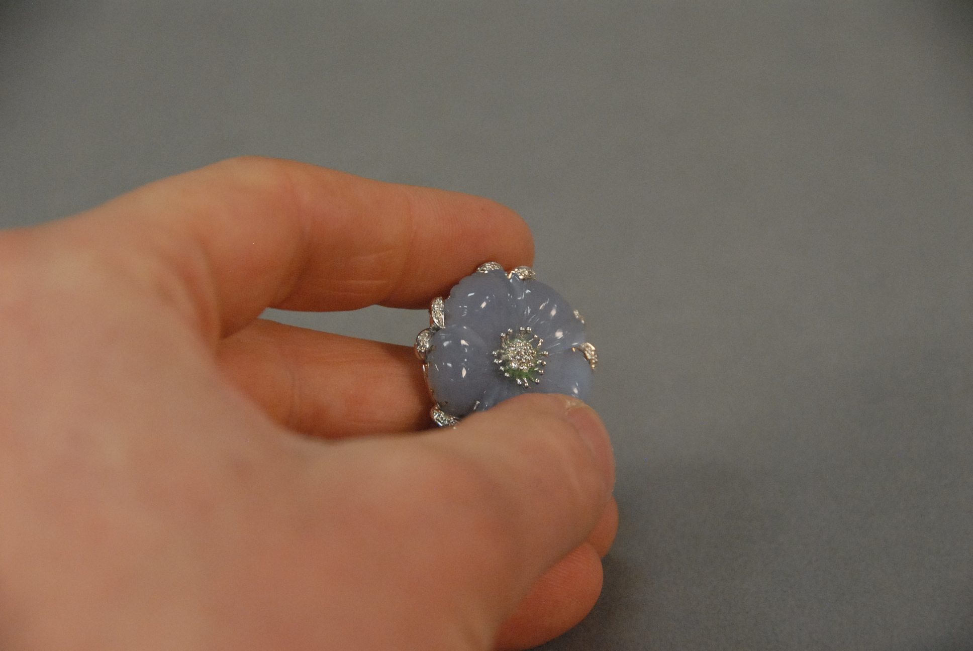 Lot 72: Pair of Chalcedony flower ear clips mounted in 18K white gold center with seven small diamonds.