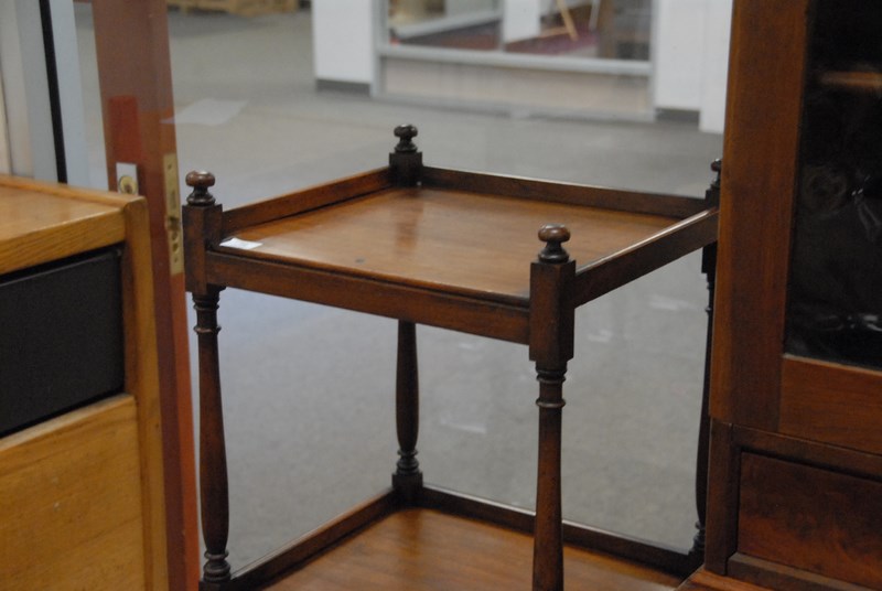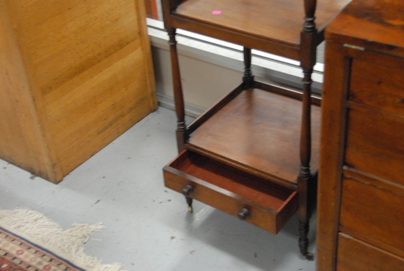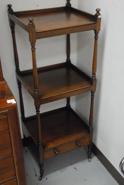 Pair of George IV mahogany etageres having three shelves and one drawer on turned legs, 19th century, ht. 46in. wd. 18in. dp. 16in.