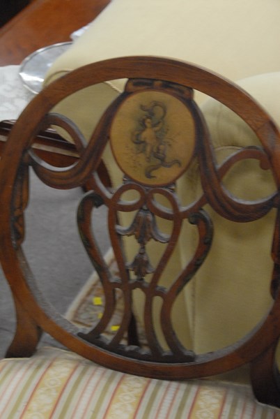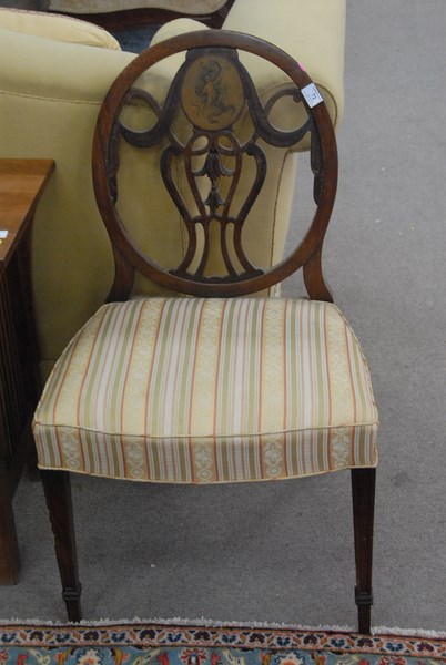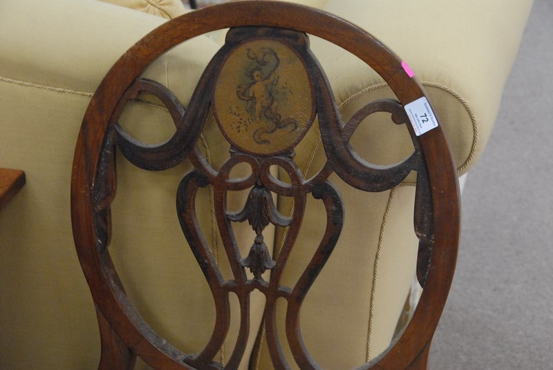 Lot 72: Pair of wheel back chairs with painted oval panel.