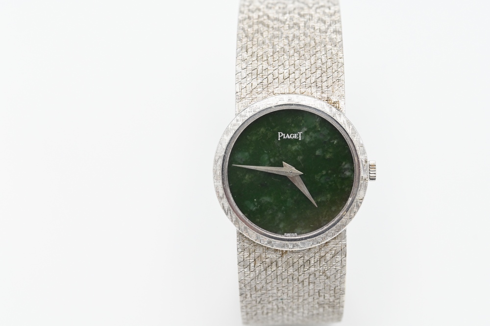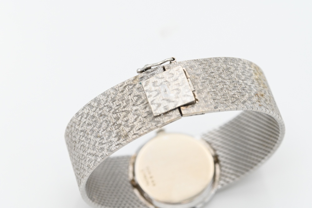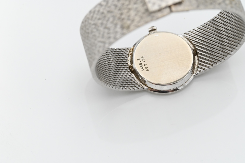 Lot 72: Piaget 18 Karat White Gold Ladies Wristwatch, having brushed mesh band, interior 54 millimeters, diameter 23.9 millimeters, total we…