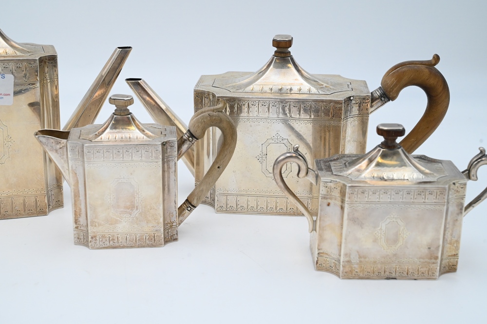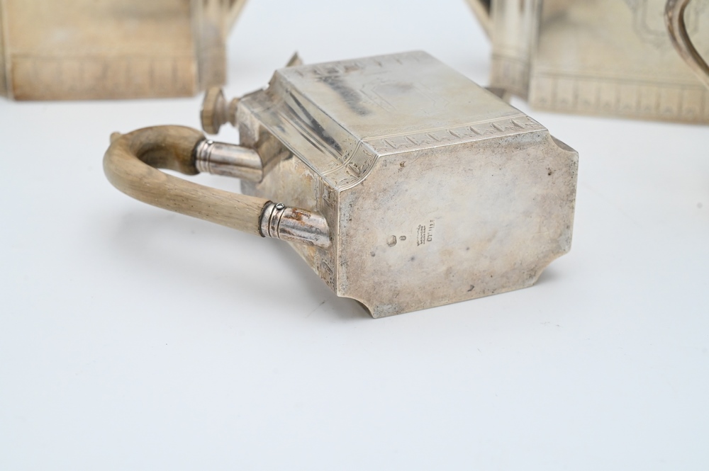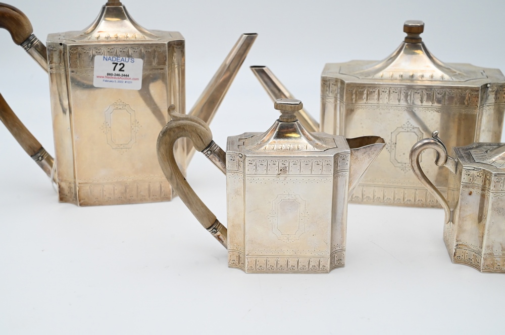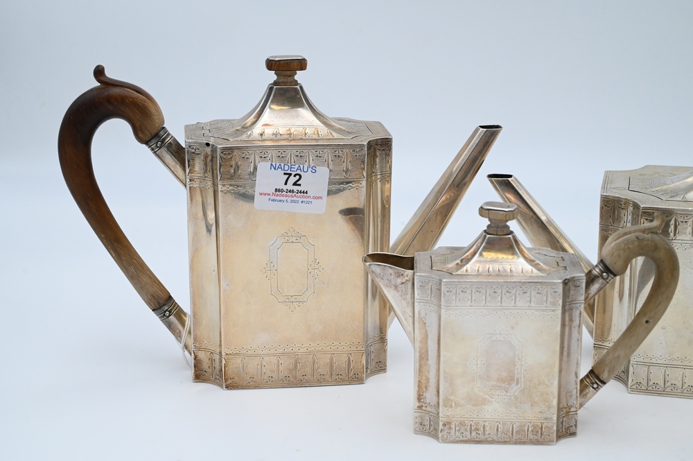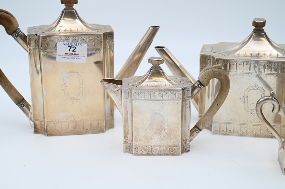 Lot 72: Portuguese Silver Four Piece Tea and Coffee Service, 20th century, to include cream pitcher and sugar bowl, height of coffee pot 7.5 inches, 76.6 t.oz.