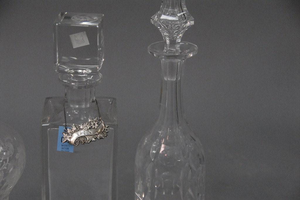 Lot 72: Three crystal decanters with stoppers, one with sterling silver Gin tag