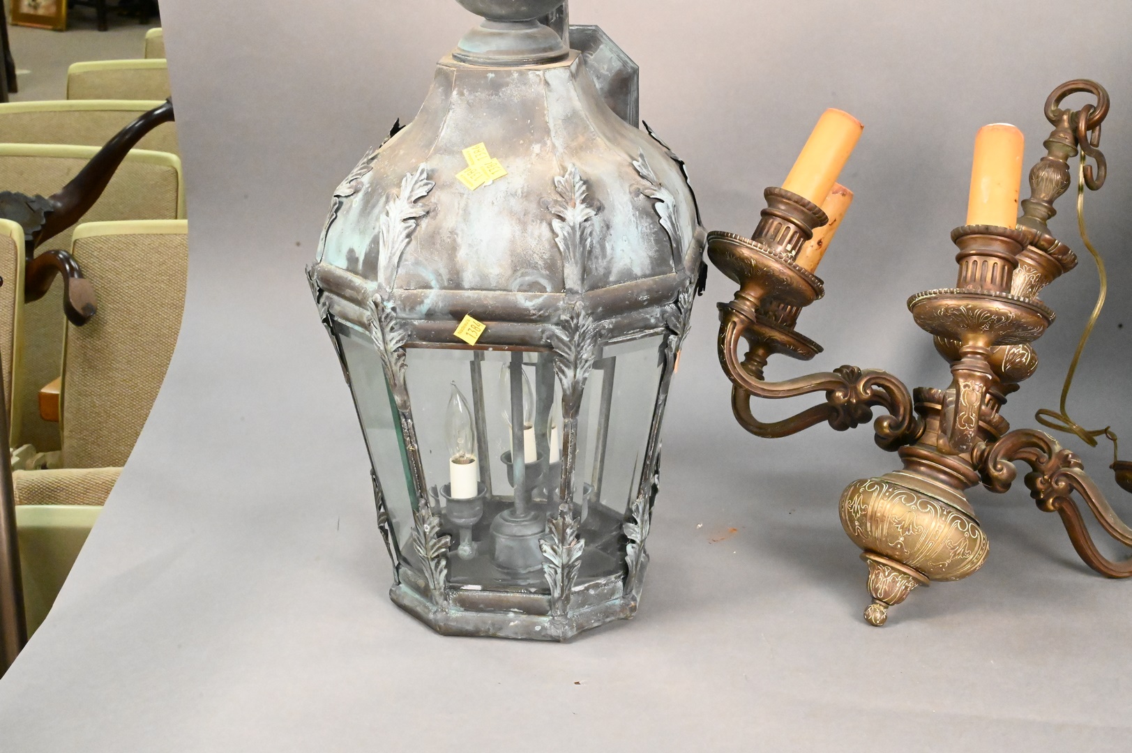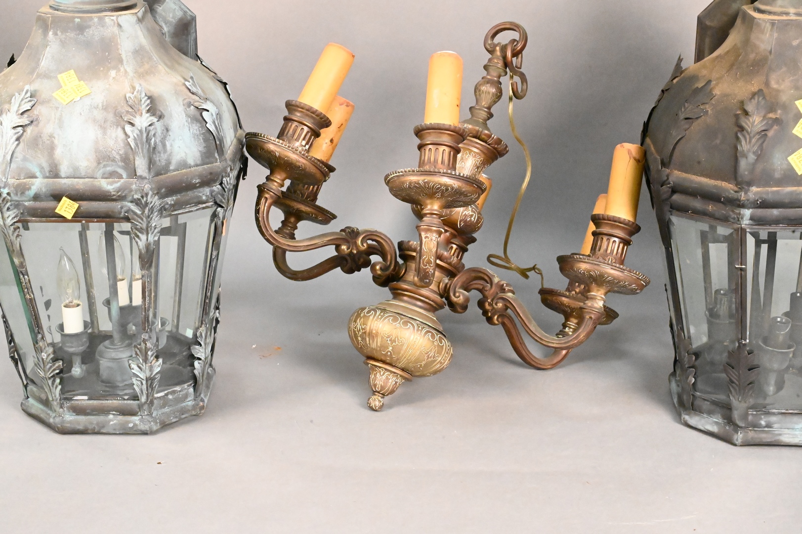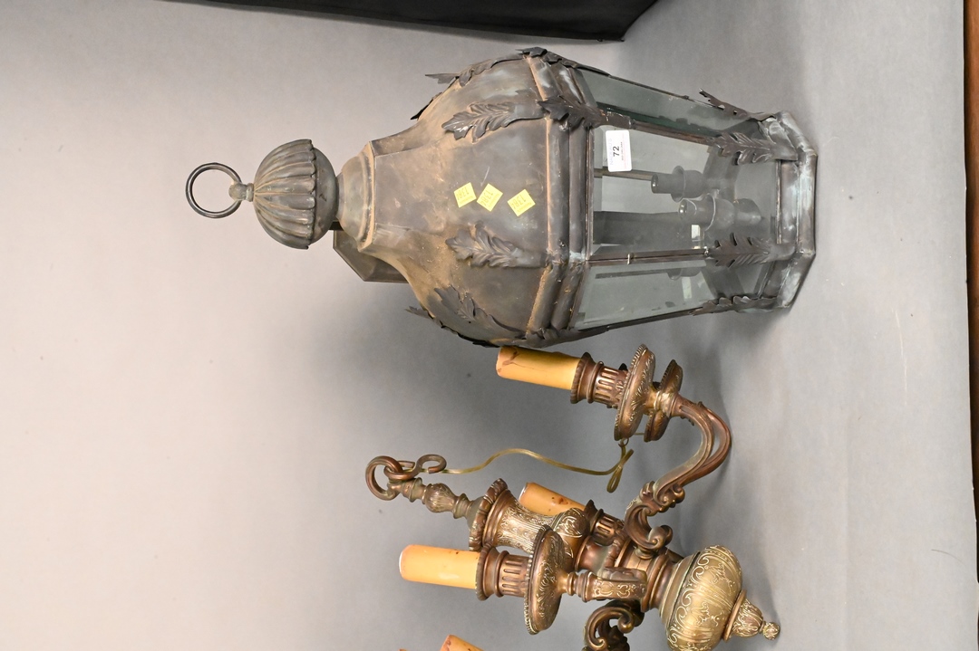 Three Hanging Lights, pair of outdoor wall lights, eight sided with beveled glass, along with an iron hanging light, with ceramic well having dragon on it, height 25 inches.