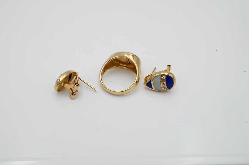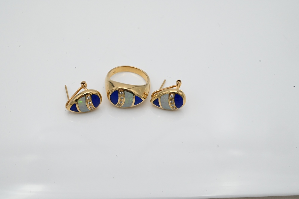 Lot 72: Three Piece 14 Karat Gold Earring and Ring Set, each with opal, diamond and marcasite, size 6 1/8. 10.9 grams.