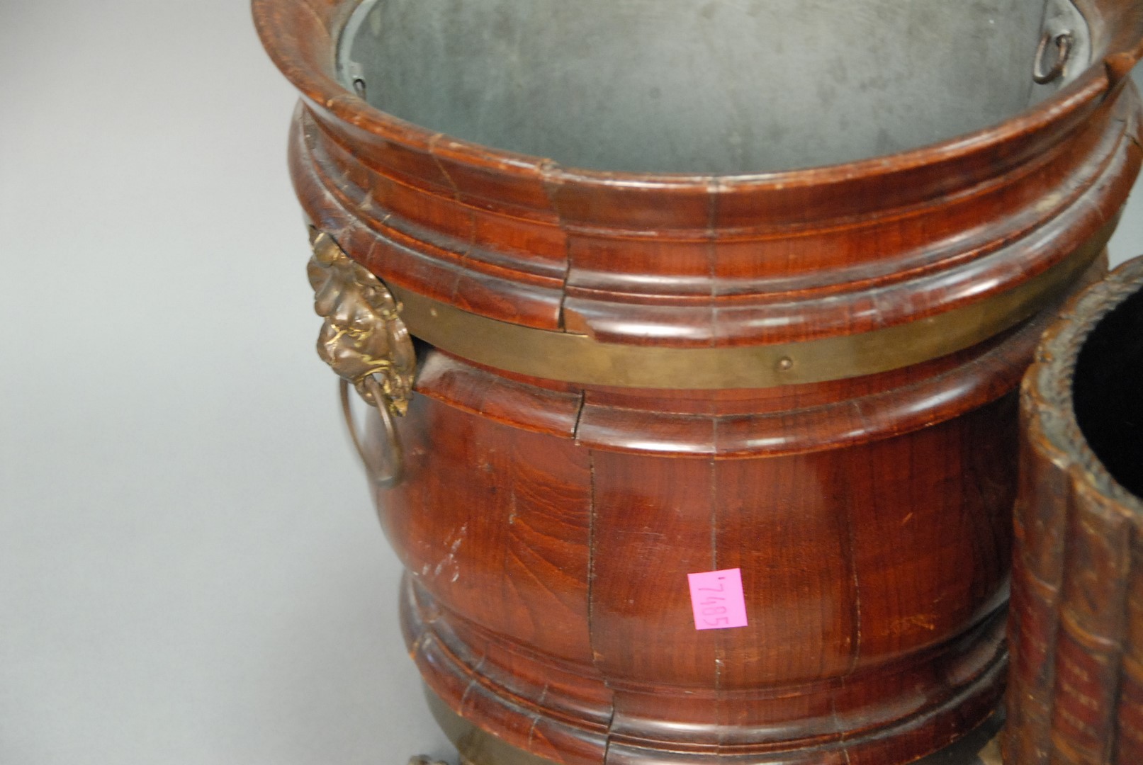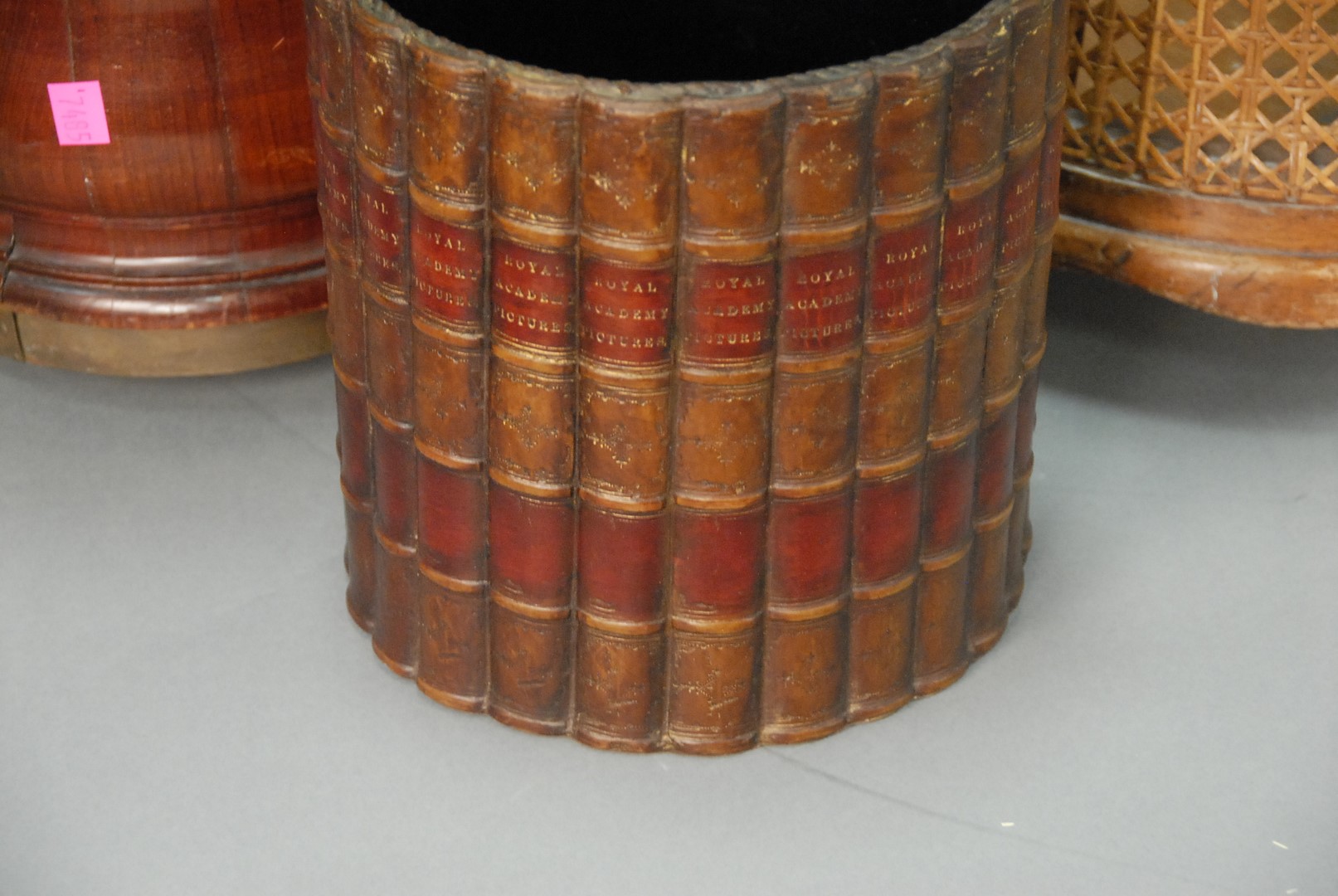 Three piece lot including wastepaper basket with faux leather book spine basket, carved wood wine cooler with metal liner, and caned wastepaper basket. ht. 8 3/4 in. ht. 14 in. ht. 11 3/4 in.