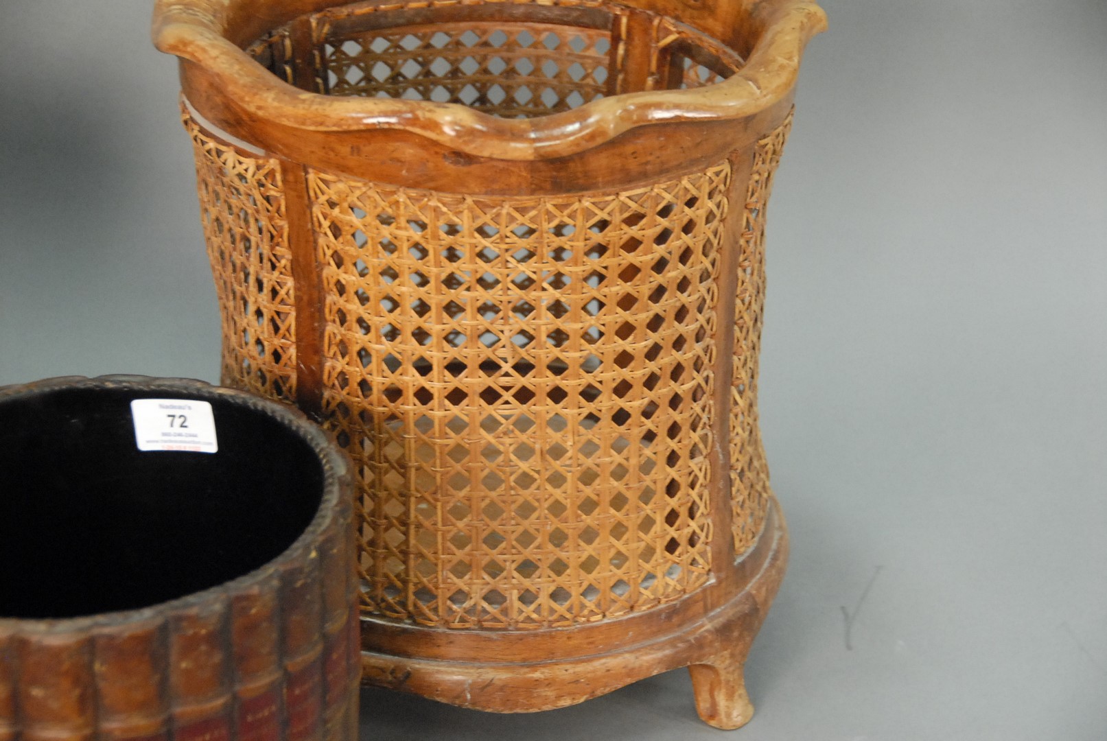 Lot 72: Three piece lot including wastepaper basket with faux leather book spine basket, carved wood wine cooler with metal liner, and caned…