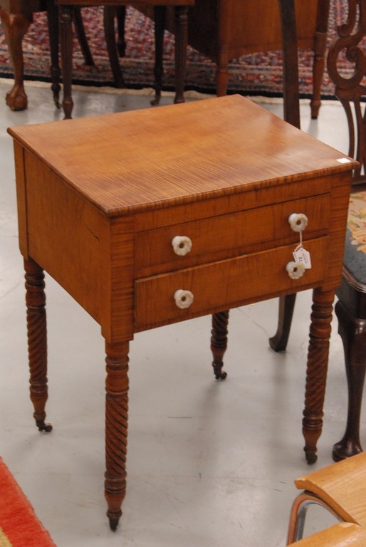 Tiger maple Sheraton stand having two drawers with opalescent glass pulls on spiral turned legs ending in brass capped feet with wheels, circa 1830-1840. ht. 28in. top: 18 x 21
