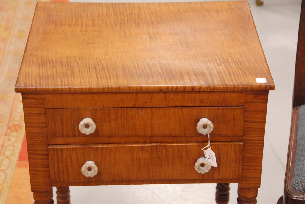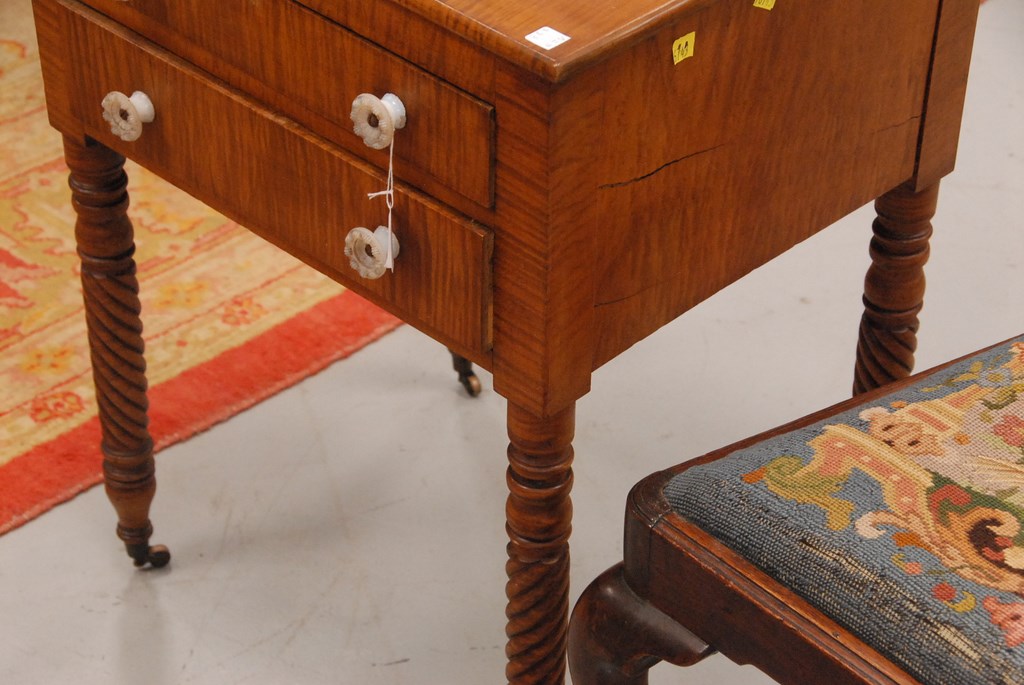 Lot 72: Tiger maple Sheraton stand having two drawers with opalescent glass pulls on spiral turned legs ending in brass capped feet with whe…