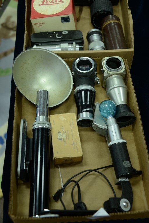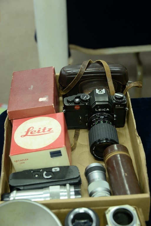 Two box lots: Camera group lot to include E. Leitz fan type flash with cord, E. Leitz flash with film door attachment, Elmar 9cm/4 lens, E. Leitz Visoflex 5m, K. Muller jr. reproflex 5m, 5k Xenar 3.5cm/3.5 5m, Leica M case, and a Leica R3 Electronic with 35-135 lens and motor winder R.