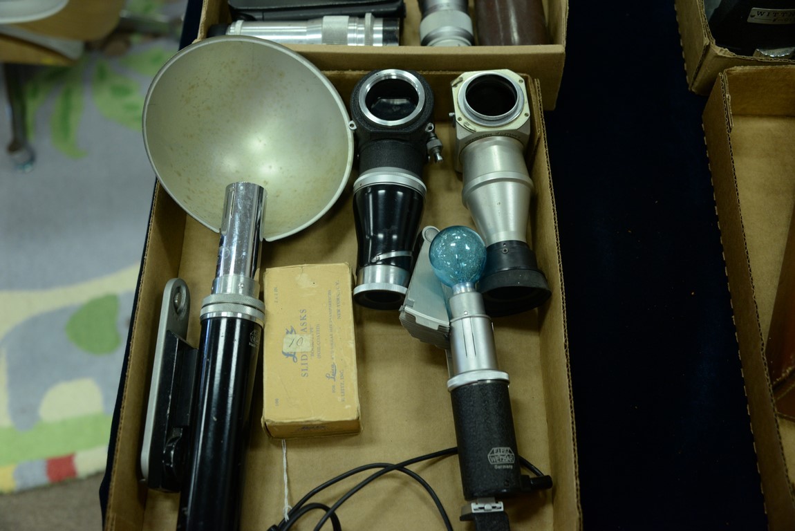 Lot 72: Two box lots: Camera group lot to include E. Leitz fan type flash with cord, E. Leitz flash with film door attachment, Elmar 9cm/4 l…