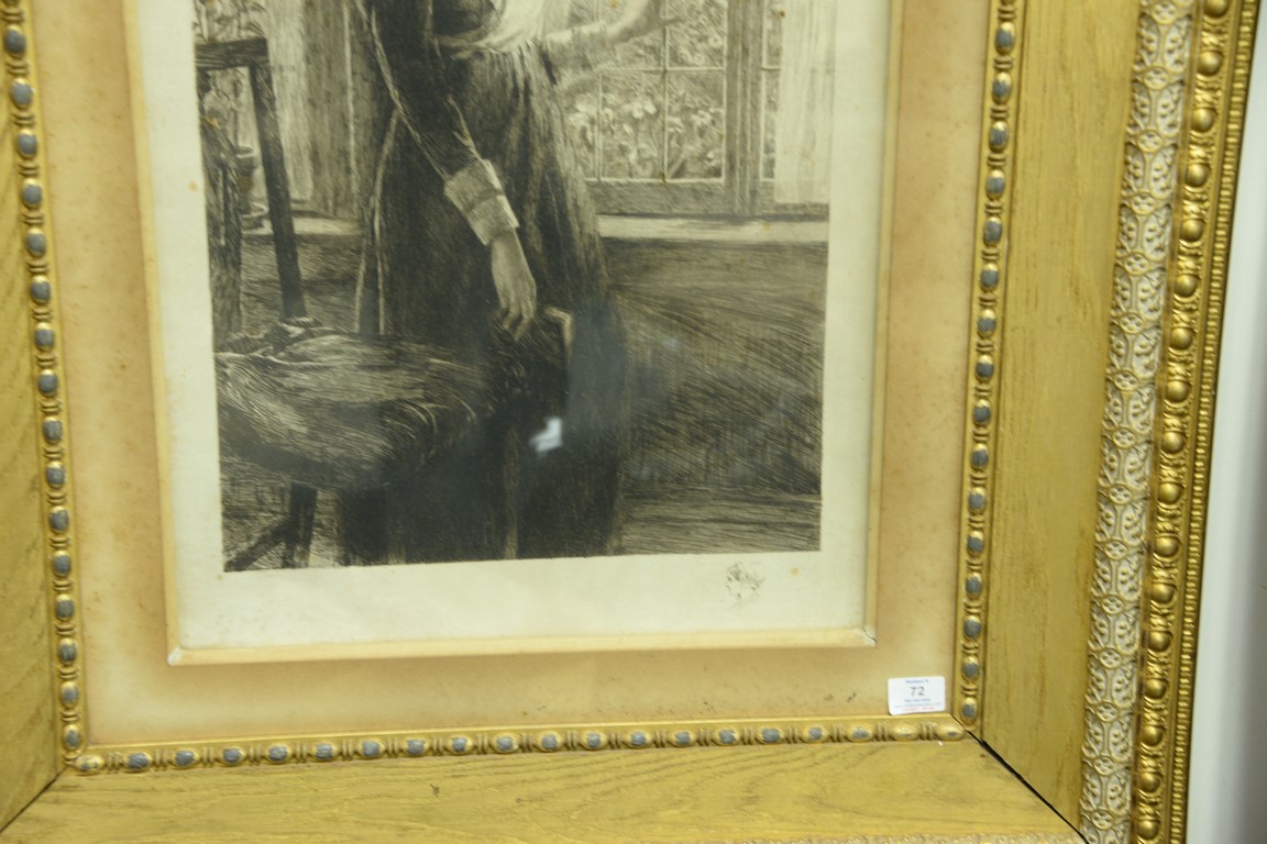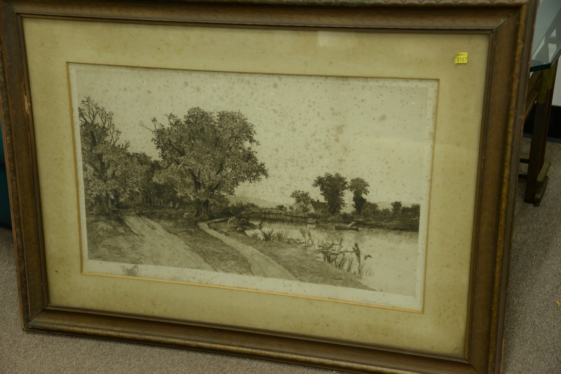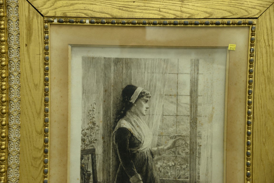 Lot 72: Two large engravings including Knoedler girl by window and landscape signed in plate: Frost. 16 1/2 x 26 1/2 and 28 x 18