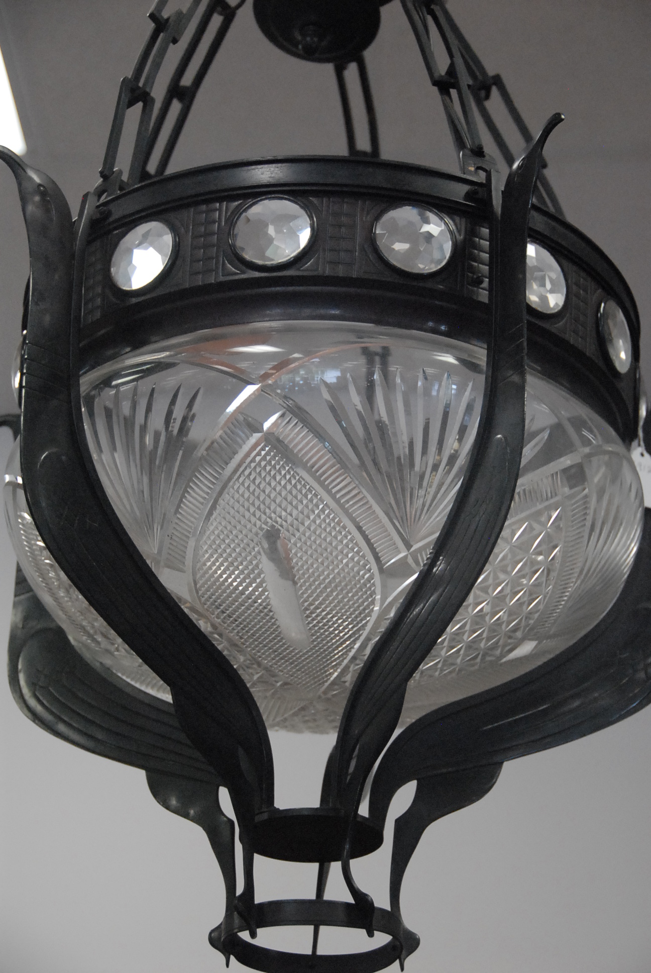 Lot 72: Unusual hanging light with cutglass dome with metal bird figures and cut crystal decoration, ht. 34in.