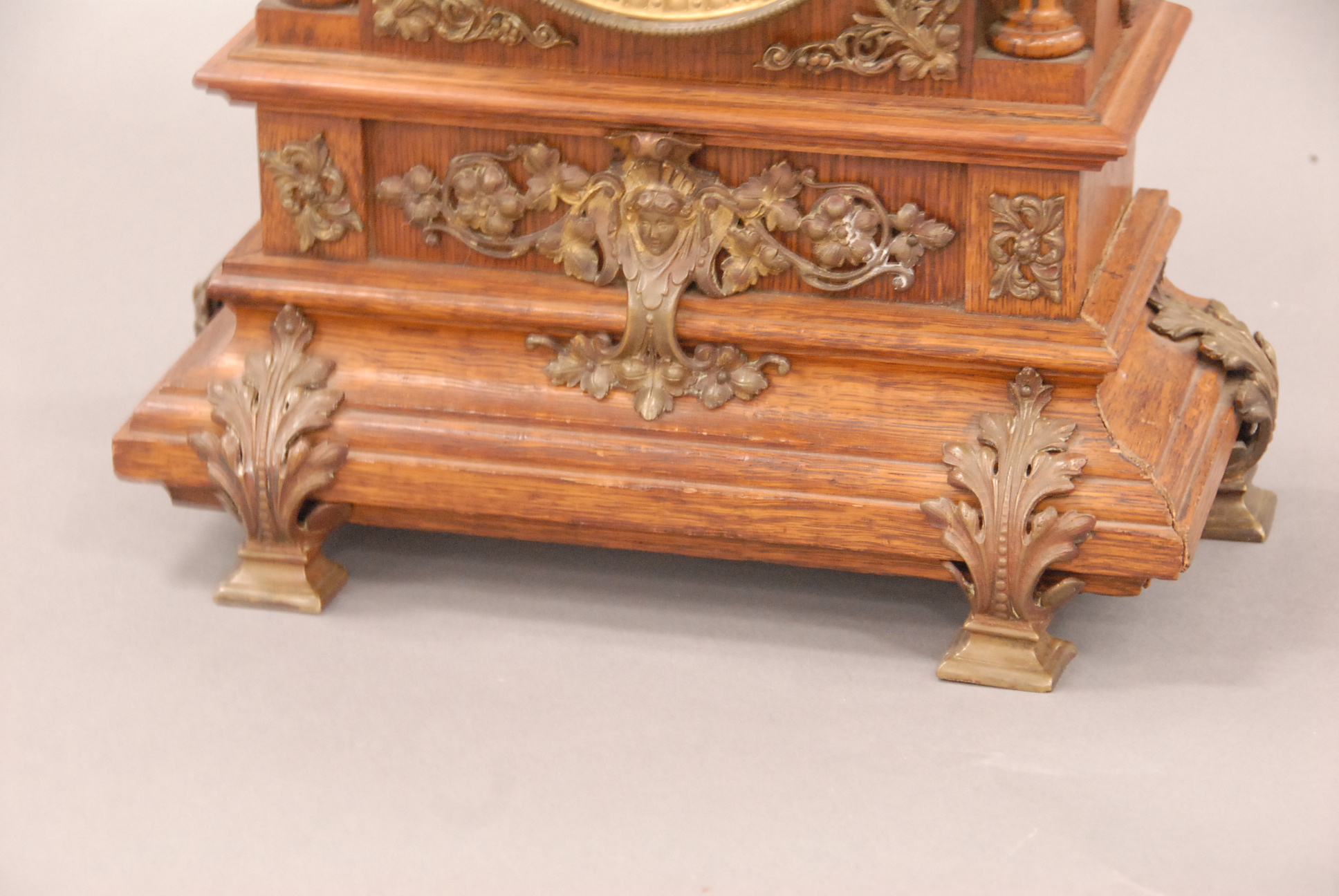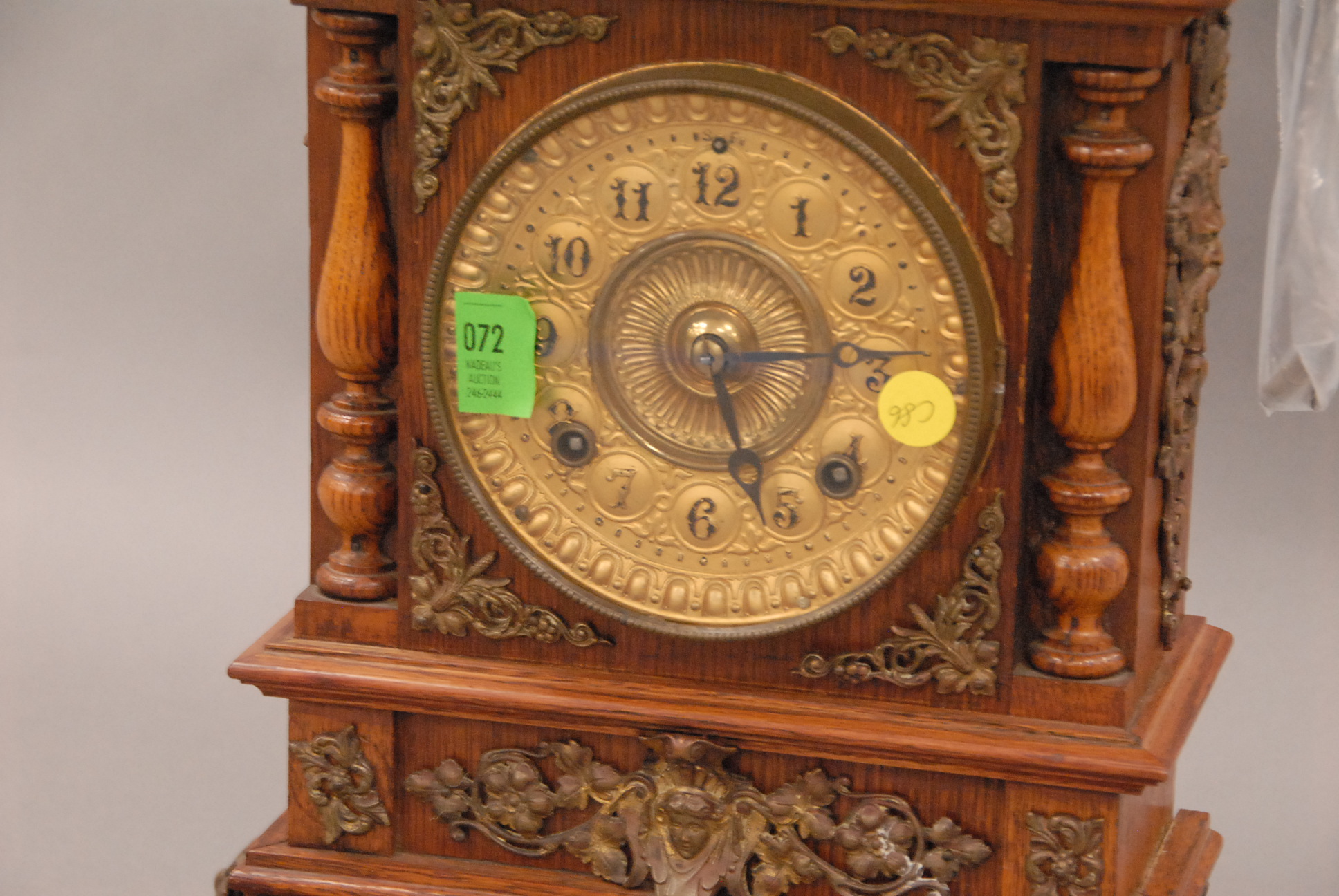 Unusual oak Victorian mantle clock with a gold dial, with brass mounts.