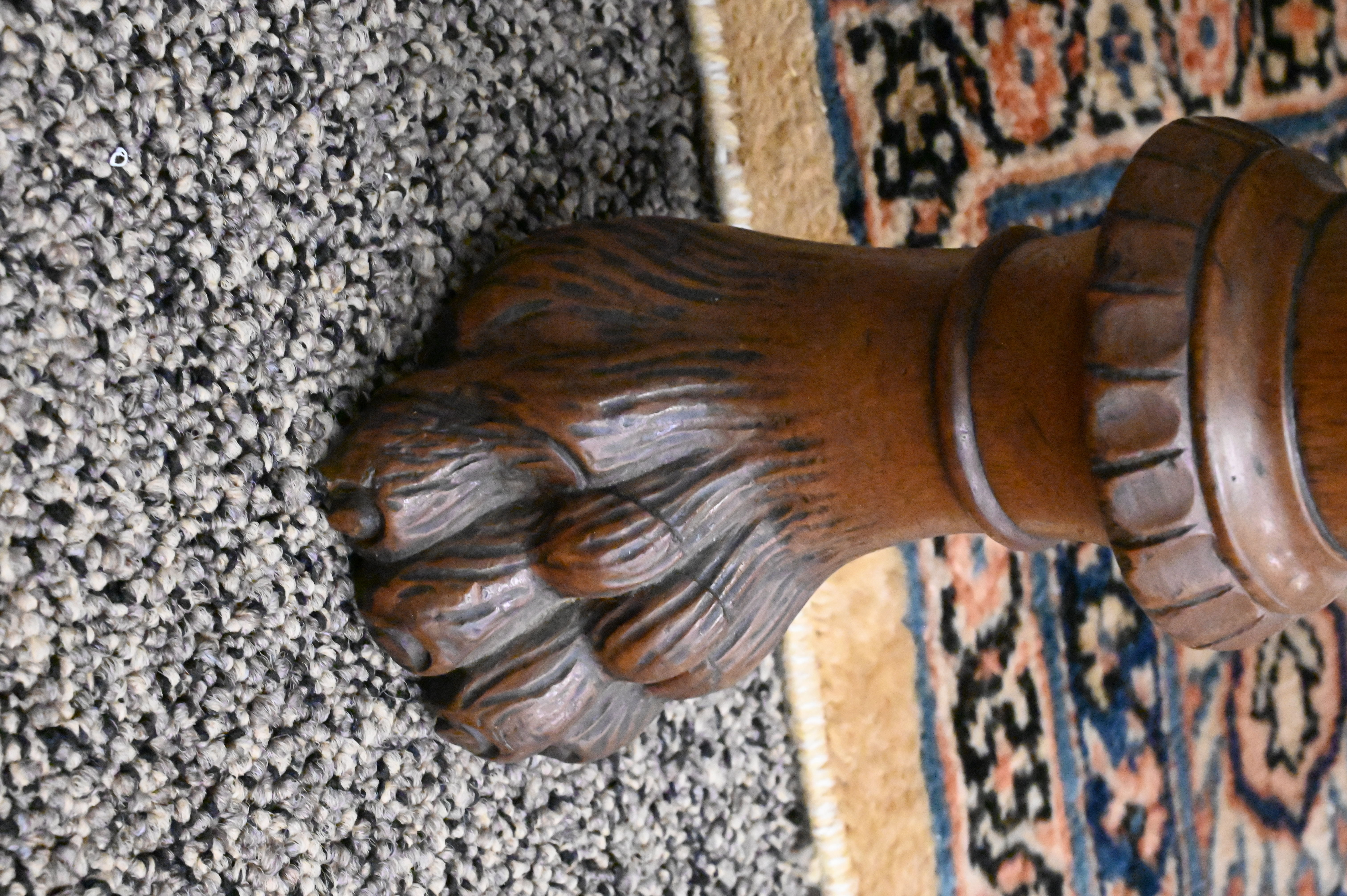 Presents well in very good condition, minor loss and repairs to molding, one small crack to glass, age crack to cylinder door, left interior leather surface with tear, one front foot/ paw having repair
