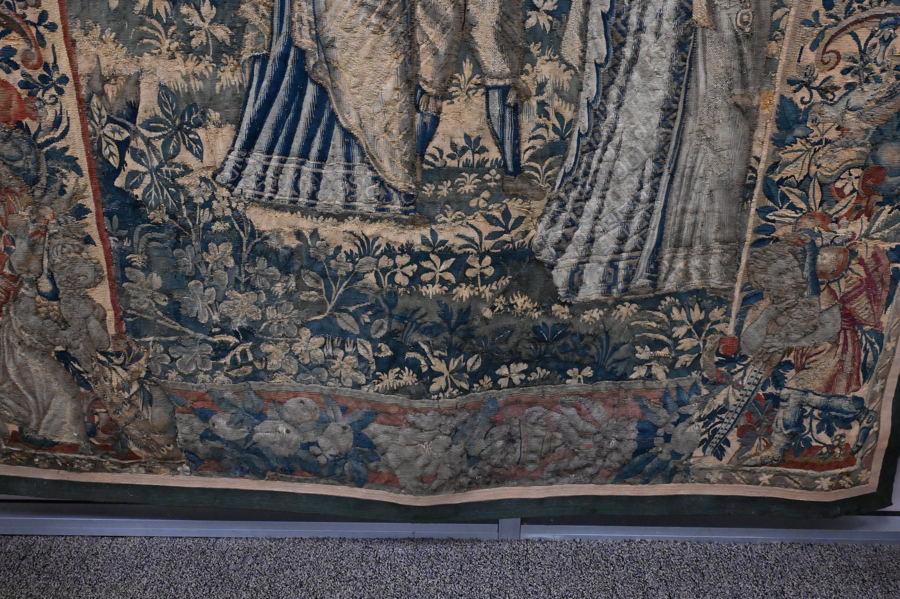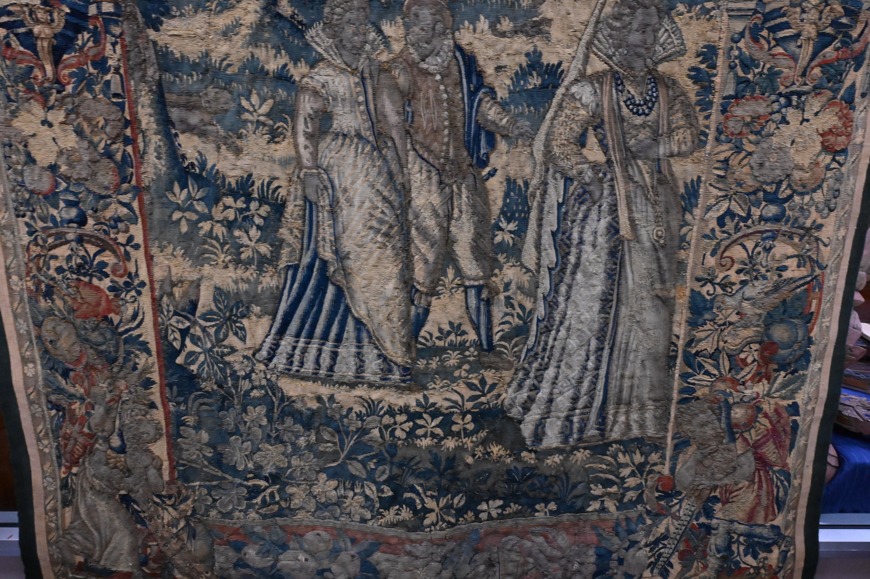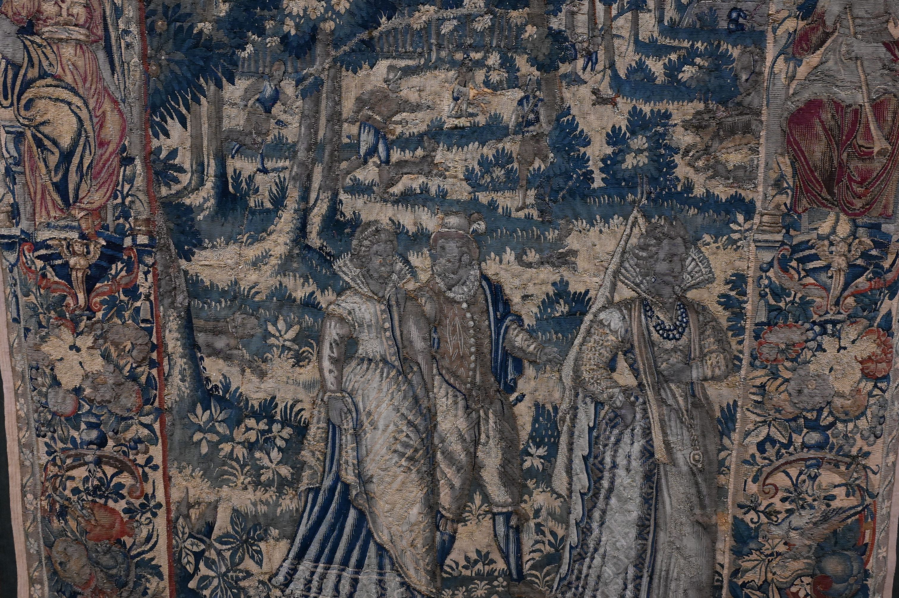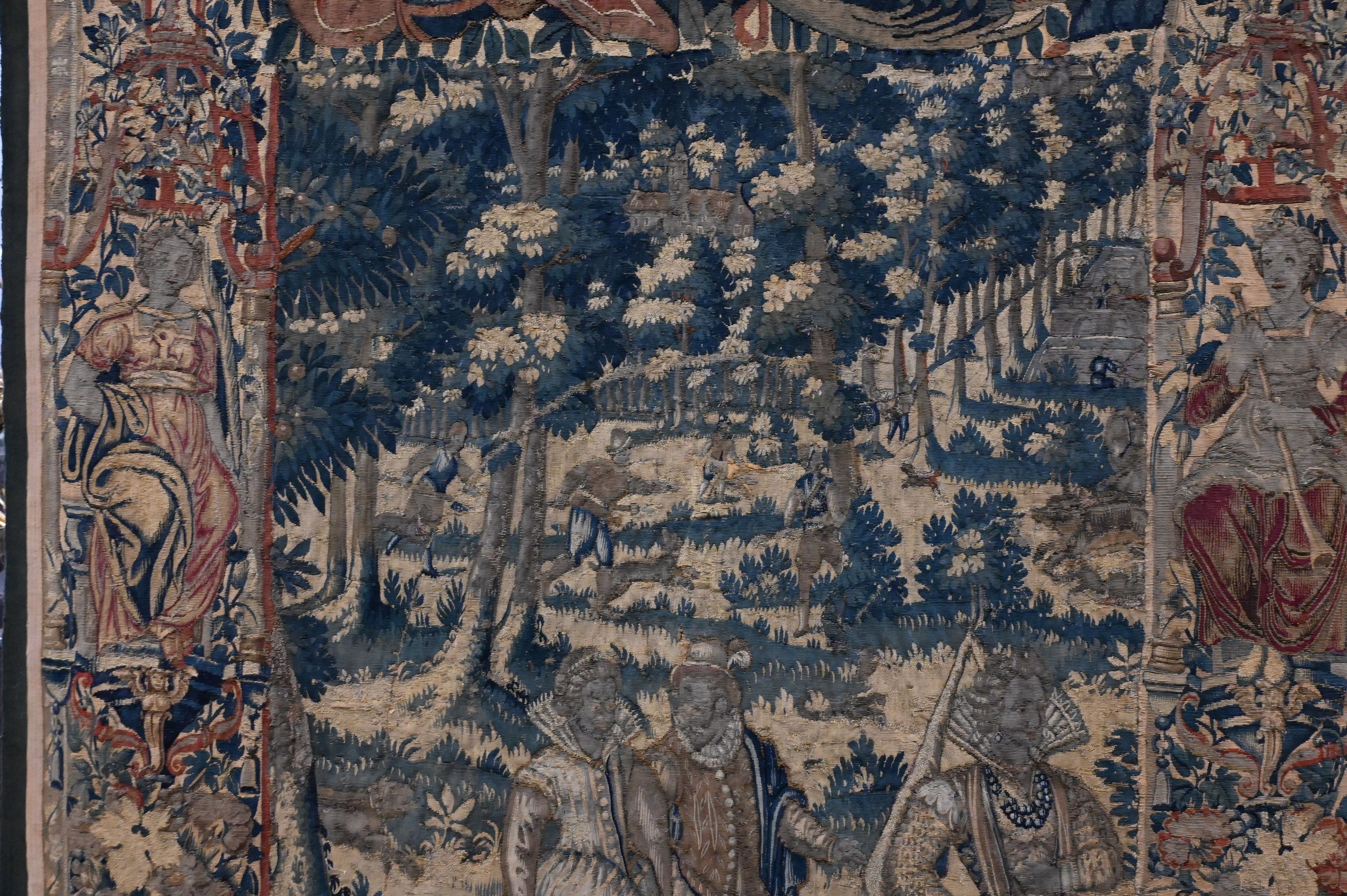 featuring three noble figures in the foreground in Elizabethan dress, small hunting figures and their dogs can be seen in the background amongst the forest trees and distant Chateau, bordered by scrolling foliate and angelic figures
