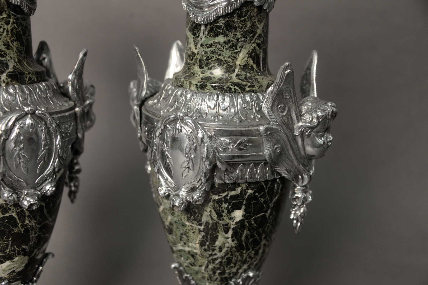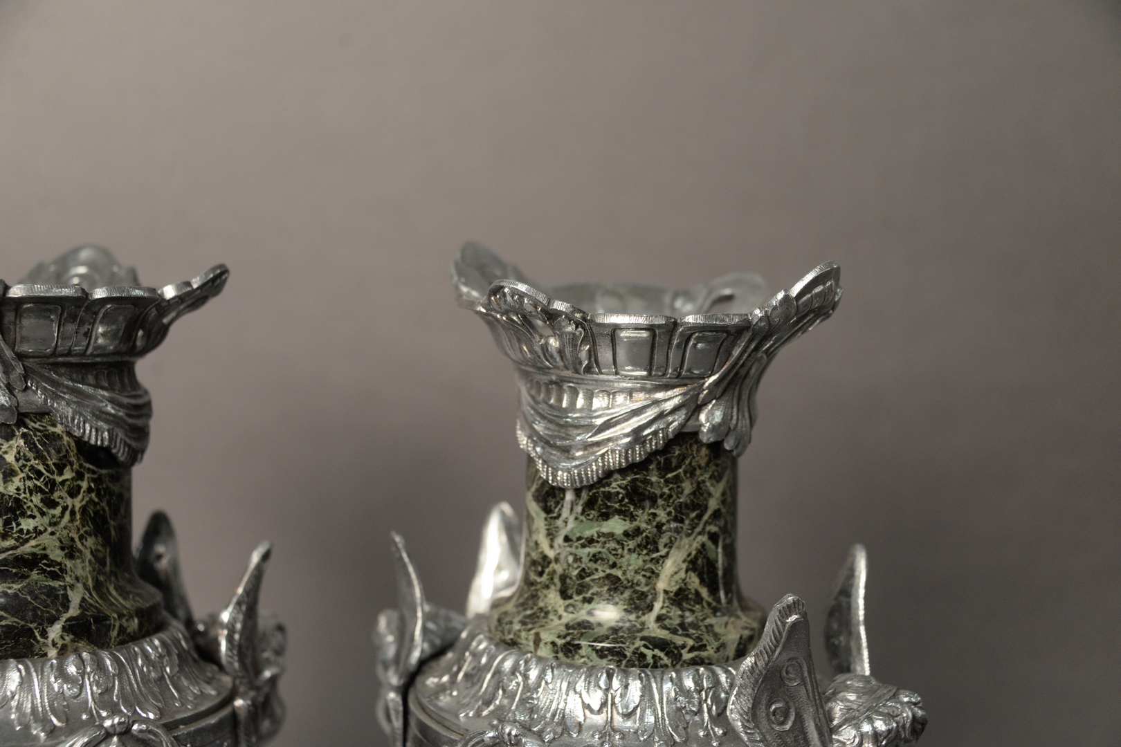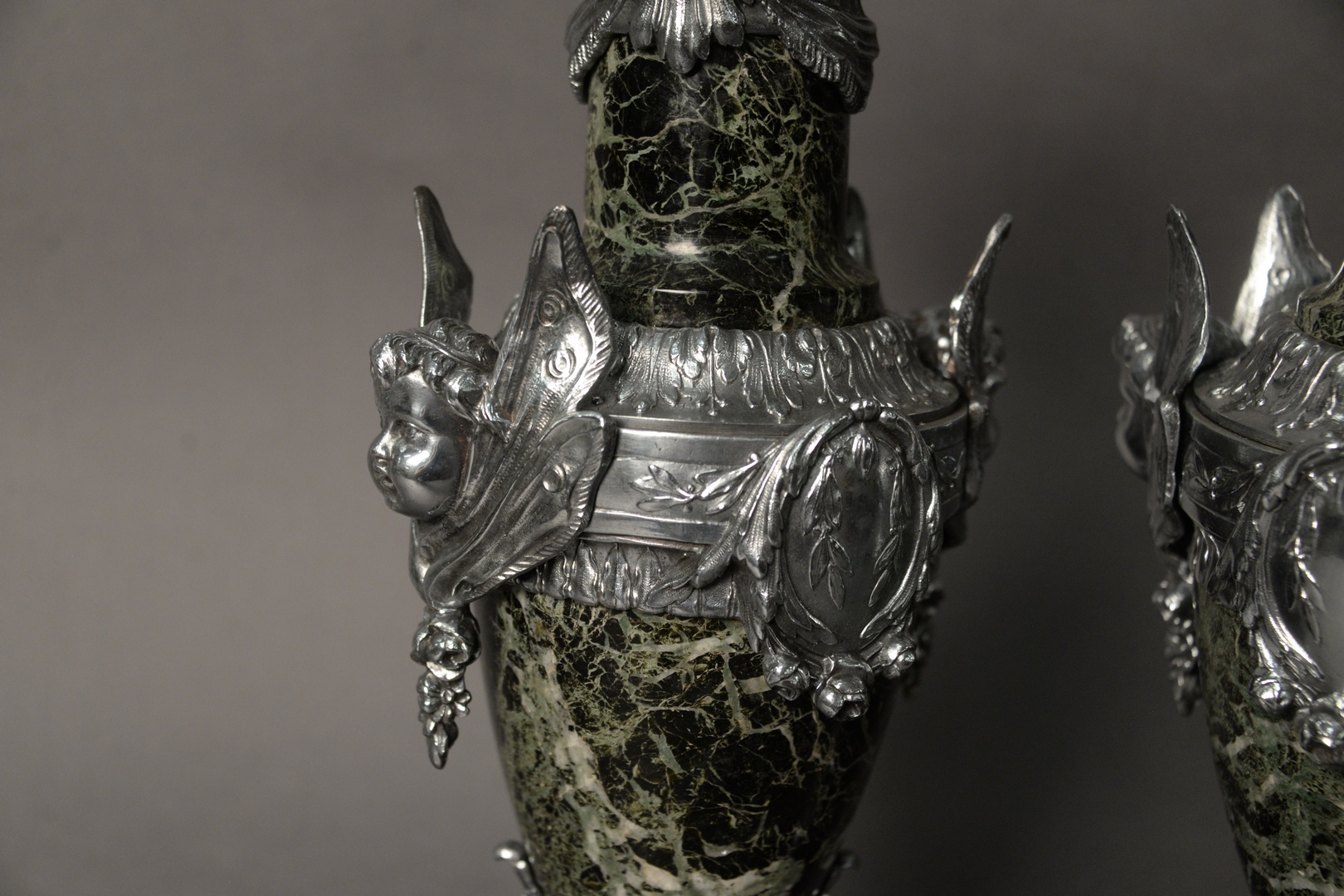 Pair of Green Marble and Silver Plate Mounted Urns having winged cherub handles mounted on matching bases, height 16 1/2 inches, width 7 inches.
