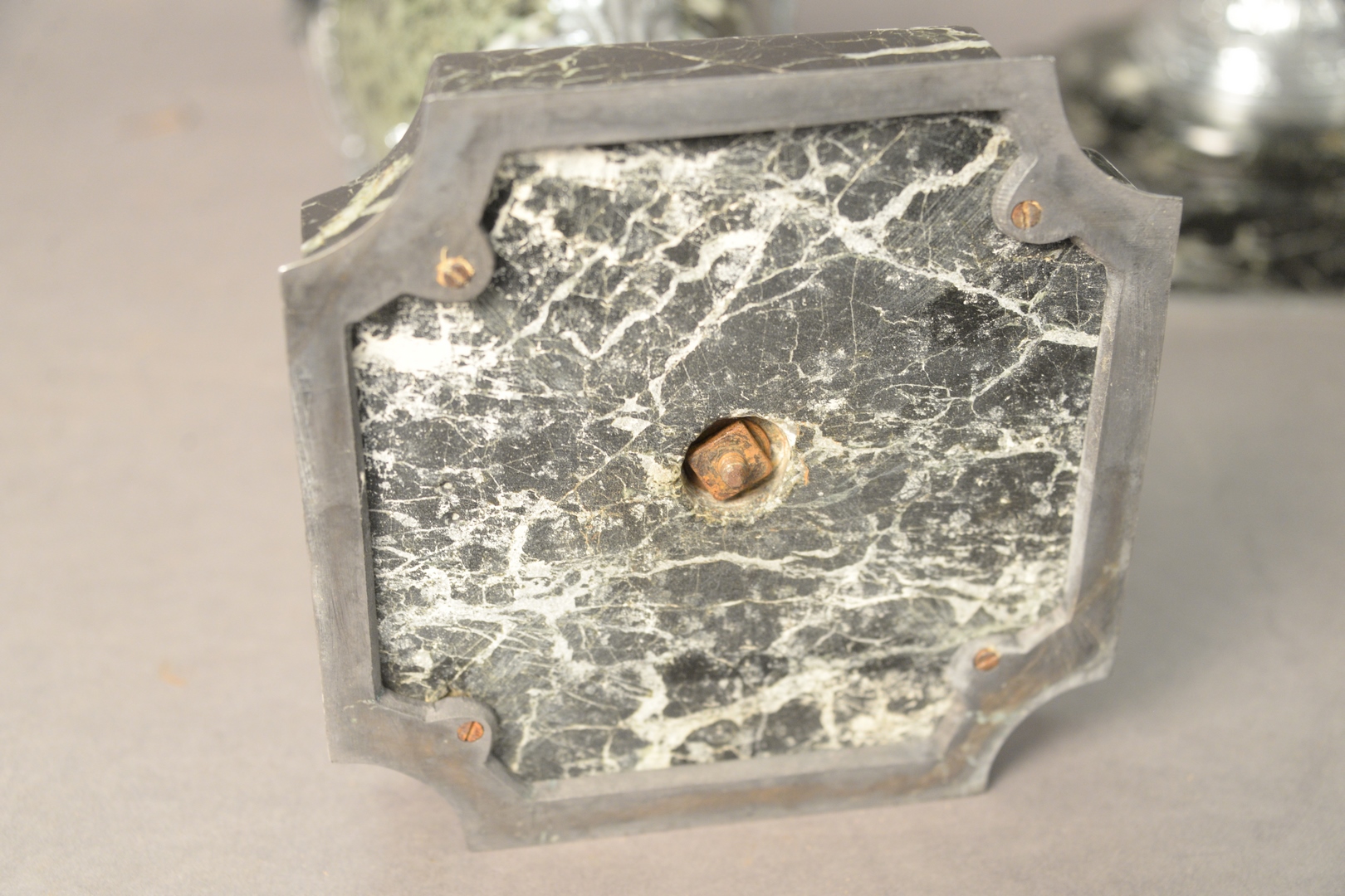 Lot 722: Pair of Green Marble and Silver Plate Mounted Urns having winged cherub handles mounted on matching bases, height 16 1/2 inches, wid…