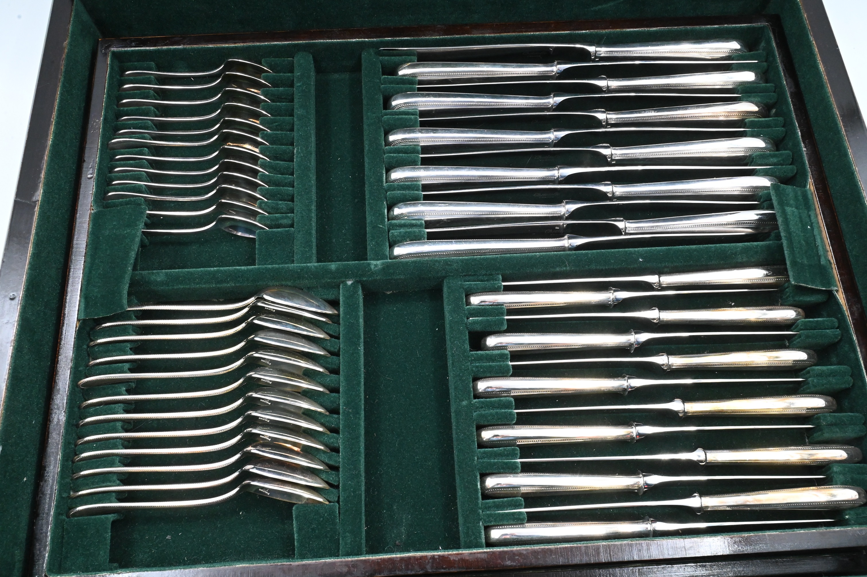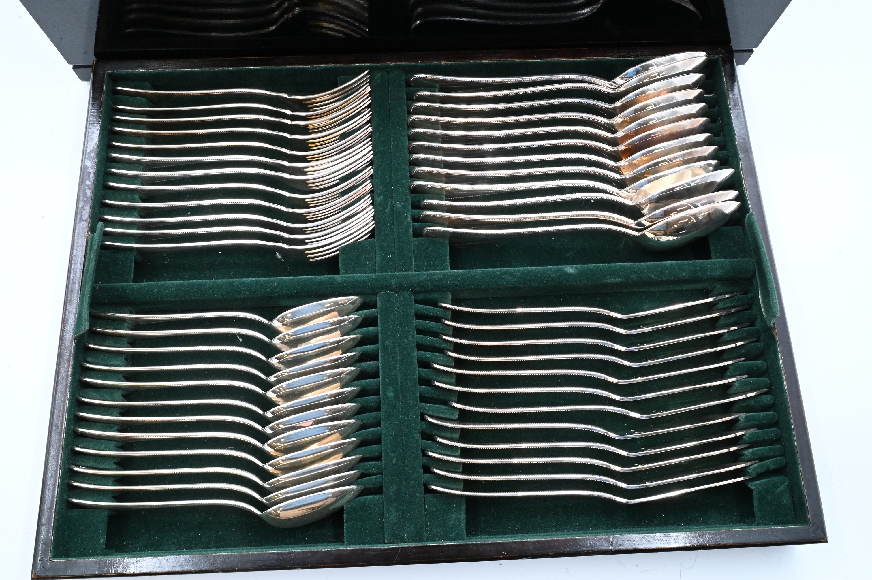 set for 12 to include 12 place forks, 12 dessert forks, 12 fish forks, 12 tablespoons, 12 tea spoons, 12 tea spoons, 12 demi spoons, 12 dinner knives, 12 dessert knives, 12 fish knives, 10 serving pieces, all in a fitted Christofle wooden box