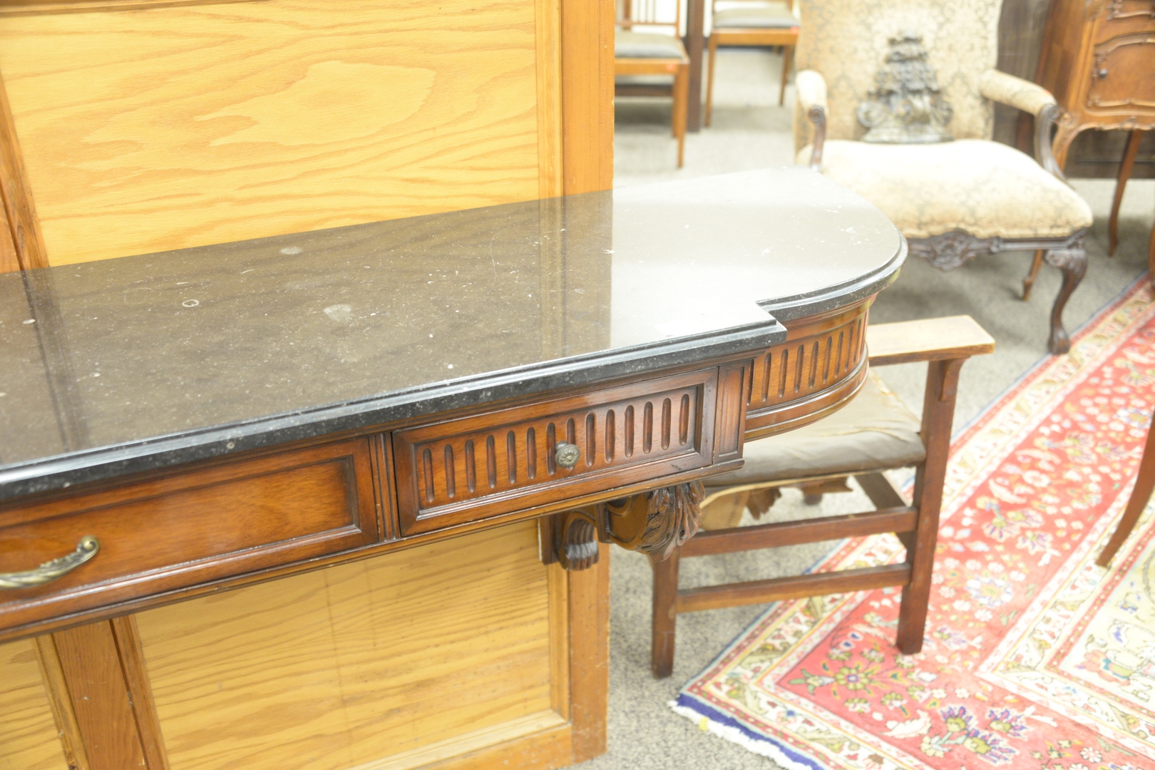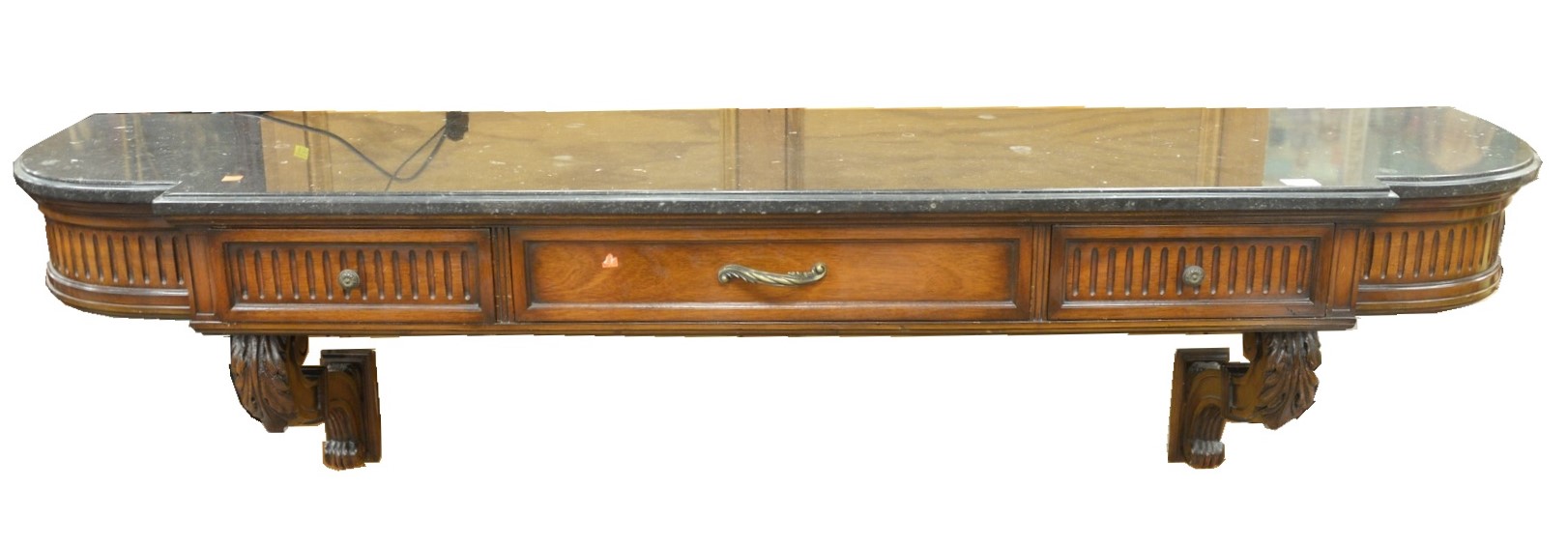 Lot 724: Wall Mounted Demilune Server having marble top over three drawers, height 24 inches, top 16 1/2 x 78.