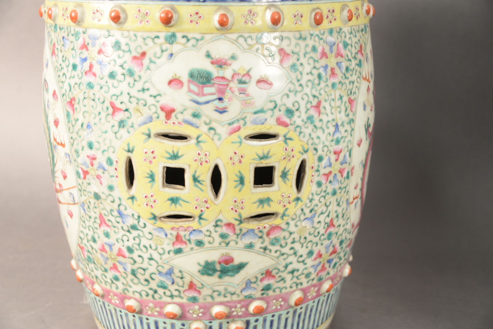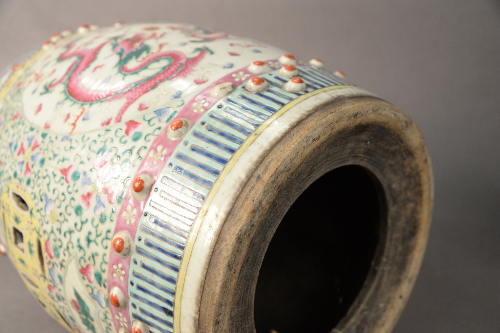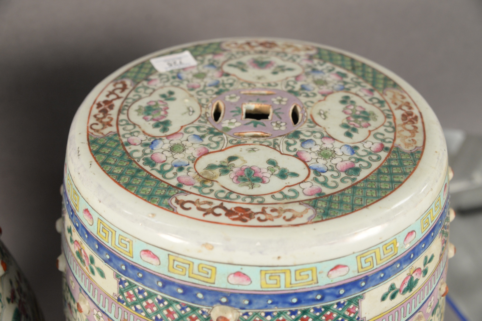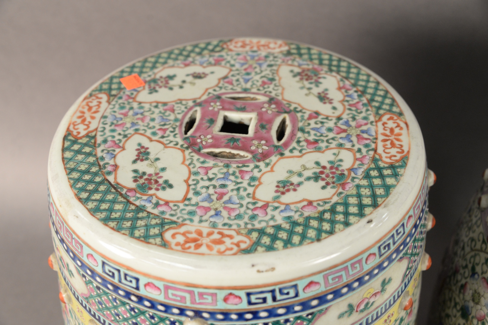 Lot 725: Two Chinese Famille Rose Garden Seats, one having painted dragon panels the other painted with peacock and floral decoration, heigh…