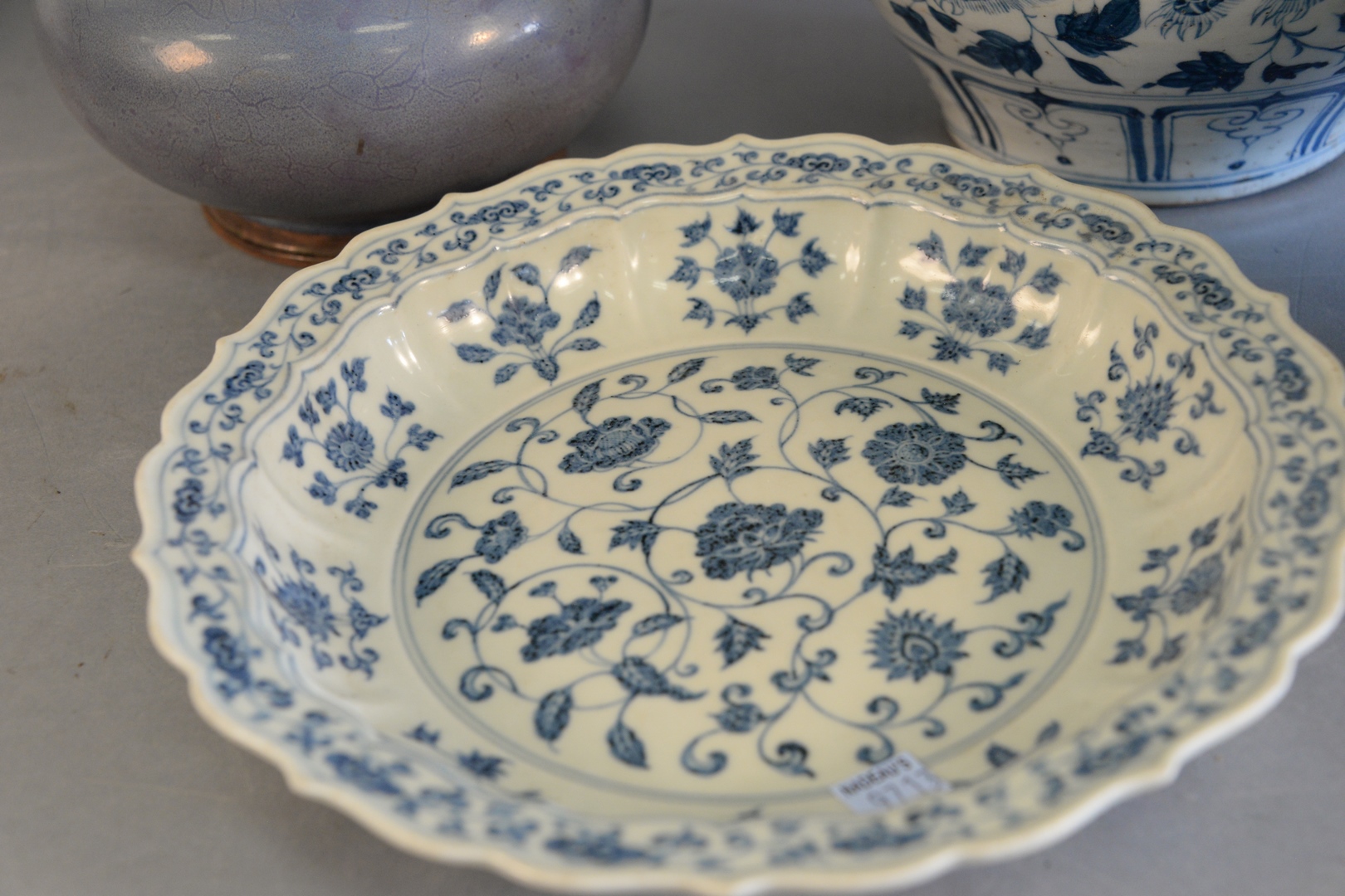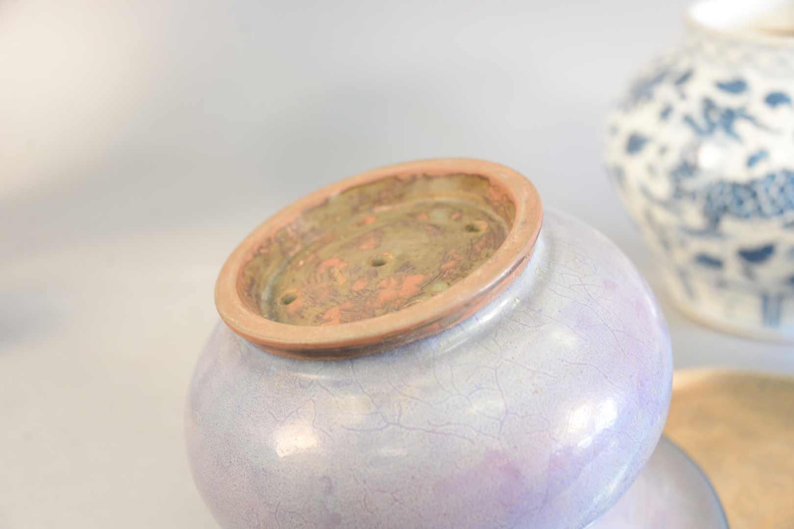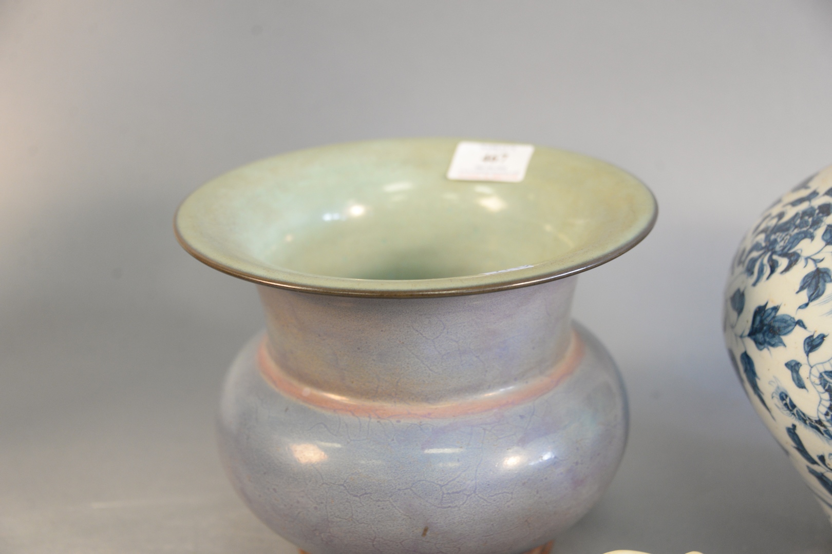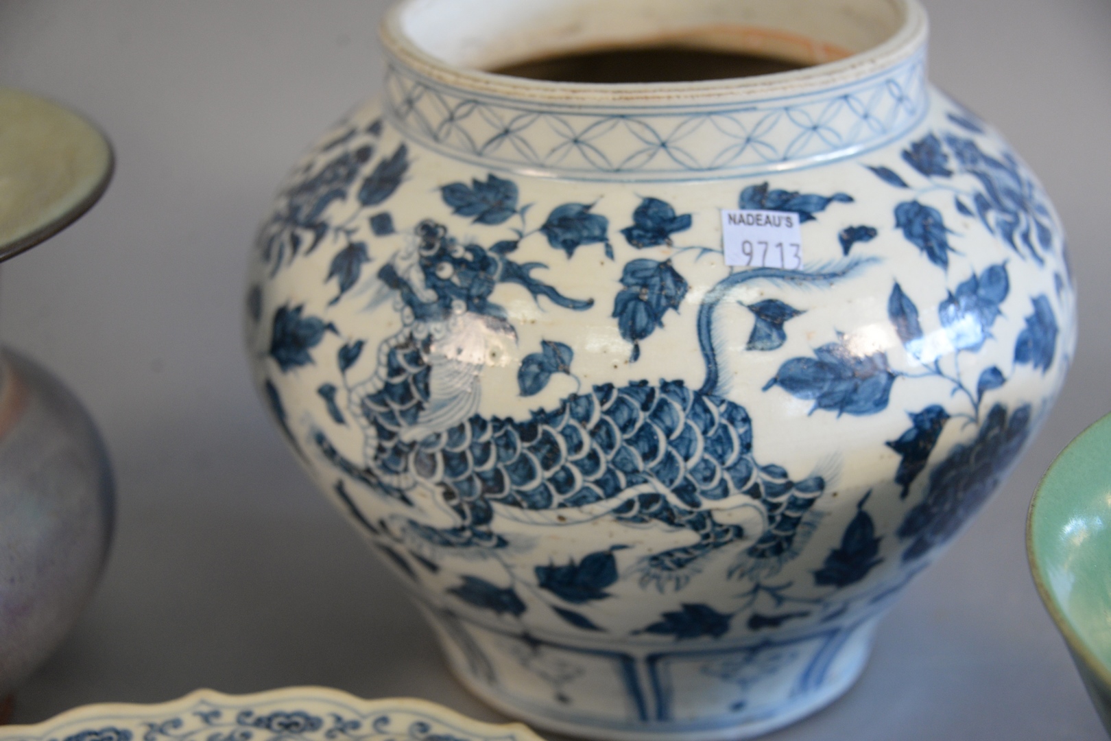 Lot 725B: Four Chinese porcelain pieces, large Famille verte stem cup Jun-ware vessel blue and white jar with painted dragons along with a b…