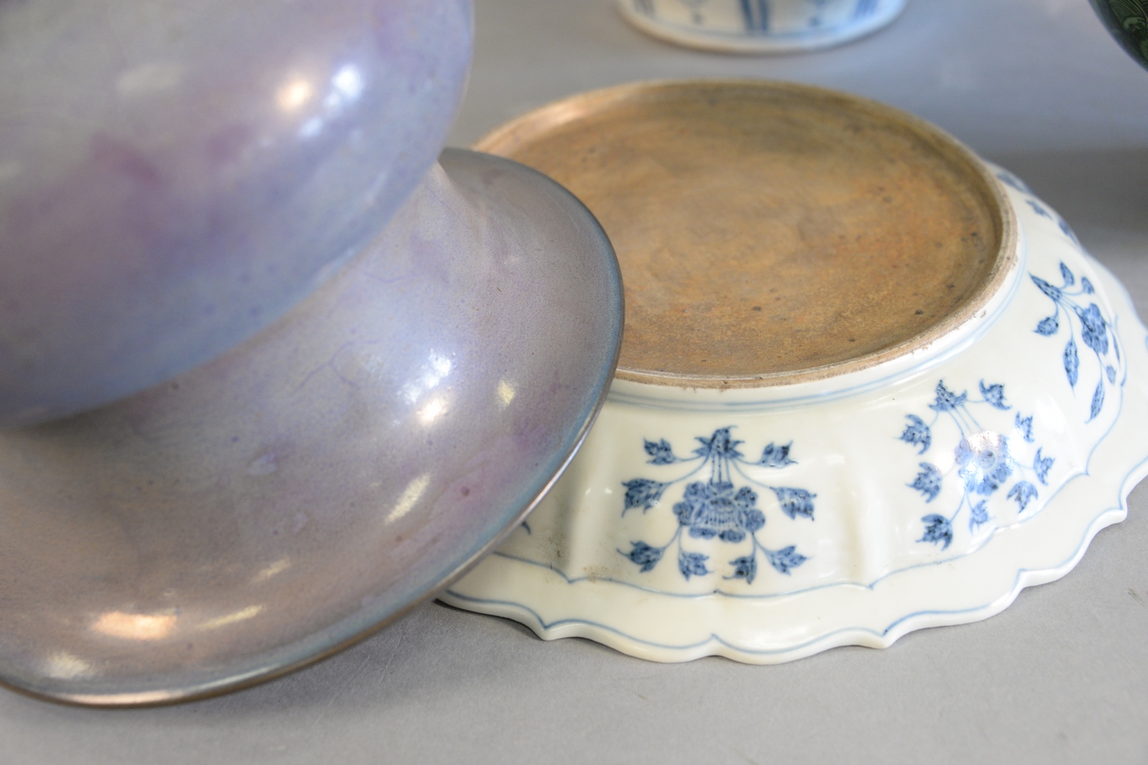 Four Chinese porcelain pieces, large Famille verte stem cup Jun-ware vessel blue and white jar with painted dragons along with a blue and white plate with painted flowers, 6-1/2 high, 8-1/2 dia.