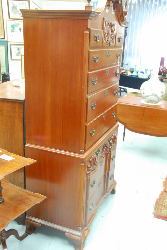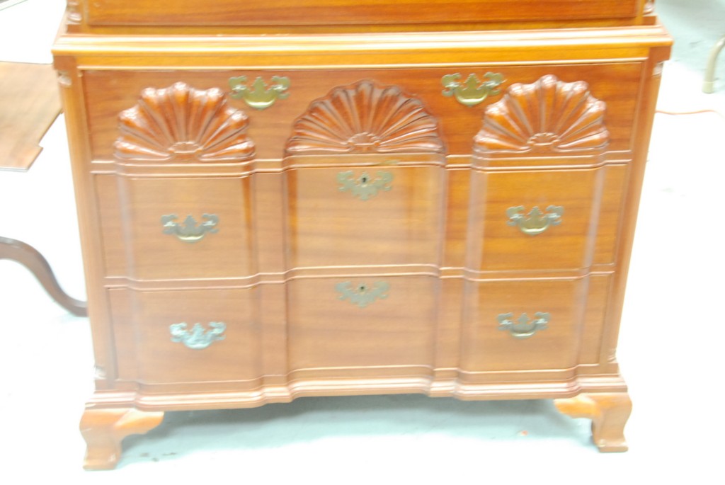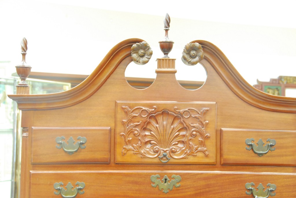 Fineberg mahogany chest on chest in two parts, upper section having broken arch top over three small drawers over four drawers, lower section having blocked front triple shell carved drawers over two drawers set on ogee feet. –
