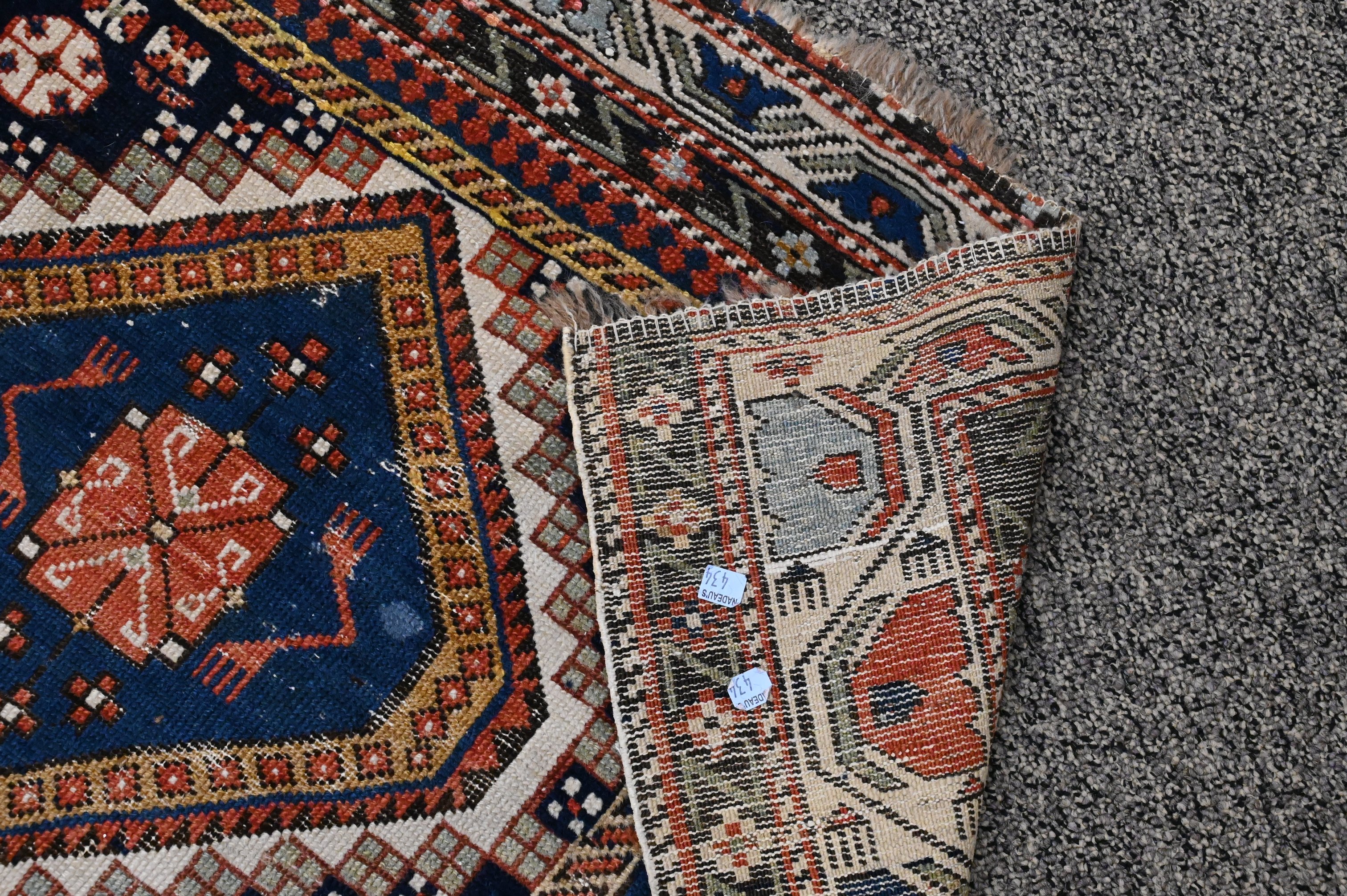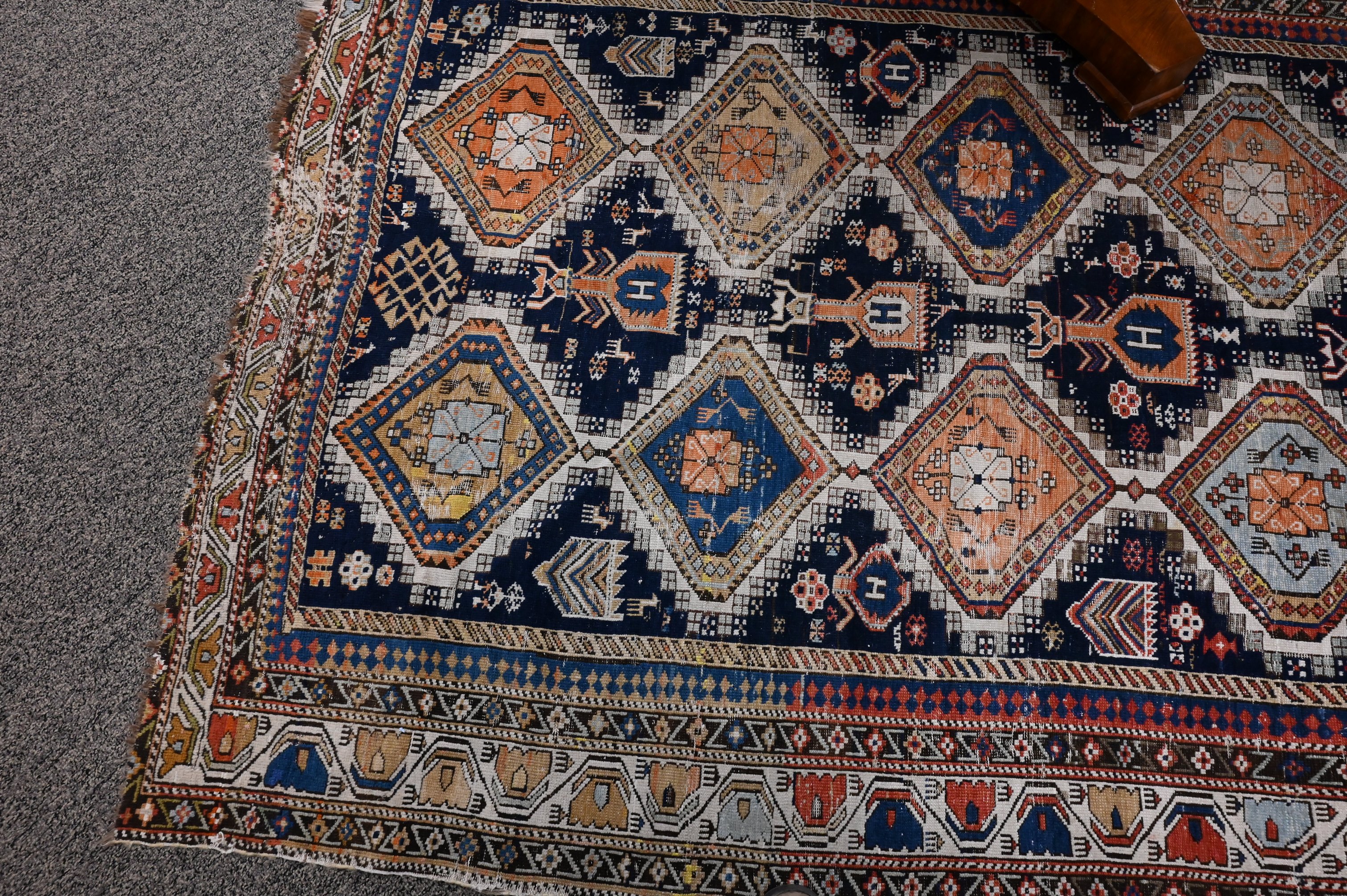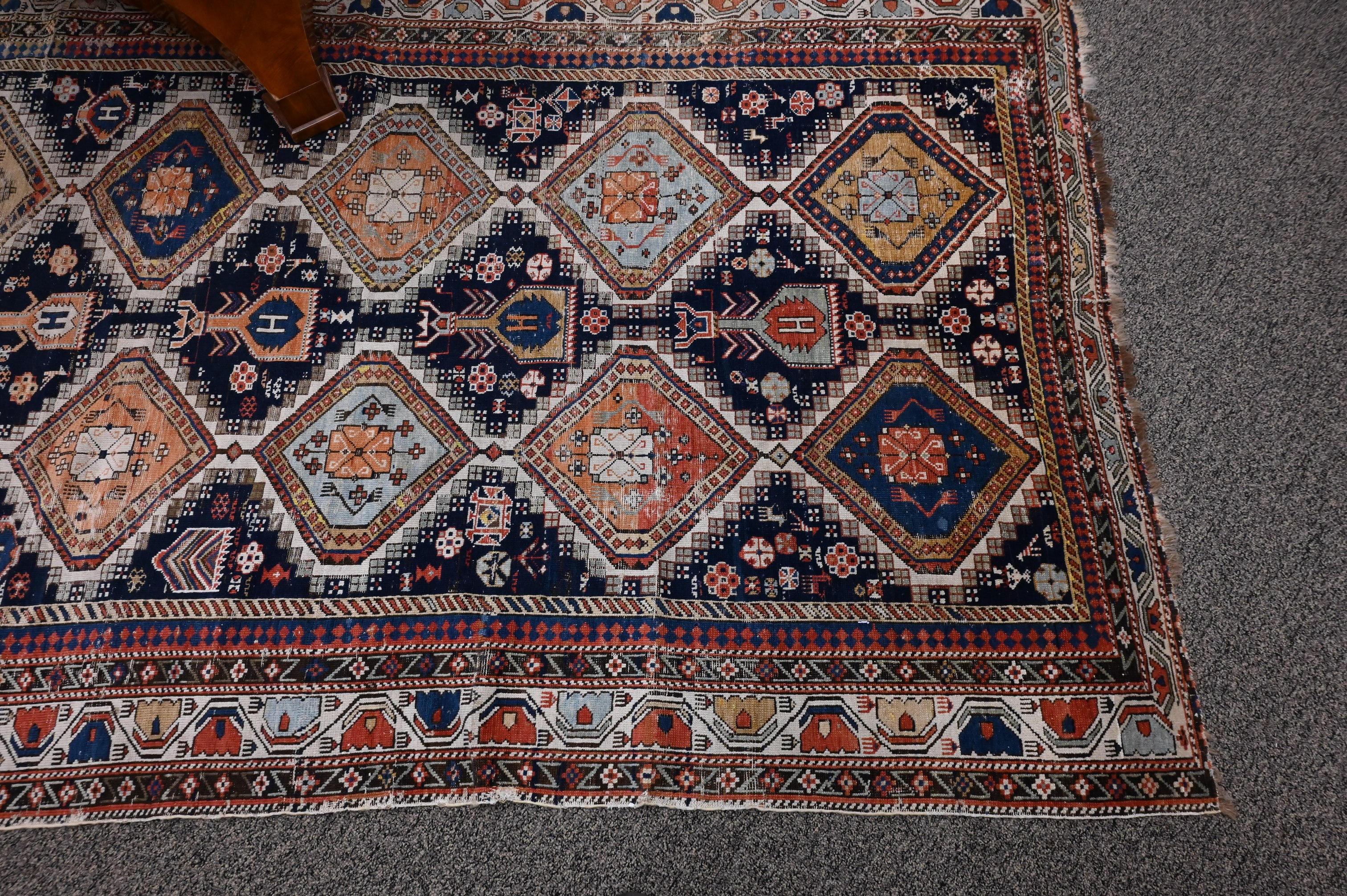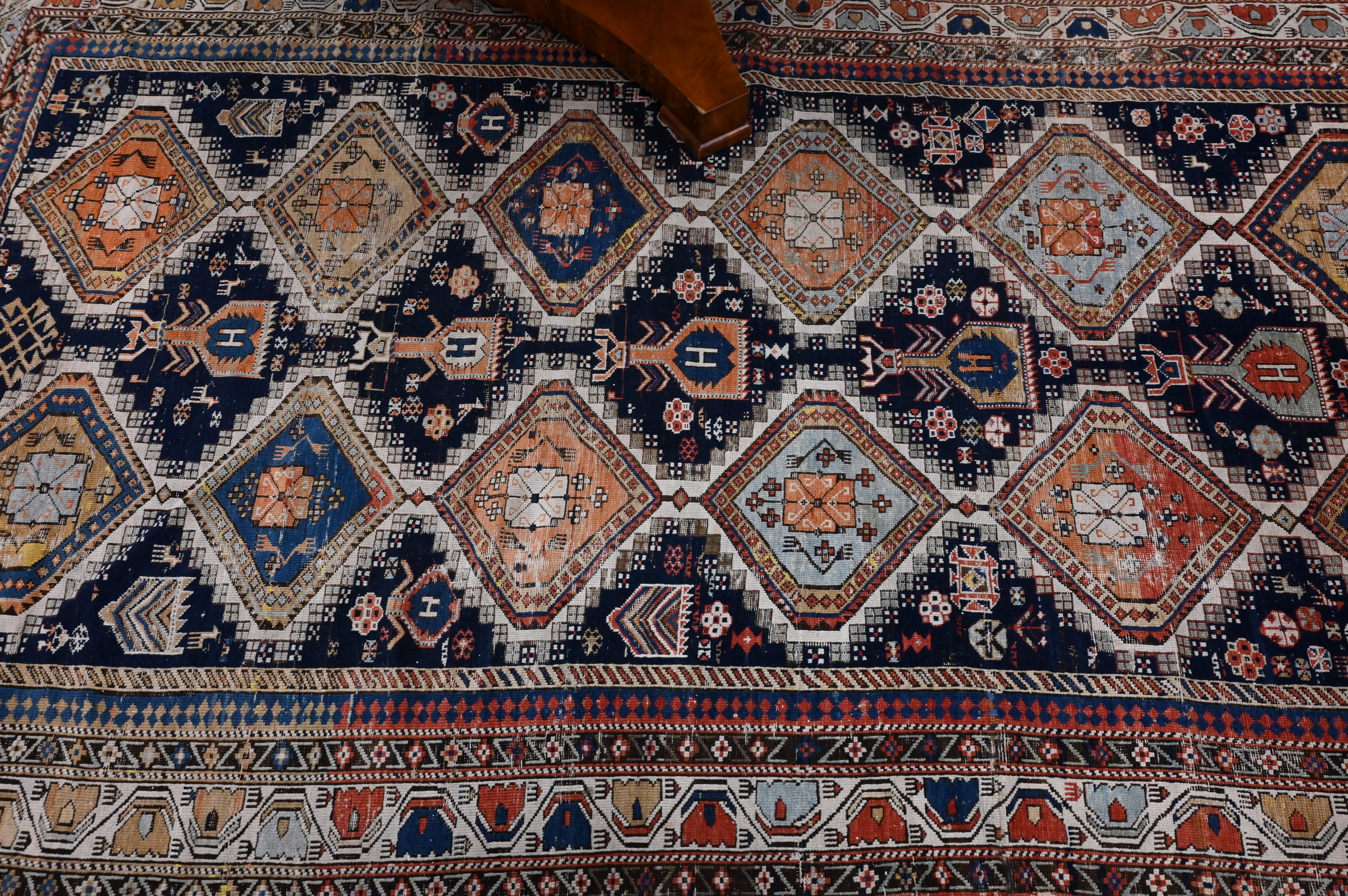Condition: presents well, wear throughout, a few repairs, minor edge wear, no fringe