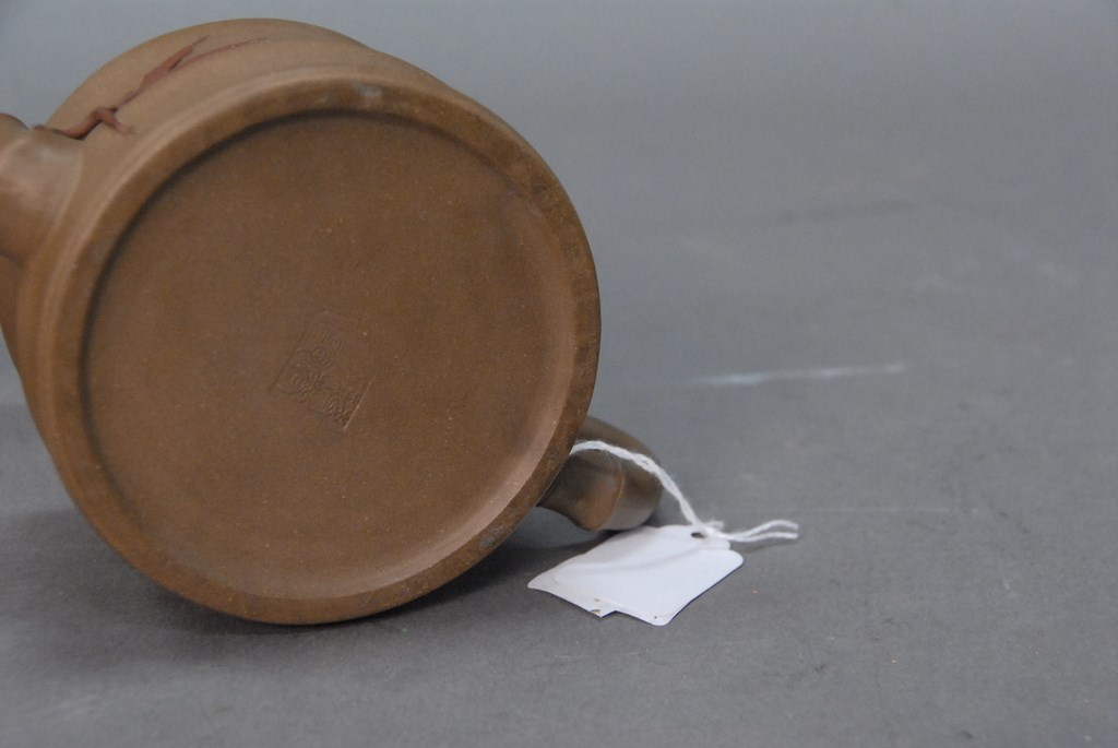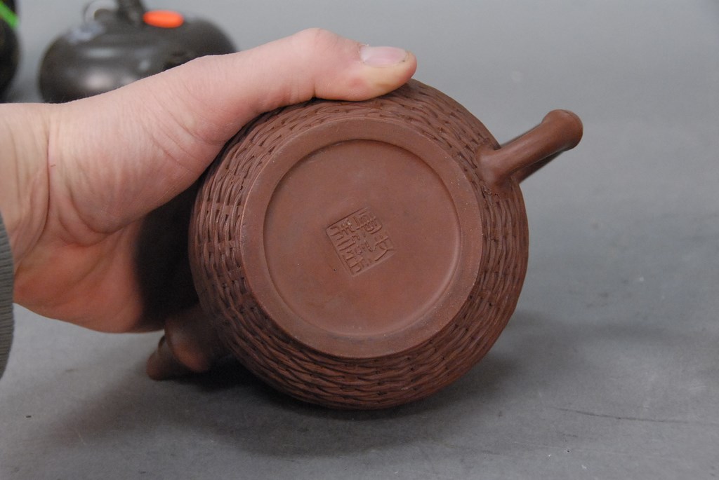 Lot 727: Group of two Chinese teapots, one with bamboo handle and the other with basket weave design, both marked on bottom.