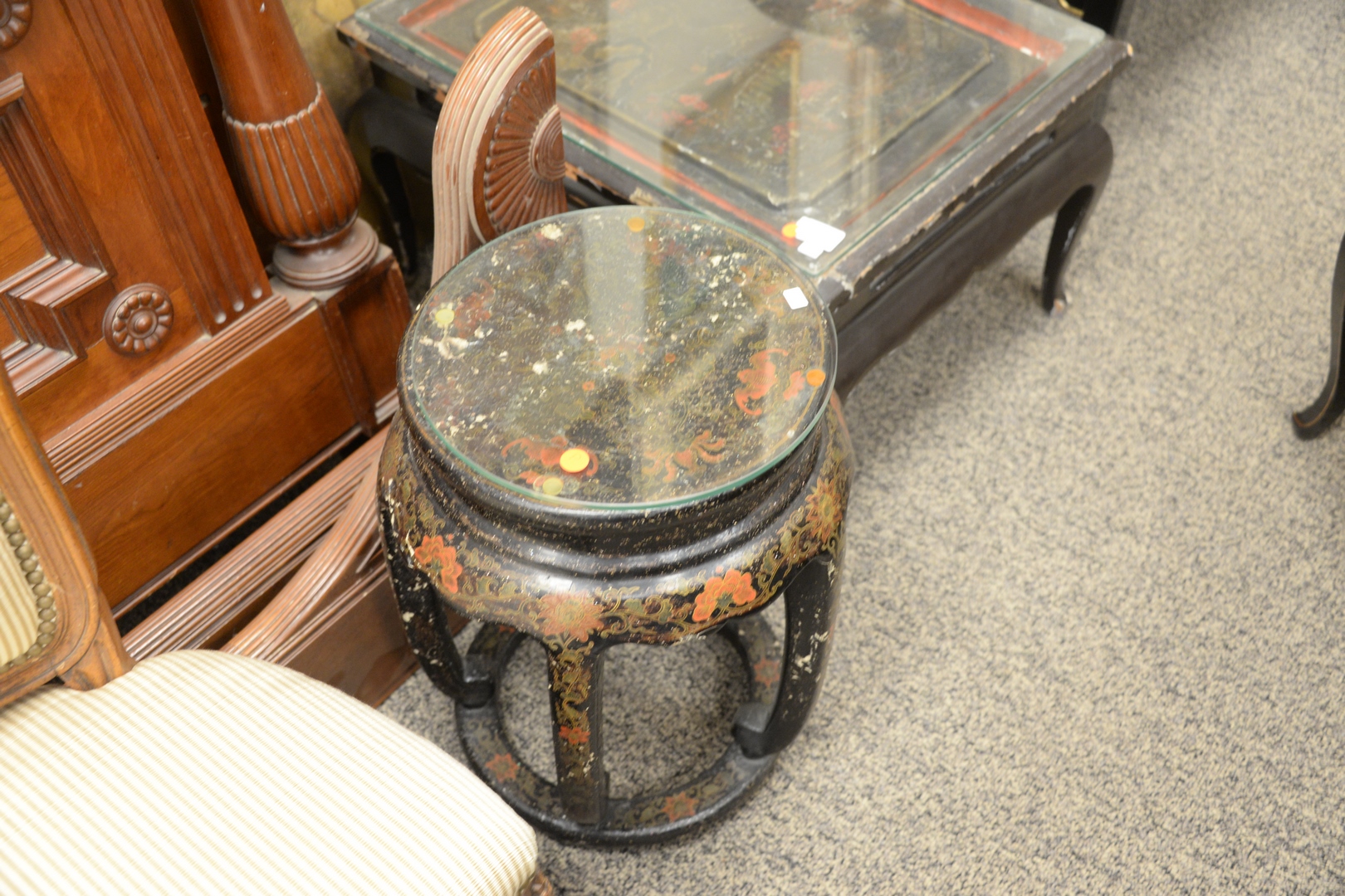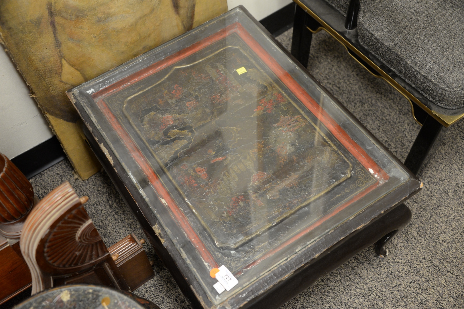 Lot 727: Two Black Lacquered Stands, rectangle having painted landscape and small round having painted flowers, height 14 1/2 inches width 25…