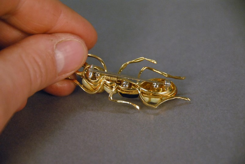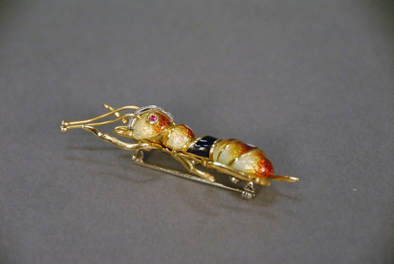 18k enameled bug pin set with eleven diamonds. 20.2 grams, lg. 2 3/4in.