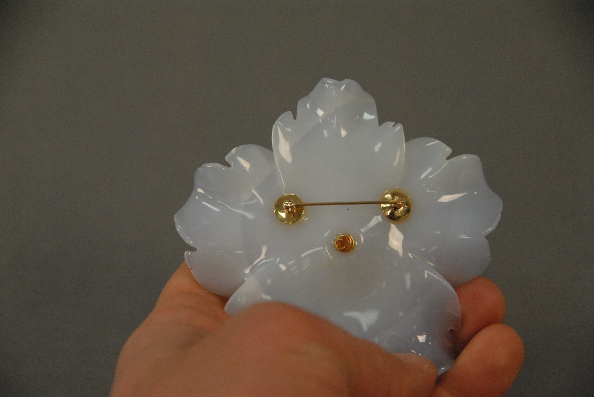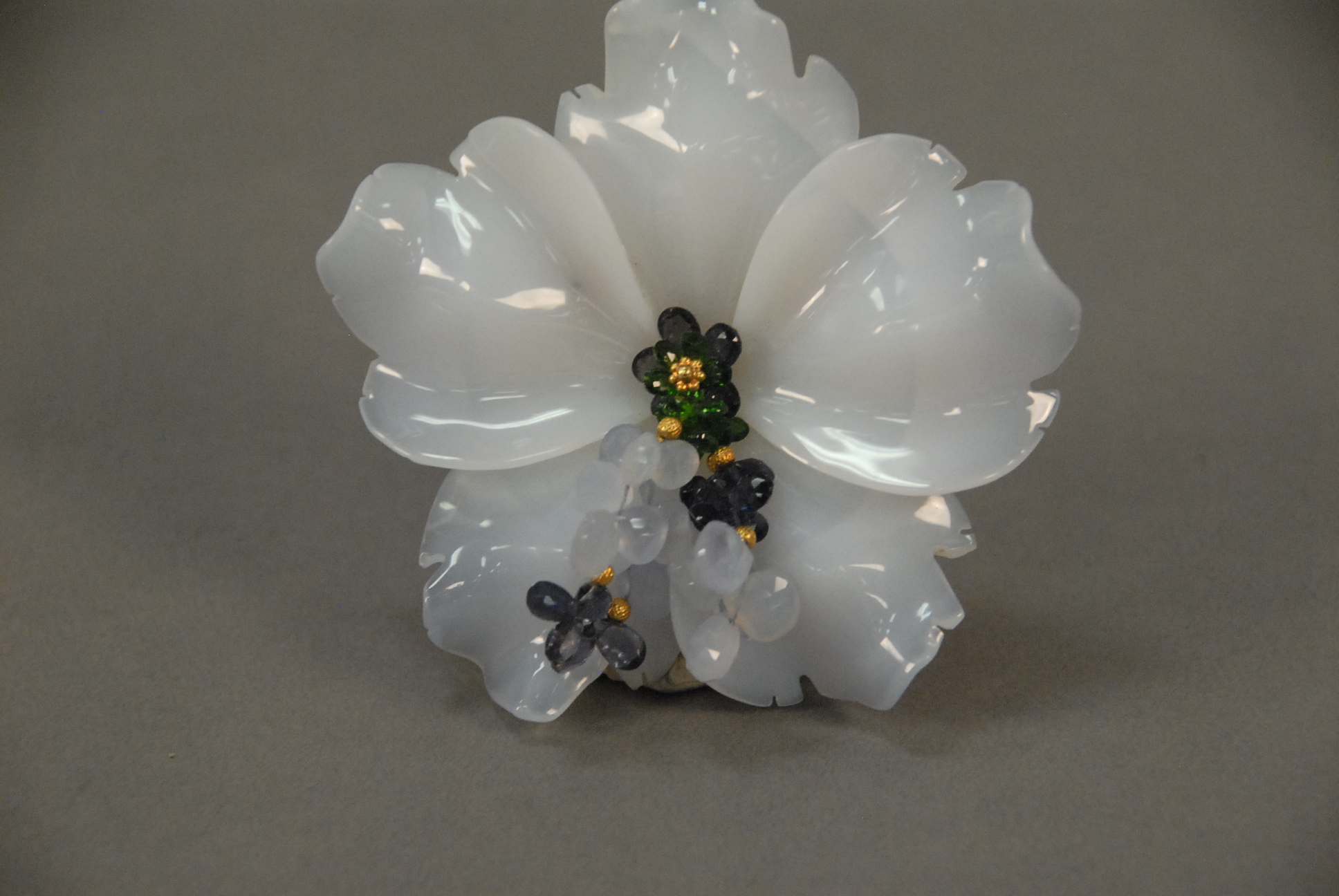 Chalcedony brooch designed as a flower head, center with multiple amethyst, green stones, and chalcedony. dia. 3 1/2in.