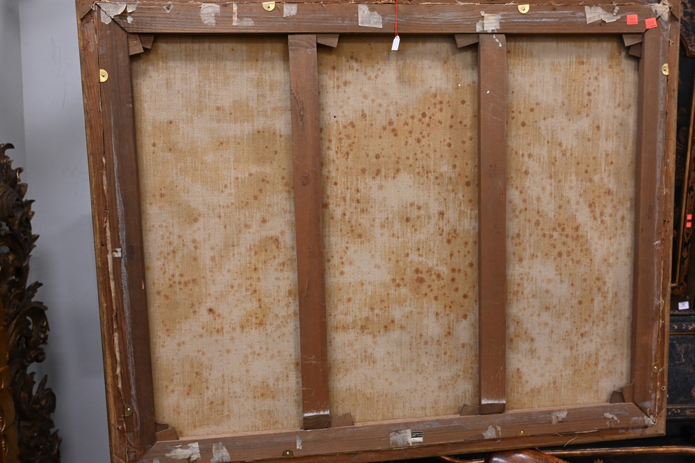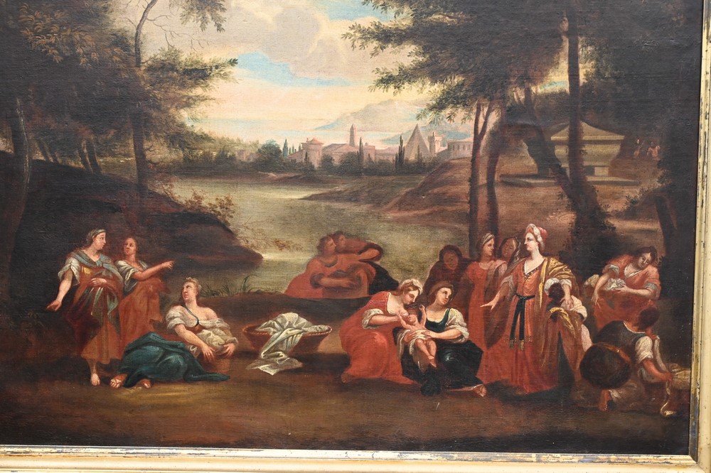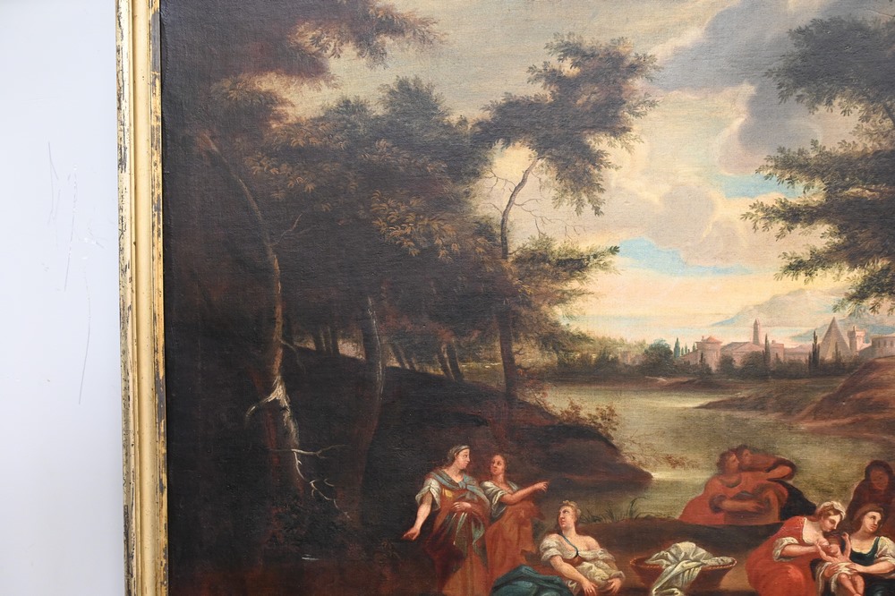 Lot 73: Continental School, landscape having women and children in foreground with town in background, oil on canvas, 19th century, unsigned, relined, 31 x 39 inches.