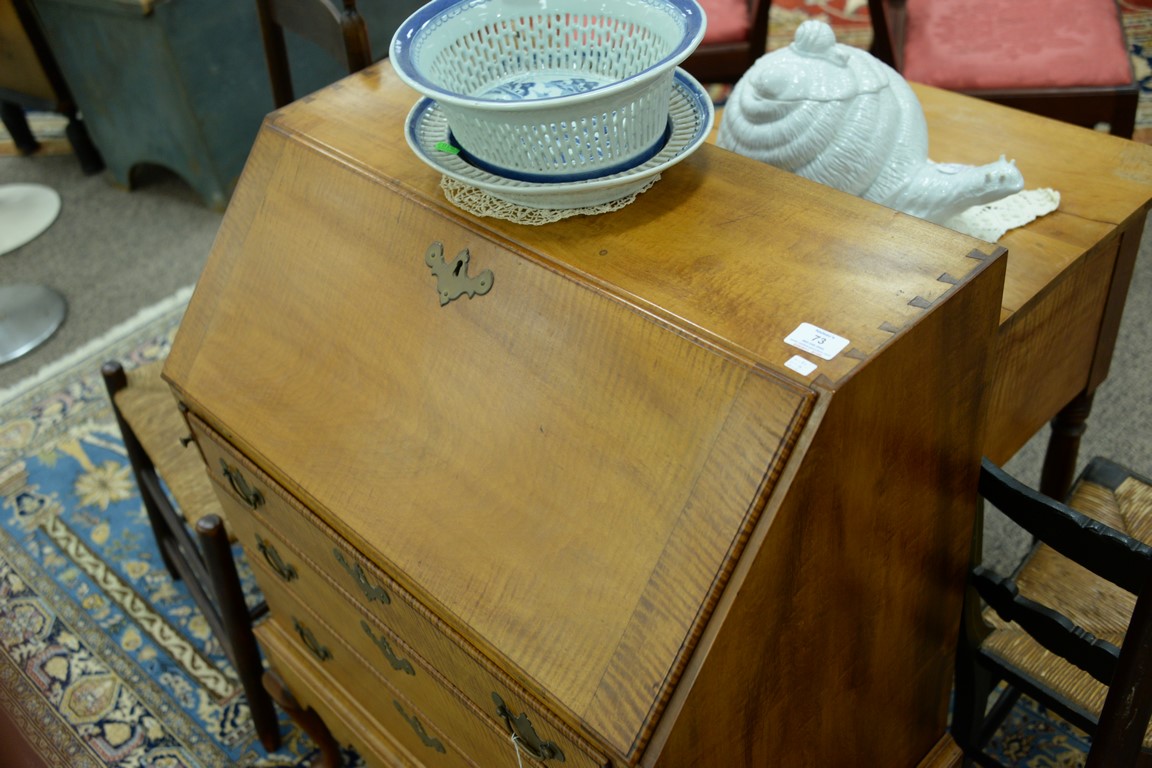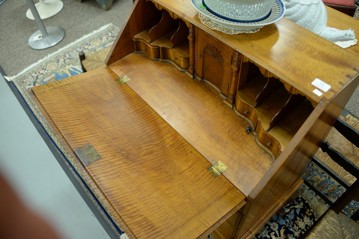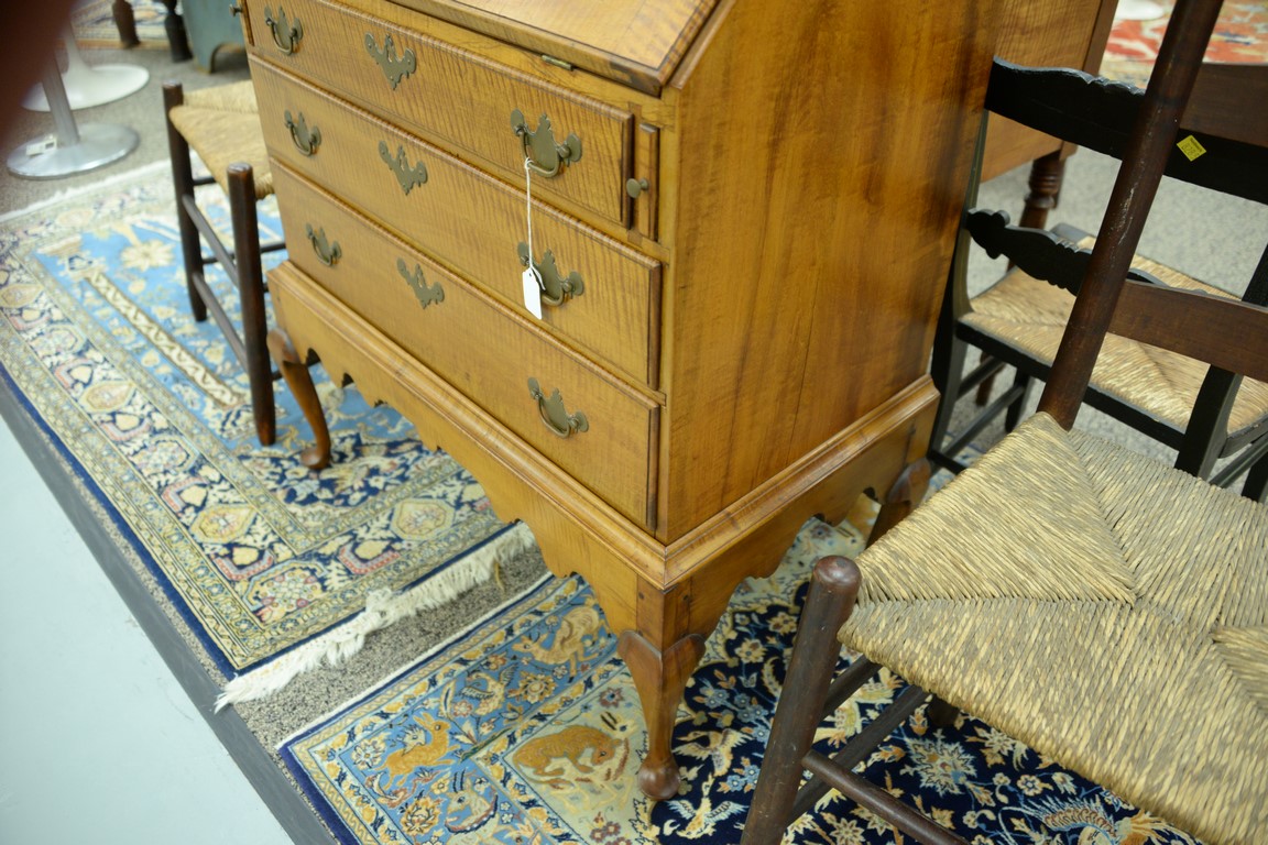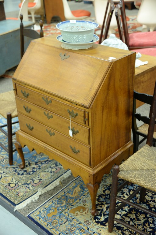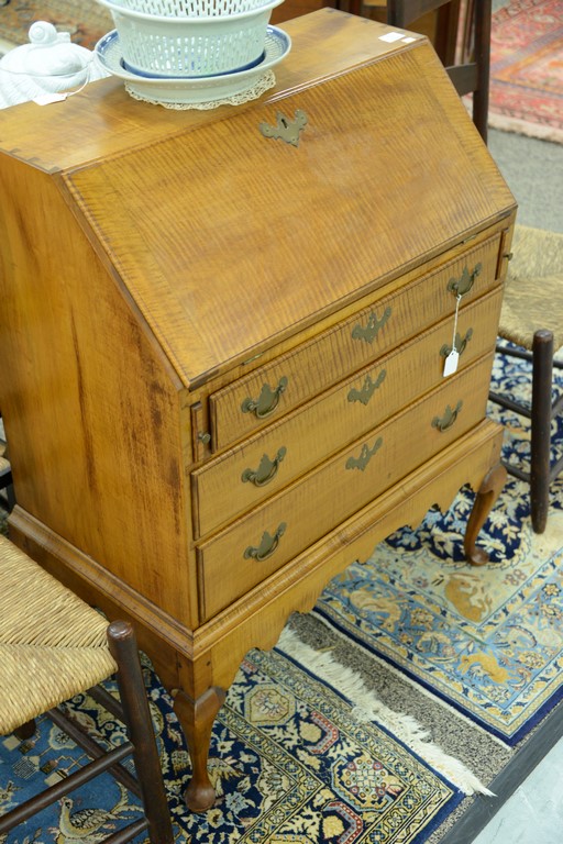 Lot 73: Diminutive Queen Anne style desk on frame having slant lid with serpentine interior over three drawers set on base with cabriole leg…