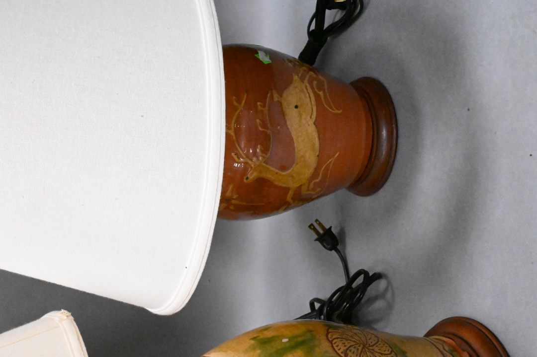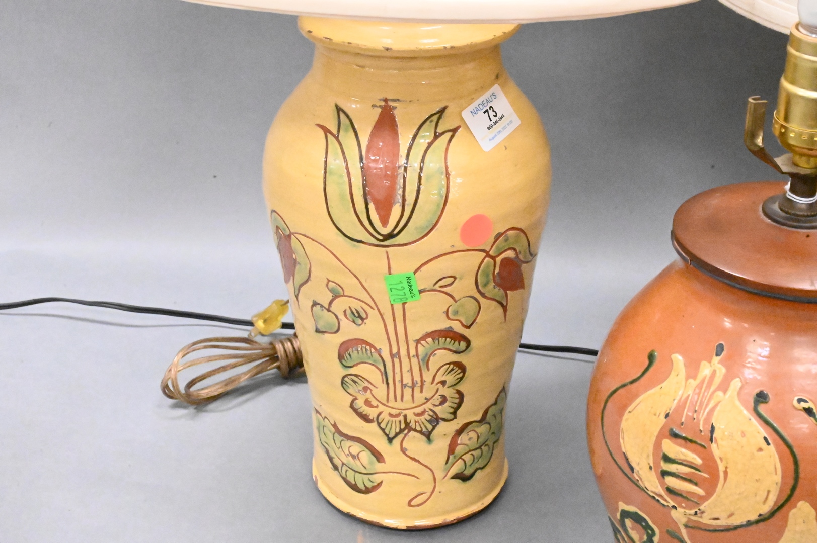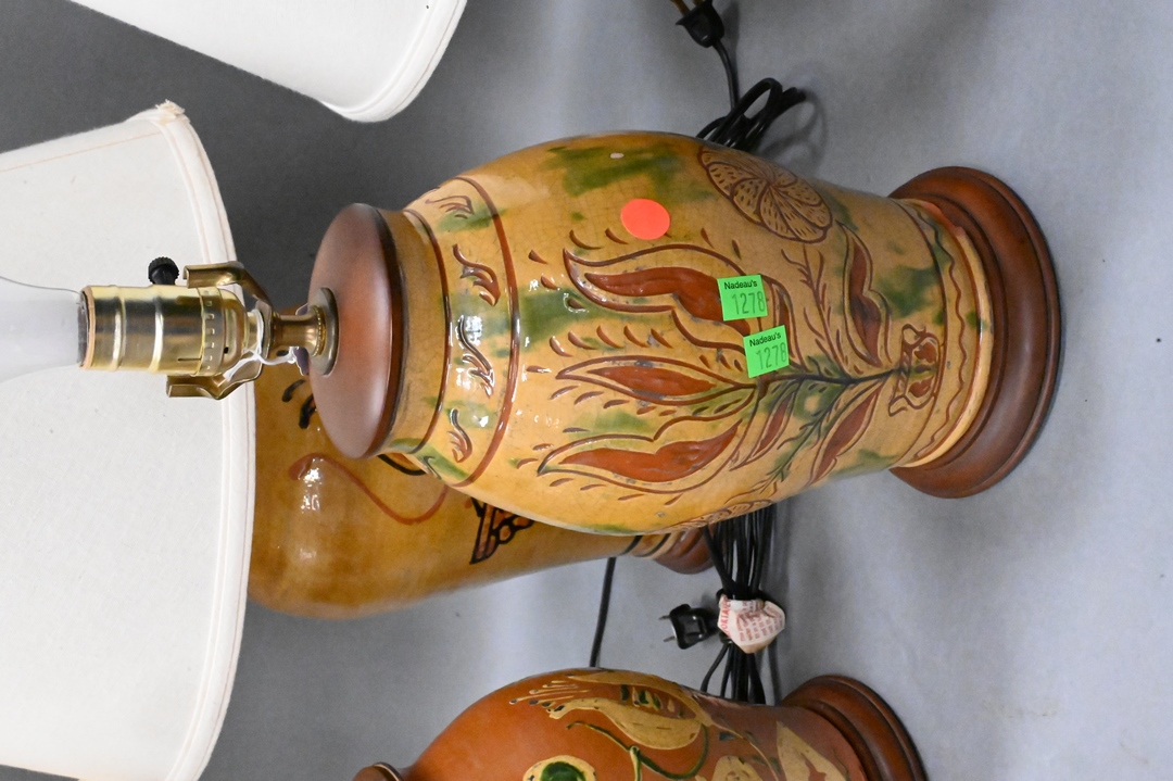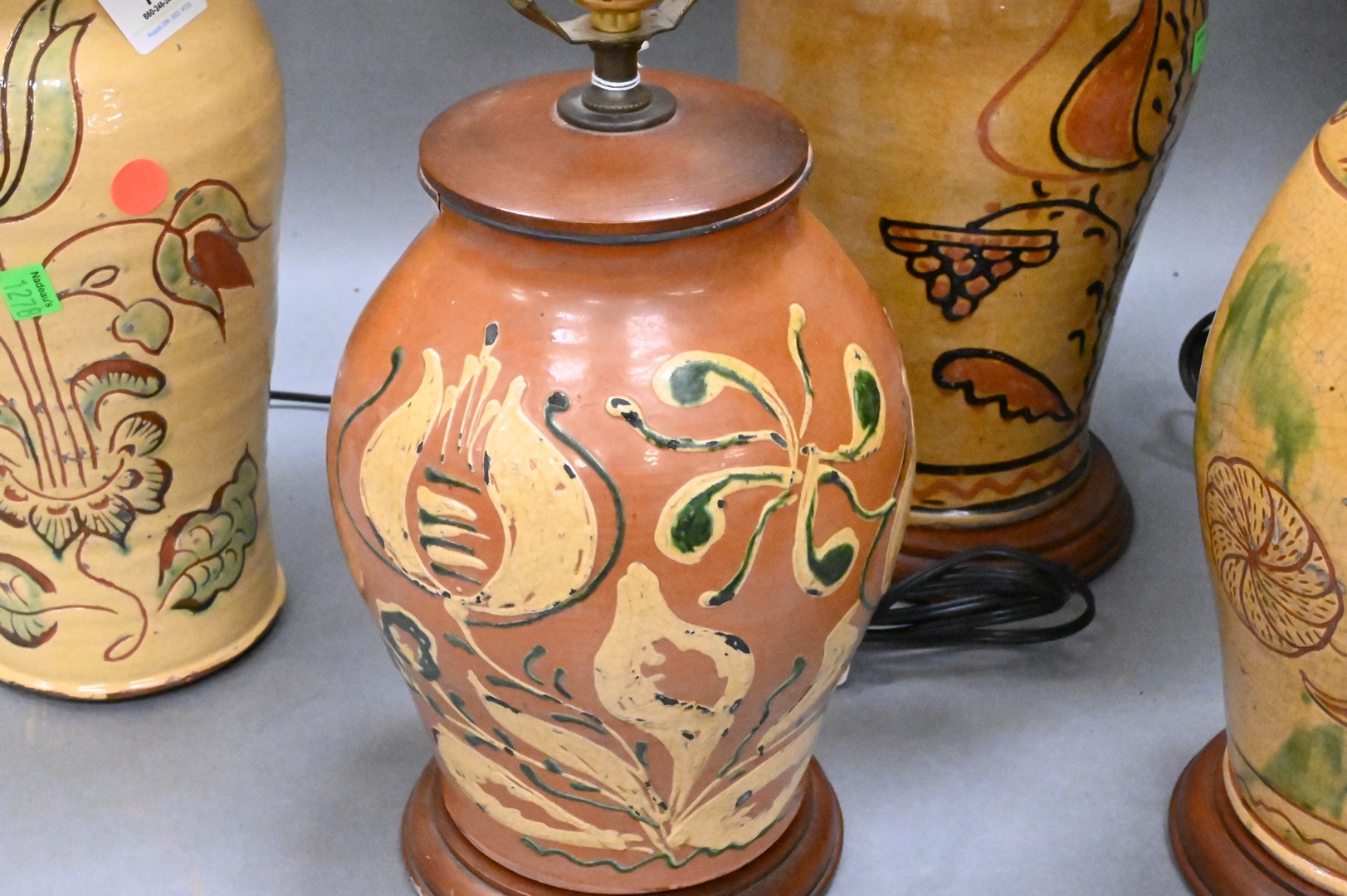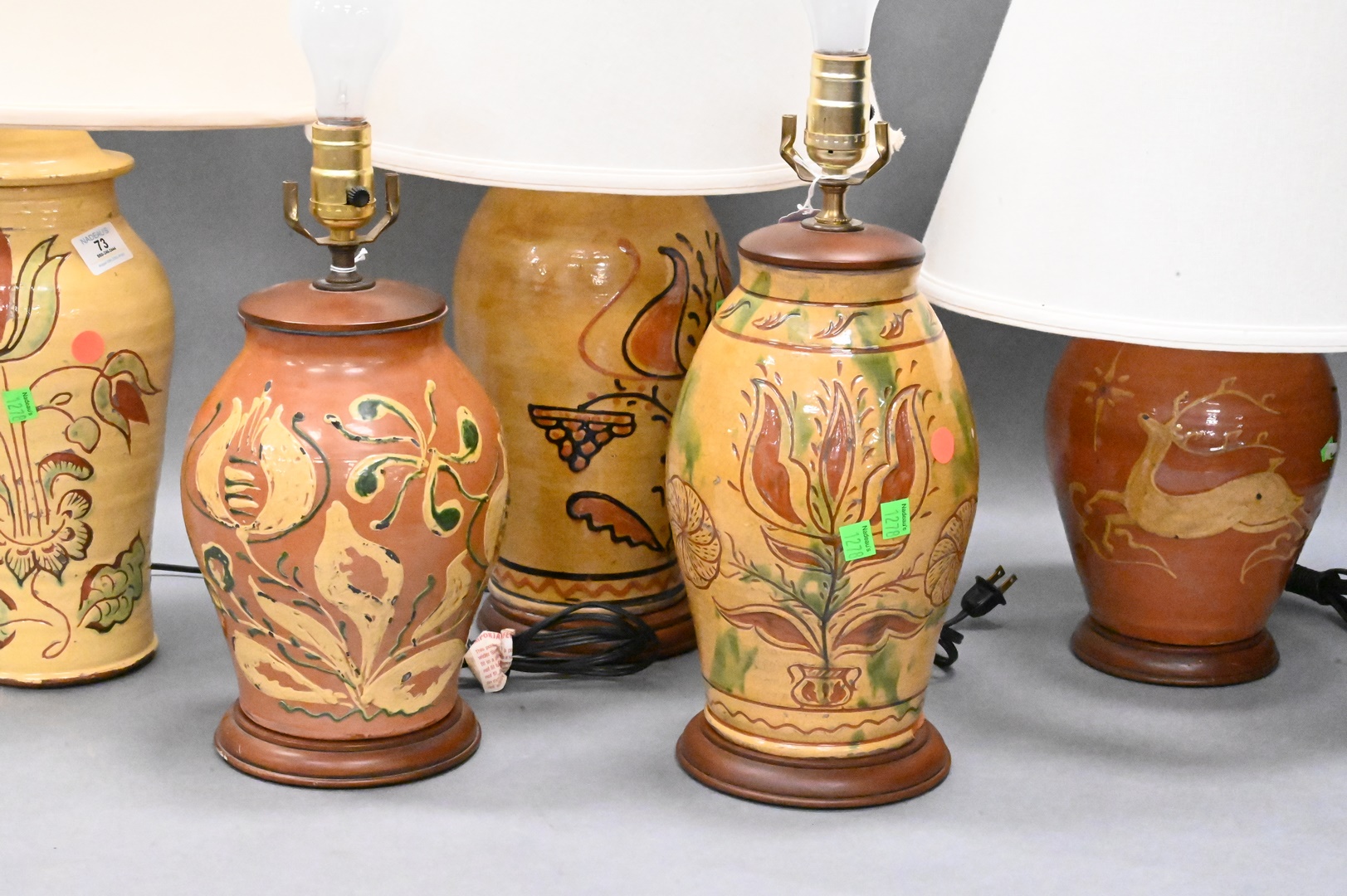 Group of Five Grey Shooner Redware Pottery Jars, made into table lamps, to include three yellow glazed, two brown glazed painted in Early American manner, all lamps signed on the side, tallest lamp height 24 inches. Provenance: Estate of Peter Tillou, Litchfield, Connecticut.