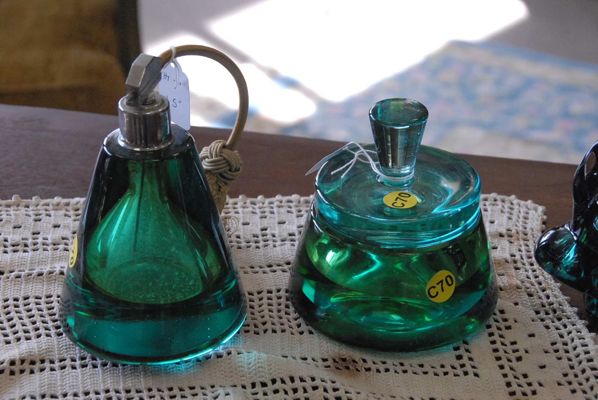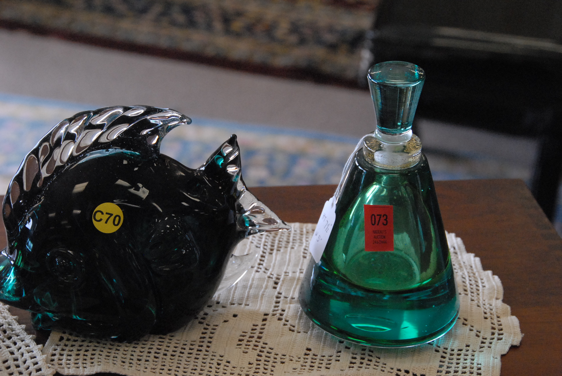 Murano glass lot including perfume with atomizer, powder jar, a fish, and cologne bottle