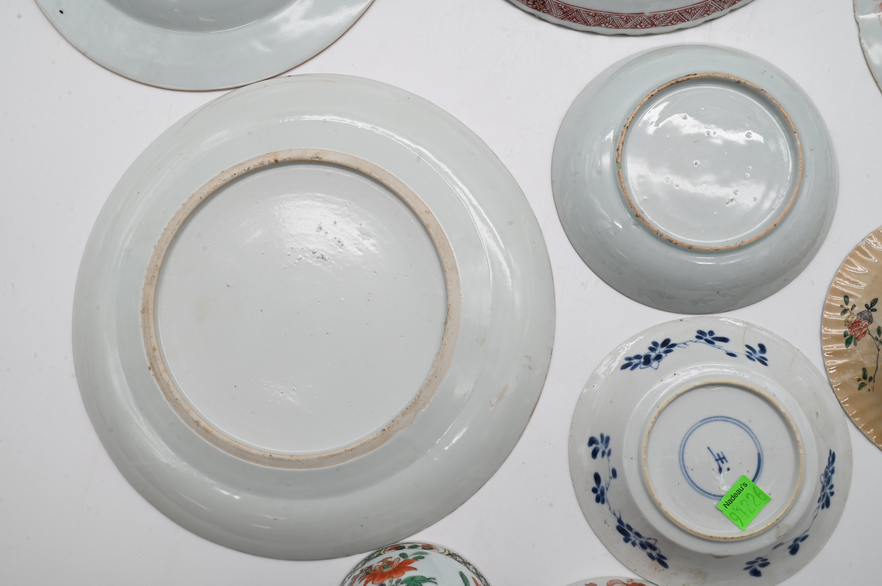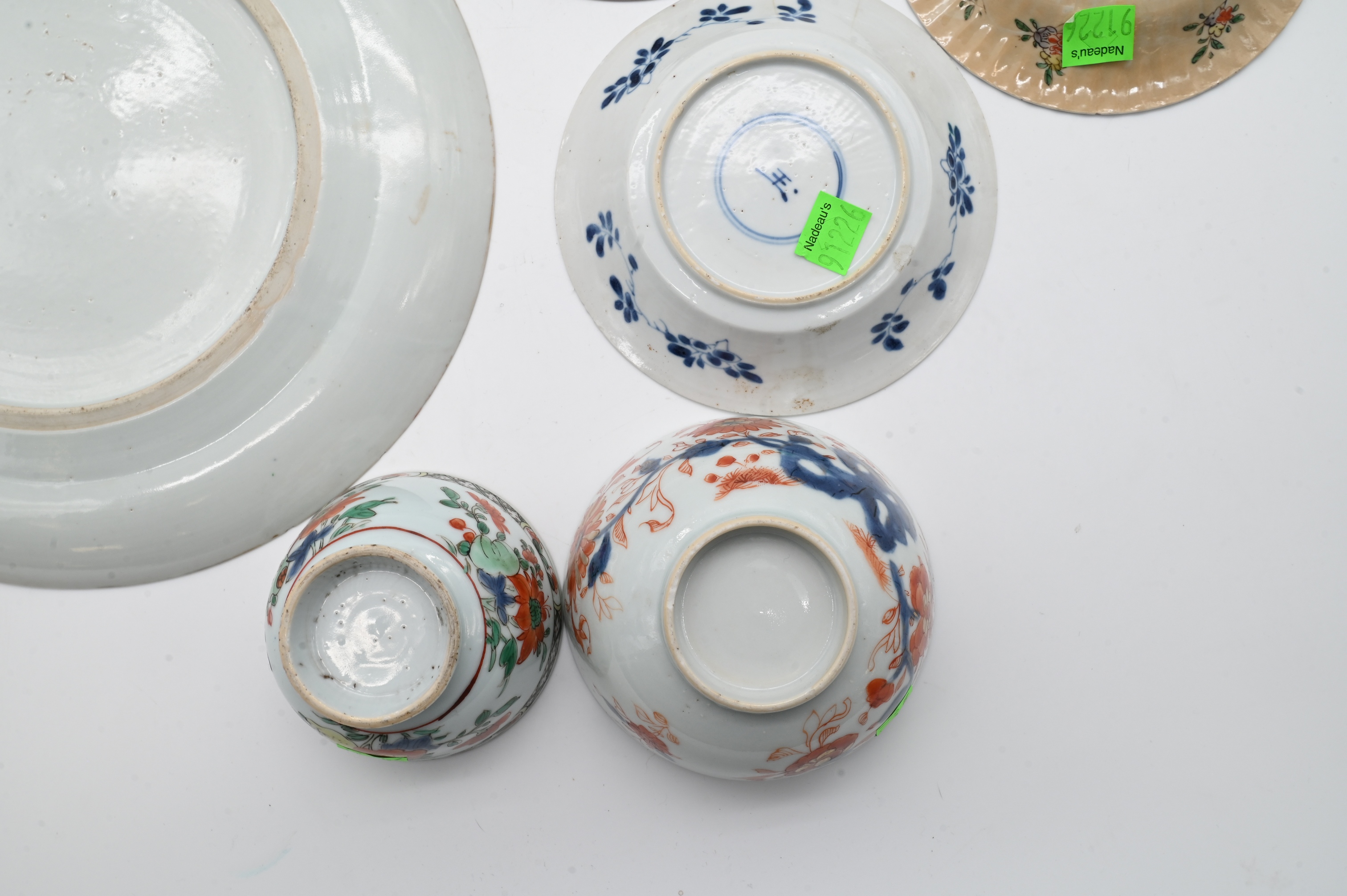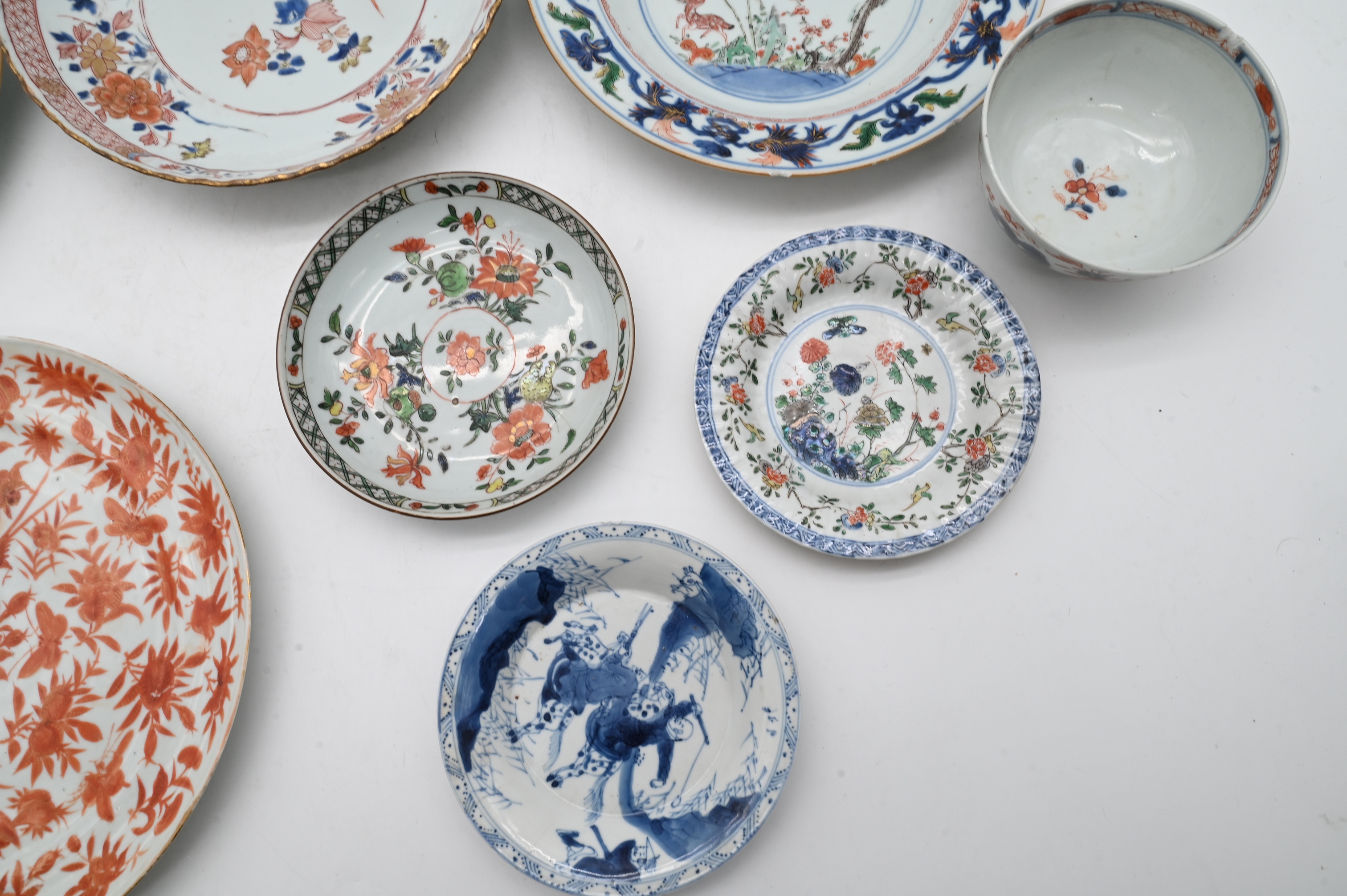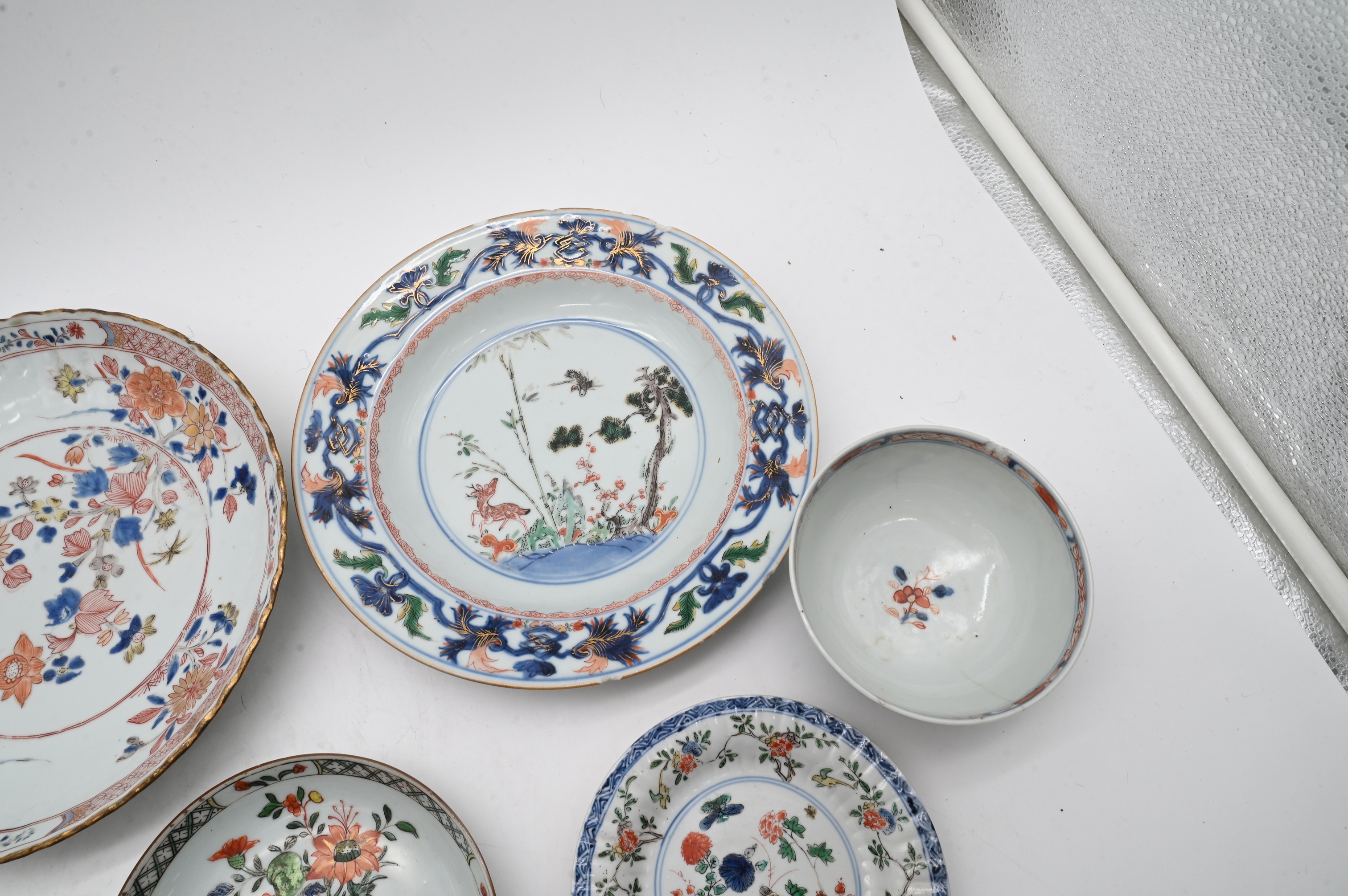 including plates, teacups, and saucers, decorated in underglaze blue and overglaze iron red and gilt in the Imari palette, together with examples in famille rose doucai and wucai-style enamels, featuring floral and foliate motifs with gilt accents, 18th century and later