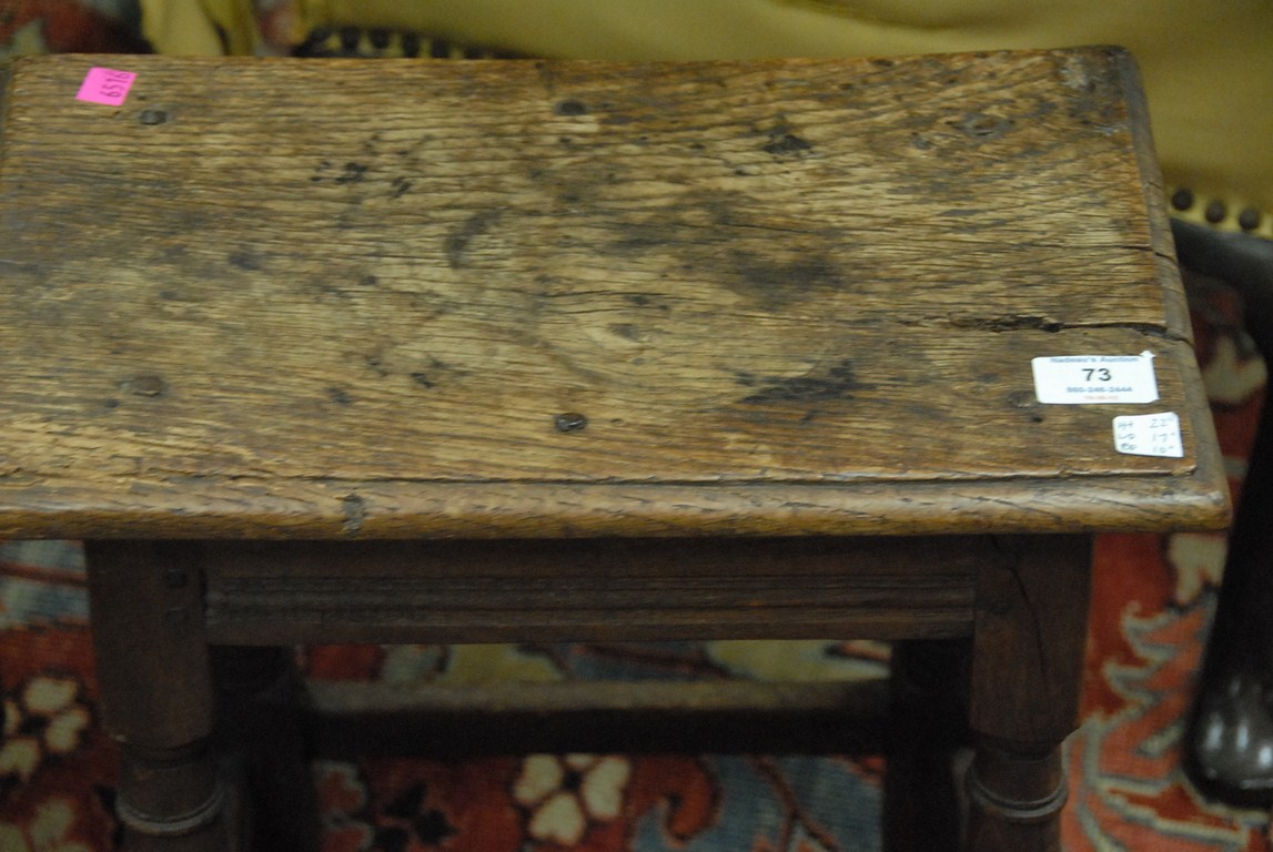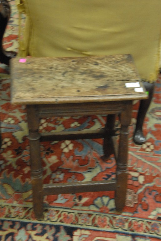 Lot 73: Oak joint stool with rectangular top on turned legs, box stretcher, and turned feet. ht. 22in. top: 10 x 17