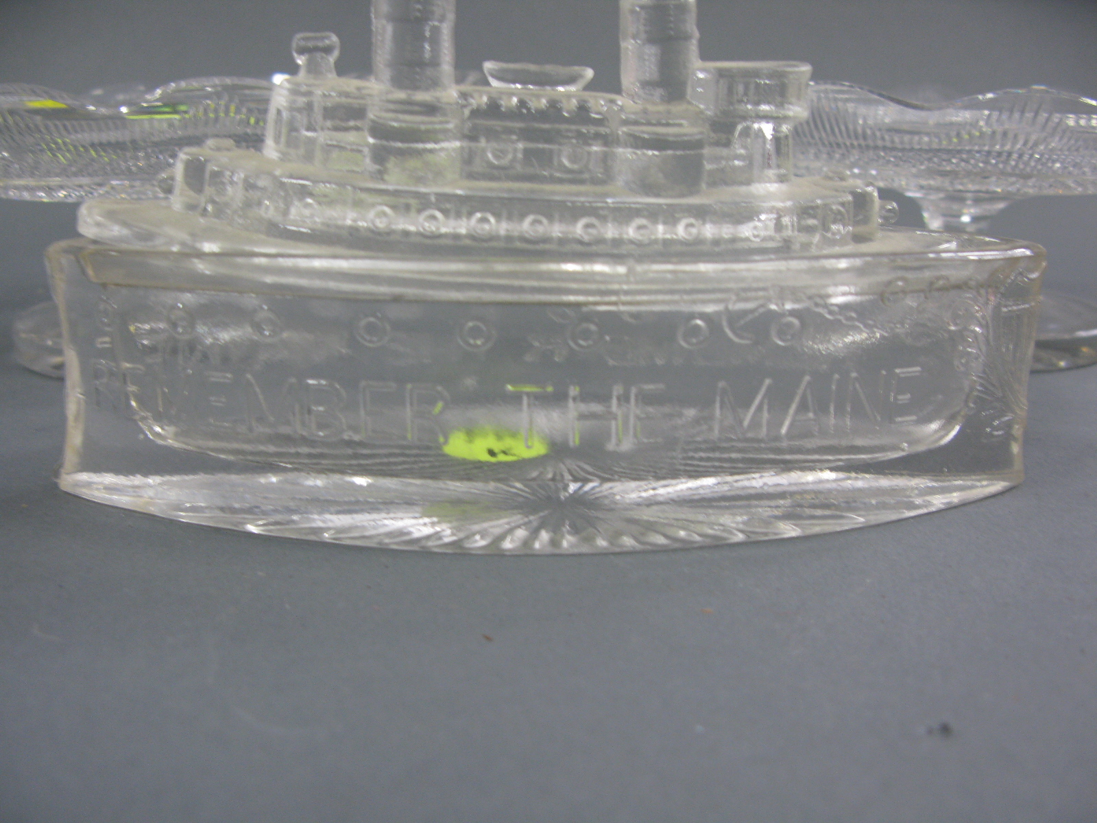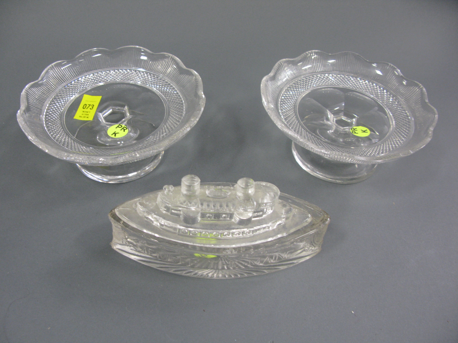 Pair of Hawk crystal compotes and early press glass candy dish remember the Maine.