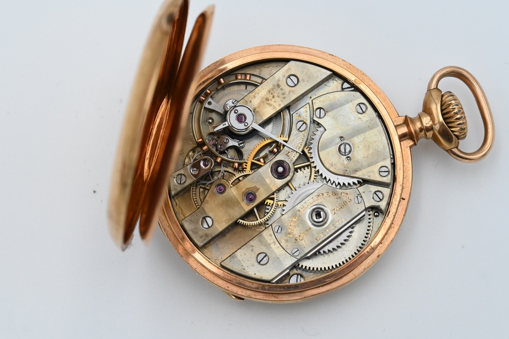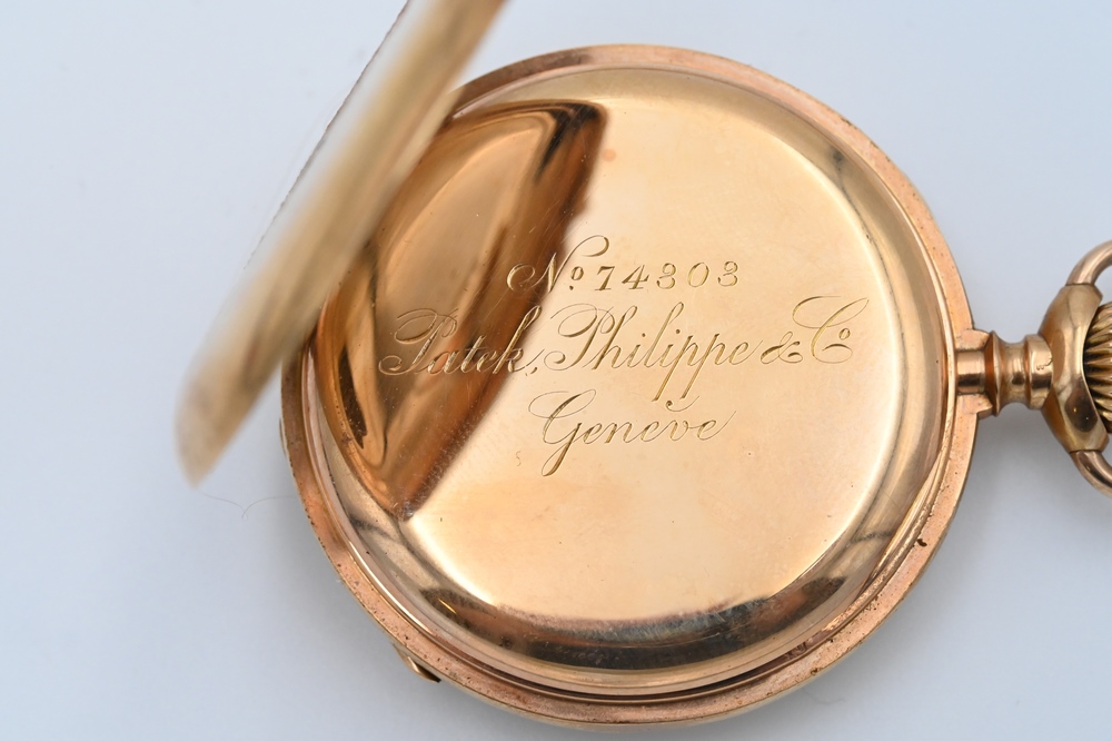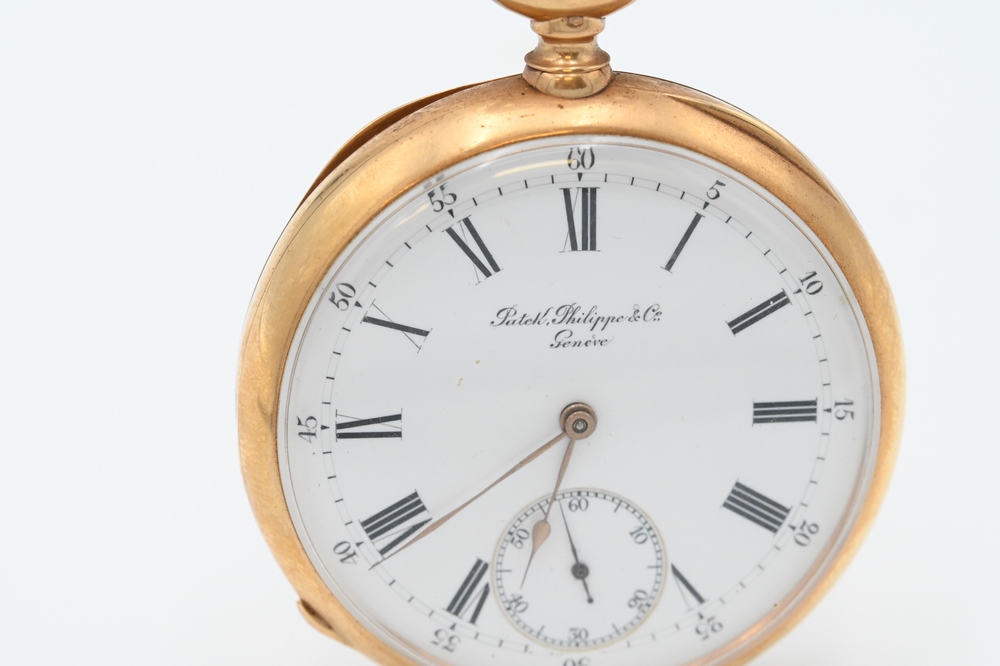 Lot 73: Patek Philippe 18 Karat Gold Pocket Watch, having second hand case and work signed Patek Philippe #74303, 48.3 millimeters, total we…