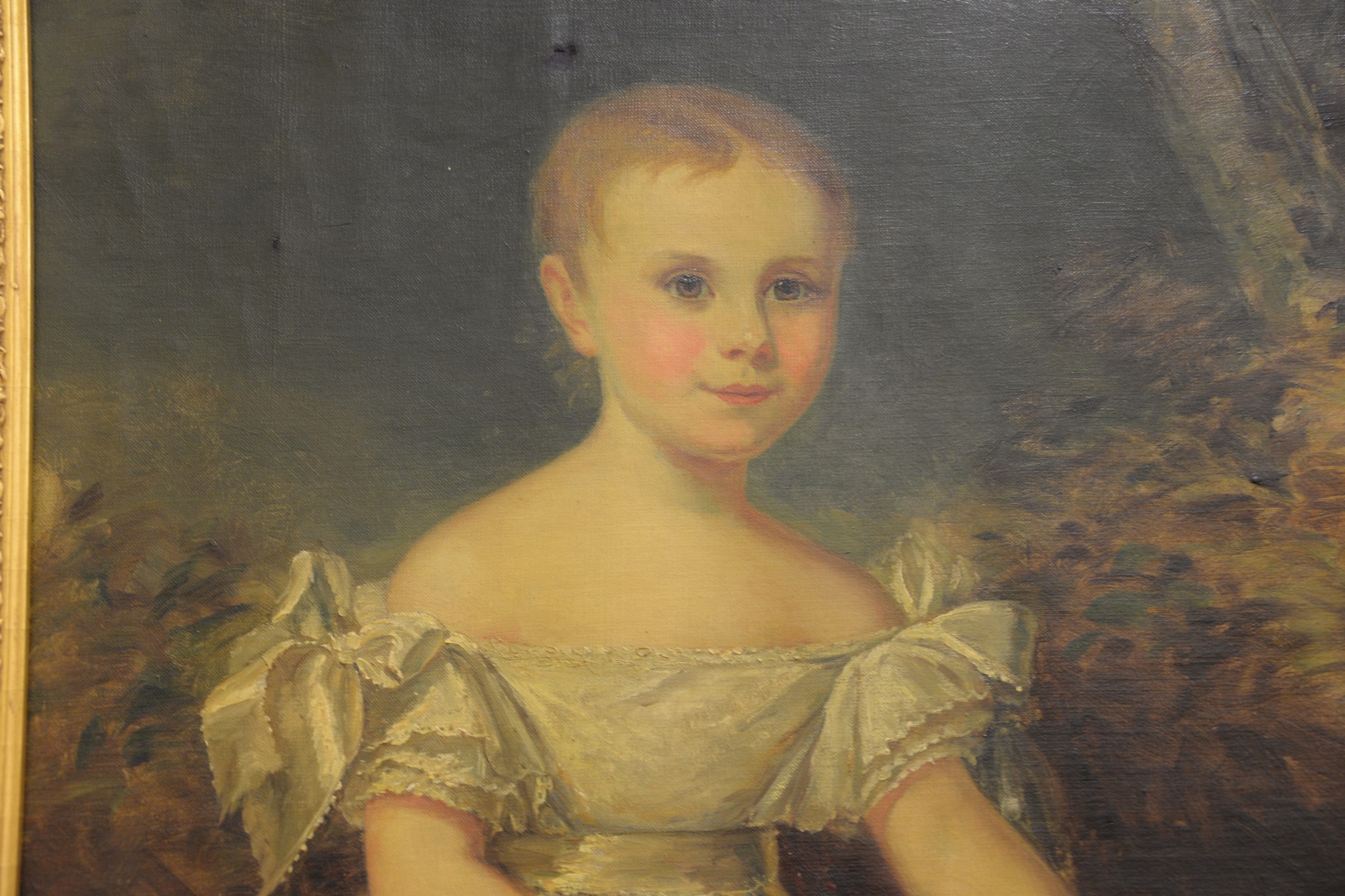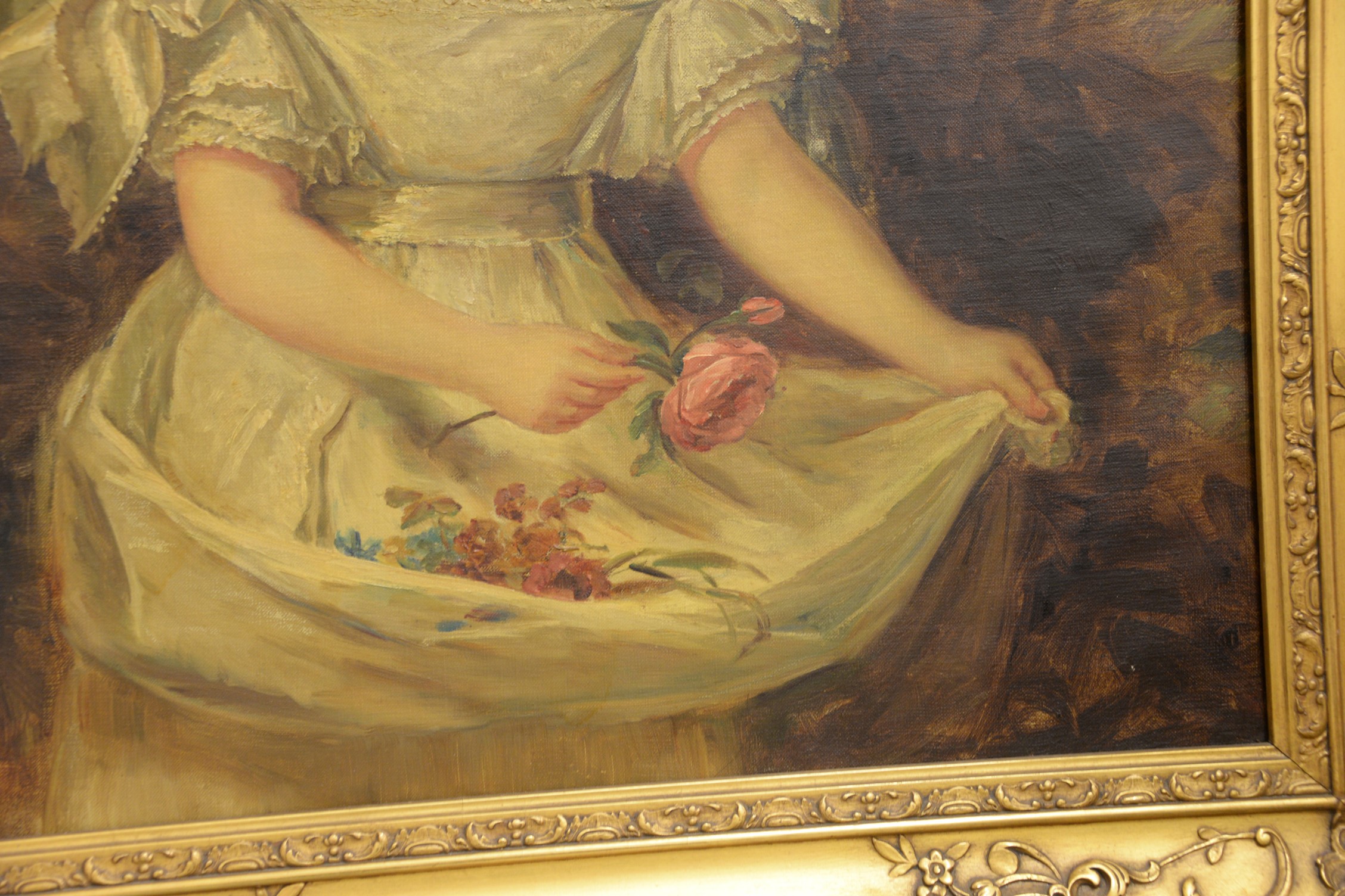 Portrait of a young girl holding a rose oil on canvas unsigned in Victorian frame 30 x 25
