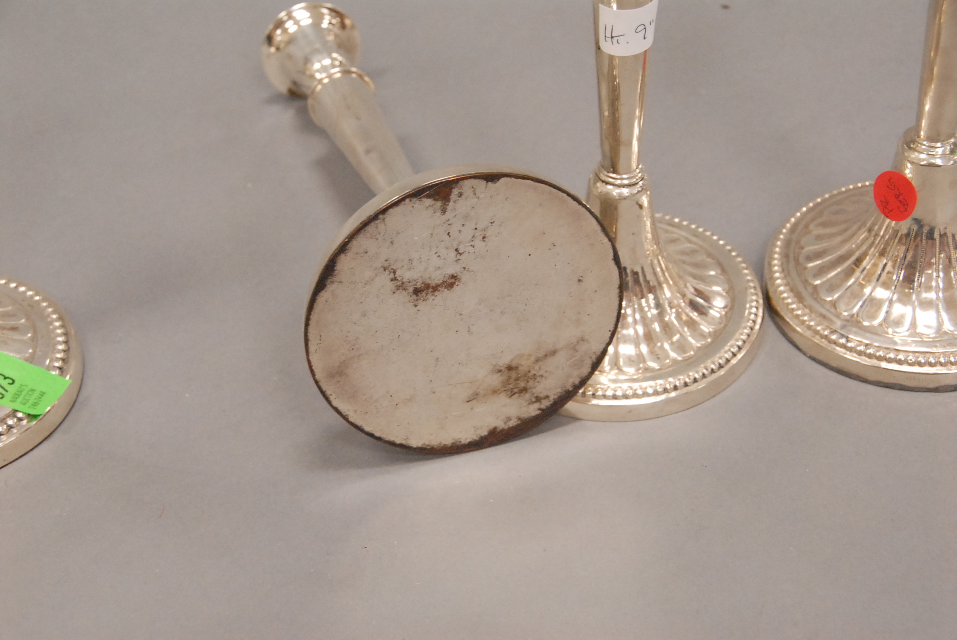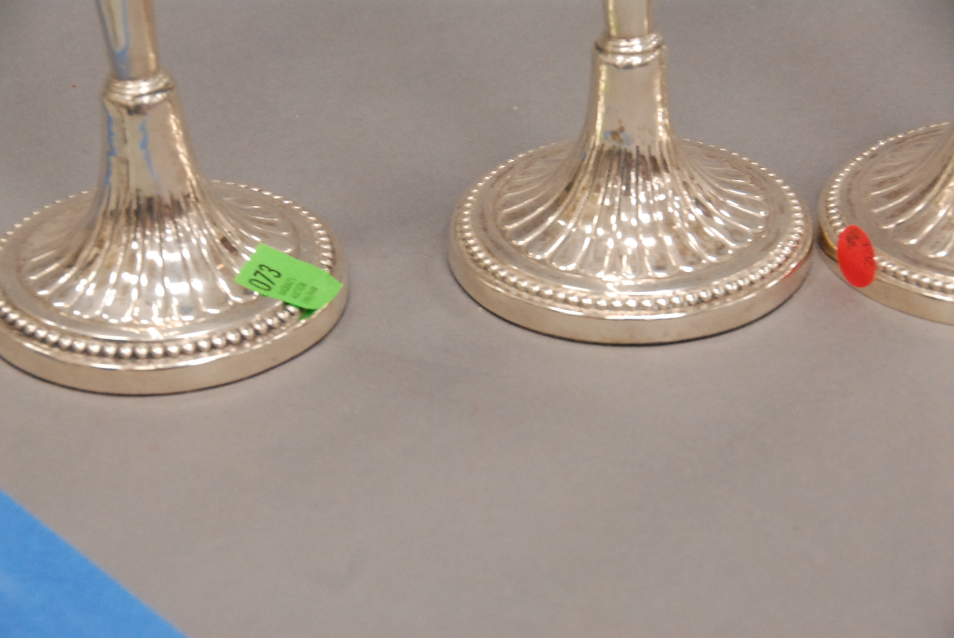 Set of four weighted silver candle sticks with drape designs on the shafts.