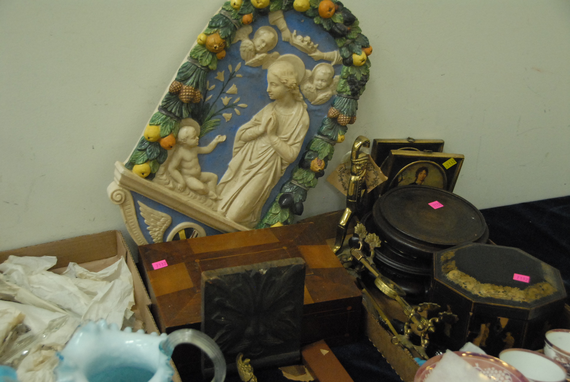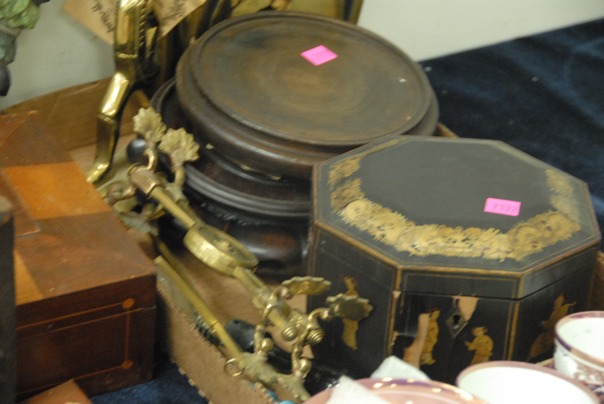 Seven boxes to include Fenton blue pitcher and covered box, Bristol glass, crystal stems, prisms, Bohemian decanters, oil lamp, pair of silverplate candlesticks, small banjo clock, humidor, Oriental box, etc.